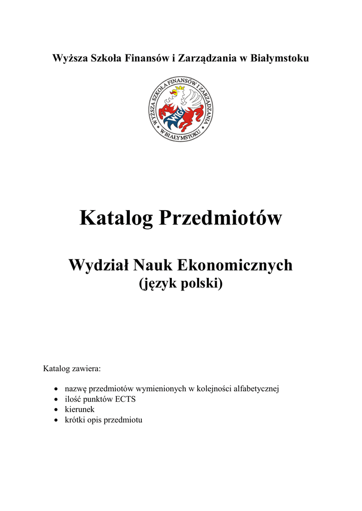 Wyższa Szkoła Finansów i Zarządzania w Białymstoku Katalog Przedmiotów Wydział Nauk Ekonomicznych (język polski) Katalog zawiera: nazwę przedmiotów wymienionych w kolejności alfabetycznej ilość punktów ECTS kierunek krótki opis przedmiotu Analiza finansowa 6 ECTS Zarządzanie, Finanse i Rachunkowość, Studenci w ramach przedmiotu poznają metody i podstawowe kierunki analizy finansowej umożliwiające dokonanie wszechstronnej oceny kondycji finansowej przedsiębiorstwa. Wstępna część zajęć poświęcona jest w szczególności nabyciu wiedzy w zakresie wstępnej analizy sprawozdań finansowych, w tym poznaniu treści ekonomicznej poszczególnych pozycji sprawozdania finansowego oraz umiejętności ich odczytywania w analizie finansowej. W dalszym etapie studenci nabywają umiejętność stosowania analizy wskaźnikowej w ocenie sytuacji finansowej przedsiębiorstwa, poznają zasady kształtowania struktury kapitałowej przedsiębiorstwa w celu maksymalizowania jego wartości, metody wyceny przedsiębiorstw, systemy wczesnego ostrzegania i sposoby oceny pogarszającej się sytuacji finansowej jednostki, a także zdobywają umiejętność analizy progu rentowności i opłacalności podejmowanych przedsięwzięć inwestycyjnych. Analiza systemów informatycznych 3 ECTS Celem zajęć jest zapoznanie studentów z problematyką analizy systemów informatycznych. Przedmiotem szczególnej uwagi na wykładach będzie przedmiot i zadania analizy systemów informatycznych, metody analizy systemów informatycznych, techniki analizy systemów informatycznych, etapy rozwoju systemów informatycznych, cykl życia systemów informatycznych. Architektura systemów komputerowych 3 ECTS Celami przedmiotu są: - zapoznanie studentów z budową i zasadami działania procesora z architekturą von Neumana wraz z wiedzą na temat uwarunkowań projektowych związanych ze stosowaną technologią oraz sposobami uzyskiwania rozwiązań optymalnych ze względu na koszt i czas działania; - zapoznanie studentów ze związkami pomiędzy architekturą procesora a realizacją rozkazów języka poziomu asemblera; - zaznajomienie studentów z wybranymi rodzajami pamięci komputera, ich budową i sposobami działania; - pokazanie sposobów współpracy komputera z urządzeniami wejścia/wyjścia. Badania marketingowe 4 ECTS Zarządzanie Zapoznanie studentów z podstawowymi kategoriami marketingowymi oraz zrozumienie istoty i zakresu podstawowych rodzajów badań marketingowych. Bankowość 6 ECTS Finanse i Rachunkowość Celem przedmiotu jest osiągnięcie umiejętności i kompetencji w zakresie: -rozumienia zasad funkcjonowania systemu bankowego; - rozumienia zasad działania instytucji centralnych regulujących sektor bankowy; - oceny wpływu sektora bankowego na sytuację makroekonomiczną; - oceny wpływu stabilności systemu finansowego na działalność bankową; - rozumienia zasad i metod zarządzania bankiem; - konstruowania oferty produktowo-usługowej; - rozumienia zasad kalkulacji instrumentów bankowych; - identyfikowania, analizowania i zarządzania ryzykiem bankowym; - oceniania sytuacji ekonomiczno-finansowej banków. Bezpieczeństwo publiczne 3 ECTS Zarządzanie Współcześnie, przy tak złożonych kwestiach dotyczących funkcjonowania państwa, sprawowanych przez niego funkcji, zaangażowania się w politykę międzynarodową, sprawy bezpieczeństwa publicznego trzeba rozstrzygać w nieco inny sposób. Obecnie, przy tak umiędzynarodowionych procesach społeczno-gospodarczych, to nie tylko domena policji i wojska (sił zbrojnych). Aby osiągnąć zadawalający społeczeństwo stan bezpieczeństwa nieodzowna jest integracja wszystkich służb, łącznie z Państwową Strażą Pożarną i Służbami Medycznymi. W konstruowanie systemu i jego funkcjonowanie muszą się włączyć władze lokalne i samorządowe. Trzeba przekonać i "przyciągnąć" ludność miejscową. Należy także stworzyć poprawnie funkcjonujący system monitorowania, ostrzegania, powiadamiania i alarmowania. Biznes Plan 4 ECTS Zarządzanie Celem nauczania jest zapoznanie studentów z teorią, metodologią i procedurą sporządzania planów biznesowych dla przedsiębiorstw i pojedynczych przedsięwzięć inwestycyjnych oraz organizacyjnych. Controlling 6 ECTS Finanse i Rachunkowość Studenci w ramach przedmiotu nabywają wiedzę umożliwiającą wykorzystanie koncepcji controllingu w zarządzaniu przedsiębiorstwem. Na podstawie modelowego przedsiębiorstwa uczą się jak zaprojektować i wdrożyć system controllingu w konkretnym przedsiębiorstwie począwszy od diagnozy sytuacji dotychczasowej i związanej z tym identyfikacji problemów, przebudowy struktury organizacyjnej firmy ukierunkowanej na wyodrębnienie ośrodków odpowiedzialności, poprzez proces budżetowania działalności poszczególnych jednostek i konsolidację planów w budżet główny rachunku wyniku, bilansu, cash flow, tworzenie systemu ocen poszczególnych centrów odpowiedzialności oraz budowę w oparciu o te plany motywacyjnych systemów wynagradzania, a skończywszy na bieżącym monitoringu osiąganych wyników, analizie odchyleń i poznawaniu sposobów reagowania na nie. Diagnostyka organizacji 3 ECTS Zarządzanie Zapoznanie z rozległą tematyką diagnozowania przedsiębiorstwa – zarówno w teorii nauk ekonomicznych jak również na przykładach praktycznych. Dowodzenie 3 ECTS Zarządzanie Istota dowodzenia – terminologia i definicje. Funkcje dowodzenia. Rola i uprawnienia dowódcy. Cykle działań zorganizowanych w procesie dowodzenia. Organizacja dowodzenia w czasie pokoju, akcji, kryzysu i wojny. Struktura systemów dowodzenia. Sztaby (zespoły funkcjonalne) w procesie dowodzenia. Procedury dowodzenia. Techniczne środki dowodzenia. Informatyczne wspomaganie procesów dowodzenia. Proces decyzyjny w dowodzeniu. Dowodzenie zespołami (zgrupowaniami) zadaniowymi w czasie akcji, operacji i walki. Dowodzenie operacyjne 4 ECTS Zarządz