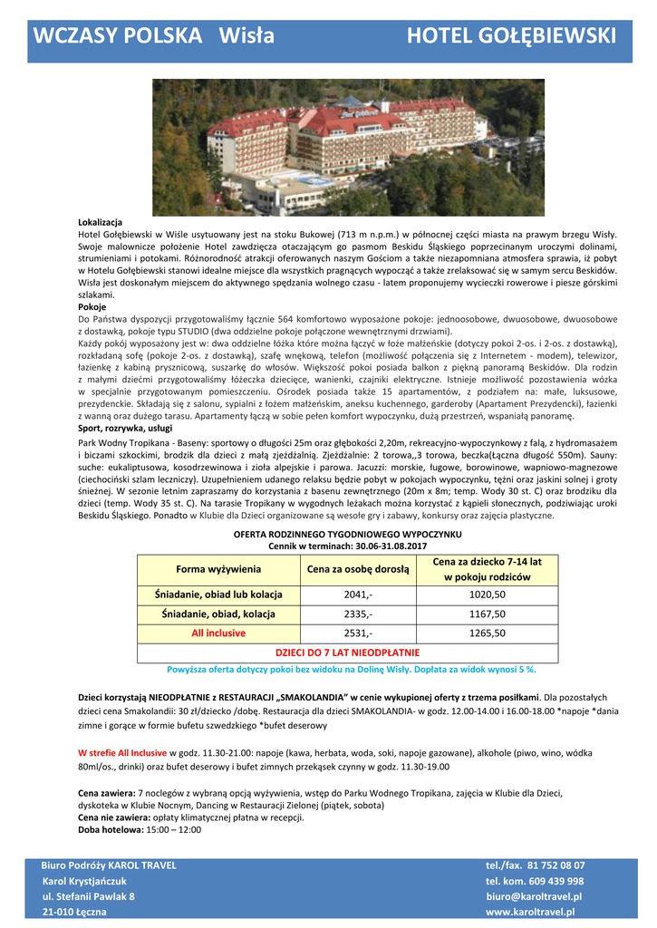 WCZASY POLSKA Wisła HOTEL GOŁĘBIEWSKI Lokalizacja Hotel Gołębiewski w Wiśle usytuowany jest na stoku Bukowej (713 m n.p.m.) w północnej części miasta na prawym brzegu Wisły. Swoje malownicze położenie Hotel zawdzięcza otaczającym go pasmom Beskidu Śląskiego poprzecinanym uroczymi dolinami, strumieniami i potokami. Różnorodność atrakcji oferowanych naszym Gościom a także niezapomniana atmosfera sprawia, iż pobyt w Hotelu Gołębiewski stanowi idealne miejsce dla wszystkich pragnących wypocząć a także zrelaksować się w samym sercu Beskidów. Wisła jest doskonałym miejscem do aktywnego spędzania wolnego czasu - latem proponujemy wycieczki rowerowe i piesze górskimi szlakami. Pokoje Do Państwa dyspozycji przygotowaliśmy łącznie 564 komfortowo wyposażone pokoje: jednoosobowe, dwuosobowe, dwuosobowe z dostawką, pokoje typu STUDIO (dwa oddzielne pokoje połączone wewnętrznymi drzwiami). Każdy pokój wyposażony jest w: dwa oddzielne łóżka które można łączyć w łoże małżeńskie (dotyczy pokoi 2-os. i 2-os. z dostawką), rozkładaną sofę (pokoje 2-os. z dostawką), szafę wnękową, telefon (możliwość połączenia się z Internetem - modem), telewizor, łazienkę z kabiną prysznicową, suszarkę do włosów. Większość pokoi posiada balkon z piękną panoramą Beskidów. Dla rodzin z małymi dziećmi przygotowaliśmy łóżeczka dziecięce, wanienki, czajniki elektryczne. Istnieje możliwość pozostawienia wózka w specjalnie przygotowanym pomieszczeniu. Ośrodek posiada także 15 apartamentów, z podziałem na: małe, luksusowe, prezydenckie. Składają się z salonu, sypialni z łożem małżeńskim, aneksu kuchennego, garderoby (Apartament Prezydencki), łazienki z wanną oraz dużego tarasu. Apartamenty łączą w sobie pełen komfort wypoczynku, dużą przestrzeń, wspaniałą panoramę. Sport, rozrywka, usługi Park Wodny Tropikana - Baseny: sportowy o długości 25m oraz głębokości 2,20m, rekreacyjno-wypoczynkowy z falą, z hydromasażem i biczami szkockimi, brodzik dla dzieci z małą zjeżdżalnią. Zjeżdżalnie: 2 torowa,,3 torowa, beczka(Łączna długość 550m). Sauny: suche: eukaliptusowa, kosodrzewinowa i zioła alpejskie i parowa. Jacuzzi: morskie, ługowe, borowinowe, wapniowo-magnezowe (ciechociński szlam leczniczy). Uzupełnieniem udanego relaksu będzie pobyt w pokojach wypoczynku, tężni oraz jaskini solnej i groty śnieżnej. W sezonie letnim zapraszamy do korzystania z basenu zewnętrznego (20m x 8m; temp. Wody 30 st. C) oraz brodziku dla dzieci (temp. Wody 35 st. C). Na tarasie Tropikany w wygodnych leżakach można korzystać z kąpieli słonecznych, podziwiając uroki Beskidu Śląskiego. Ponadto w Klubie dla Dzieci organizowane są wesołe gry i zabawy, konkursy oraz zajęcia plastyczne. OFERTA RODZINNEGO TYGODNIOWEGO WYPOCZYNKU Cennik w terminach: 30.06-31.08.2017 Forma wyżywienia Cena za osobę dorosłą Cena za dziecko 7-14 lat w pokoju rodziców Śniadanie, obiad lub kolacja 2041,- 1020,50 Śniadanie, obiad, kolacja 2335,- 1167,50 All inclusive 2531,- 1265,50 DZIECI DO 7 LAT NIEODPŁATNIE Powyższa oferta dotyczy pokoi bez widoku na Dolinę Wisły. Dopłata za widok wynosi 5 %. Dzieci korzystają NIEODPŁATNIE z RESTAURACJI „SMAKOLANDIA” w cenie wykupionej oferty z trzema posiłkami. Dla pozostałych dzieci cena Smakolandii: 30 zł/dziecko /dobę. Restauracja dla dzieci SMAKOLANDIA- w godz. 12.00-14.00 i 16.00-18.00 *napoje *dania zimne i gorące w formie bufetu szwedzkiego *bufet deserowy W strefie All Inclusive w godz. 11.30-21.00: napoje (kawa, herbata, woda, soki, napoje gazowane), alkohole (piwo, wino, wódka 80ml/os., drinki) oraz bufet deserowy i bufet zimnych przekąsek czynny w godz. 11.30-19.00 Cena zawiera: 7 noclegów z wybraną opcją wyżywienia, wstęp do Parku Wodnego Tropikana, zajęcia w Klubie dla Dzieci, dyskoteka w Klubie Nocnym, Dancing w Restauracji Zielonej (piątek, sobota) Cena nie zawiera: opłaty klimatycznej płatna w recepcji. Doba hotelowa: 15:00 – 12:00 Biuro Podróży KAROL TRAVEL Karol Krystjańczuk ul. Stefanii Pawlak 8 21-010 Łęczna tel./fax. 81 752 08 07 tel. kom. 609 439 998 [email protected] www.karoltravel.pl