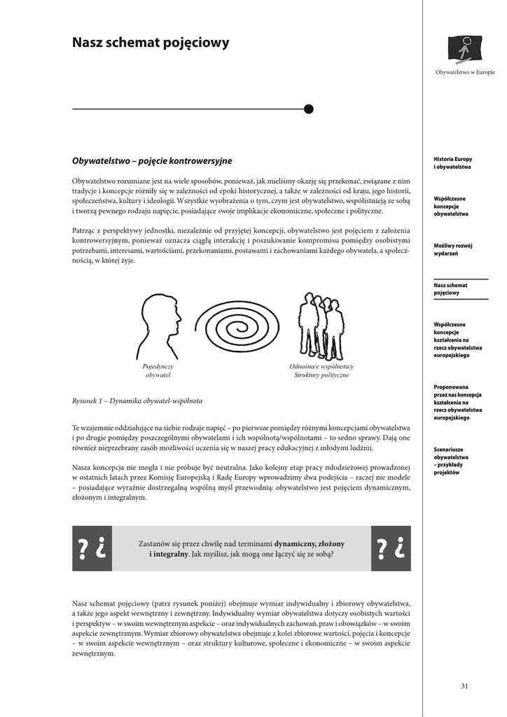 Nasz schemat pojęciowy Obywatelstwo w Europie Historia Europy i obywatelstwa Obywatelstwo – pojęcie kontrowersyjne Obywatelstwo rozumiane jest na wiele sposobów, ponieważ, jak mieliśmy okazję się przekonać, związane z nim tradycje i koncepcje różniły się w zależności od epoki historycznej, a także w zależności od kraju, jego historii, społeczeństwa, kultury i ideologii. Wszystkie wyobrażenia o tym, czym jest obywatelstwo, współistnieją ze sobą i tworzą pewnego rodzaju napięcie, posiadające swoje implikacje ekonomiczne, społeczne i polityczne. Patrząc z perspektywy jednostki, niezależnie od przyjętej koncepcji, obywatelstwo jest pojęciem z założenia kontrowersyjnym, ponieważ oznacza ciągłą interakcję i poszukiwanie kompromisu pomiędzy osobistymi potrzebami, interesami, wartościami, przekonaniami, postawami i zachowaniami każdego obywatela, a społecznością, w której żyje. Współczesne koncepcje obywatelstwa Możliwy rozwój wydarzeń Nasz schemat pojęciowy Współczesne koncepcje kształcenia na rzecz obywatelstwa europejskiego Pojedynczy obywatel Odnośna/e wspólnota/y Struktury polityczne Proponowana przez nas koncepcja kształcenia na rzecz obywatelstwa europejskiego Rysunek 1 – Dynamika obywatel-wspólnota Te wzajemnie oddziałujące na siebie rodzaje napięć – po pierwsze pomiędzy różnymi koncepcjami obywatelstwa i po drugie pomiędzy poszczególnymi obywatelami i ich wspólnotą/wspólnotami – to sedno sprawy. Dają one również nieprzebrany zasób możliwości uczenia się w naszej pracy edukacyjnej z młodymi ludźmi. Nasza koncepcja nie mogła i nie próbuje być neutralna. Jako kolejny etap pracy młodzieżowej prowadzonej w ostatnich latach przez Komisję Europejską i Radę Europy wprowadzimy dwa podejścia – raczej nie modele – posiadające wyraźnie dostrzegalną wspólną myśl przewodnią: obywatelstwo jest pojęciem dynamicznym, złożonym i integralnym. ? ? ? ? Zastanów się przez chwilę nad terminami dynamiczny, złożony i integralny. Jak myślisz, jak mogą one łączyć się ze sobą? Scenariusze obywatelstwa – przykłady projektów Nasz schemat pojęciowy (patrz rysunek poniżej) obejmuje wymiar indywidualny i zbiorowy obywatelstwa, a także jego aspekt wewnętrzny i zewnętrzny. Indywidualny wymiar obywatelstwa dotyczy osobistych wartości i perspektyw – w swoim wewnętrznym aspekcie – oraz indywidualnych zachowań, praw i obowiązków – w swoim aspekcie zewnętrznym. Wymiar zbiorowy obywatelstwa obejmuje z kolei zbiorowe wartości, pojęcia i koncepcje – w swoim aspekcie wewnętrznym – oraz struktury kulturowe, społeczne i ekonomiczne – w swoim aspekcie zewnętrznym. 31 Obywatelstwo w Europie Historia Europy i obywatelstwa Rysunek 2 – Schemat obywatelstwa Obywatelstwo Schemat pojęciowy Współczesne koncepcje obywatelstwa Współczesne koncepcje kształcenia na rzecz obywatelstwa europejskiego Proponowana przez nas koncepcja kształcenia na rzecz obywatelstwa europejskiego Scenariusze obywatelstwa – przykłady projektów Wymiar indywidualny – obywatel Osobiste wartości i perspektywy Indywidualne zachowania, prawa i obowiązki Wymiar zbiorowy – wspólnota(y) Zbiorowe wartości, pojęcia i koncepcje Struktury kulturowe, społeczne polityczne i ekonomiczne Posługując się tymi dwoma podejściami będziemy badać złożoność i dynamikę obywatelstwa. Pierwsze – cztery wymiary obywatelstwa – przyjmuje perspektywę socjologiczną, a drugie – poczucie przynależności – perspektywę osobistą. Oba stanowiska badawcze opisują interakcje pomiędzy jednostką a wspólnotą; które mają istotne znaczenie dla definicji obywatelstwa. Pierwsze wychodzi od pojęcia społeczności zbiorowej, a drugie od jednostki. Te dwa podejścia tworzą razem dwa uzupełniające się sposoby postrzegania (socjologiczny i zorientowany na jednostkę) obywatelstwa. Nie są one jedynie kompilacją różnych idei, ale oba stanowią wyraz dynamicznego, kompleksowego i integralnego sposobu pojmowania obywatelstwa. Ten sposób kształtuje także nasz schemat pojęciowy oraz podstawy koncepcji i praktyki edukacyjnej proponowane przez nas w następnych rozdziałach. Cztery wymiary: społeczne podejście do obywatelstwa. 1 W relacji pomiędzy jednostką a społeczeństwem możemy wyróżnić cztery wymiary. Korelują one z czterema podsystemami wyróżnianymi w społeczeństwie: wymiar polityczny/prawny, wymiar społeczny, wymiar kulturowy i wymiar ekonomiczny. ? ? Nasz schemat pojęciowy Aspekt zewnętrzny Kiedy czytasz opisy tych czterech wymiarów, zastanów się, w jakim stopniu każdy z nich znajduje swoje odzwierciedlenie w tobie? W jakim stopniu rozwinięte jest twoje obywatelstwo w każdym z tych wymiarów? ? ? Możliwy rozwój wydarzeń Aspekt wewnętrzny Rysunek 3 – Cztery wymiary obywatelstwa Obywatelstwo Wymiar polityczny Wymiar społeczny Wymiar kulturowy Wymiar ekonomiczny 1 Cztery wymiary obywatelstwa zostały opracowane przez Ruuda Veldhuis w publikacji „Education for Democratic Citizenship: Dimensions of Citizenship, Core Competencies, Variables and International Activities”, Strasbourg, Rada Europy, 1997, dokument DECS/CIT (97) 23. 32 Obywatelstwo w Europie Wymiar polityczny Polityczny wymiar obywatelstwa odnosi się do praw i obowiązków politycznych. Rozwijanie go powinno następować poprzez zdobywanie wiedzy o systemie politycznym oraz upowszechnianie postaw demokratycznych i umiejętności zaangażowania społecznego. Polityczny wymiar obywatelstwa może być promowany poprzez podnoszenie świadomości i edukację dotyczącą, np: – pojęć związanych z demokracją, – znajomości struktur politycznych i procesów decyzyjnych na płaszczyźnie narodowej i międzynarodowej/europejskiej, – systemów wyborczych, – partii politycznych, – grup lobbingowych, – uczestnictwa politycznego i innych form uczestnictwa (np. demonstracji, pisania pism do prasy), – hist