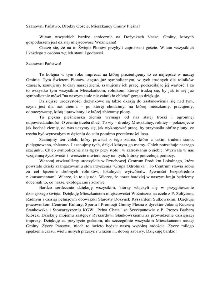 Szanowni Państwo, Drodzy Goście, Mieszkańcy Gminy Pleśna! Witam wszystkich bardzo serdecznie na Dożynkach Naszej Gminy, których gospodarzem jest dzisiaj miejscowość Woźniczna! Cieszę się, że na to Święto Plonów przybyli zaproszeni goście. Witam wszystkich i każdego z osobna wg ich stanu i godności. Szanowni Państwo! To kolejna w tym roku impreza, na której prezentujemy to co najlepsze w naszej Gminie. Tym Świętem Plonów, często już symbolicznym, w tych trudnych dla rolników czasach, szanujemy te dary naszej ziemi, szanujemy ich pracę, podkreślając jej wartość. I za to wszystko tym wszystkim Mieszkańcom, rolnikom, którzy trudzą się, by jak to się już symbolicznie mówi "na naszym stole nie zabrakło chleba" gorąco dziękuję. Dzisiejsze uroczystości dożynkowe są także okazją do zastanowienia się nad tym, czym jest dla nas ziemia – po której chodzimy, na której mieszkamy, pracujemy, odpoczywamy, którą uprawiamy i z której zbieramy plony. Ta piękna pleśnieńska ziemia wymaga od nas stałej troski i ogromnej odpowiedzialności. O ziemię trzeba dbać. To wy – drodzy Mieszkańcy, rolnicy – pokazujecie jak kochać ziemię, od was uczymy się, jak wykonywać pracę, by przynosiła obfite plony, że trzeba być wytrwałym w dążeniu do celu pomimo przeciwności losu. Szanujmy ten chleb, który powstał z tego ziarna, które z takim trudem siano, pielęgnowano, zbierano. I szanujmy tych, dzięki którym go mamy. Chleb potrzebuje naszego szacunku. Chleb symbolicznie nas łączy przy stole i w zatroskaniu o siebie. Wyzwala w nas wzajemną życzliwość i wreszcie otwiera oczy na tych, którzy potrzebują pomocy. Wczoraj otwieraliśmy uroczyście w Rzuchowej Centrum Produktu Lokalnego, które powstało dzięki zaangażowaniu stowarzyszenia "Grupa Odrolnika". To Centrum stawia sobie za cel łączenie drobnych rolników, lokalnych wytwórców żywności bezpośrednio z konsumentami. Wierzę, że to się uda. Wierzę, że coraz bardziej w naszym kraju będziemy doceniali to, co nasze, ekologiczne i zdrowe. Bardzo serdecznie dziękuję wszystkim, którzy włączyli się w przygotowanie dzisiejszego święta. Dziękuję Mieszkańcom miejscowości Woźniczna na czele z P. Sołtysem, Radnym i dzisiaj pełniącym obowiązki Starosty Dożynek Ryszardem Sutkowskim. Dziękuję pracownikom Centrum Kultury, Sportu i Promocji Gminy Pleśna z dyrektor Jolantą Kuczerą Stankowską i Stowarzyszeniu KGW „Pełna Chata” ze Szczepanowic z P. Prezes Barbarą Kłósek. Dziękuję mojemu zastępcy Ryszardowi Stankowskiemu za prowadzenie dzisiejszej imprezy. Dziękuję za przybycie gościom, ale szczególnie wszystkim Mieszkańcom naszej Gminy. Życzę Państwu, niech to święto będzie naszą wspólną radością. Życzę miłego spędzenia czasu, wielu miłych przeżyć i wrażeń i... dobrej zabawy. Dziękuję bardzo!