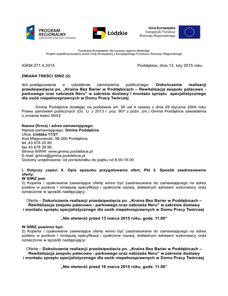 Fundusze Europejskie dla rozwoju regionu łódzkiego Projekt współfinansowany przez Unię Europejską z Europejskiego Funduszu Rozwoju Regionalnego IGKM.271.4.2015 Poddębice, dnia 13 luty 2015 roku ZMIANA TREŚCI SIWZ (2) dot.:postępowania o udzielenie zamówienia publicznego: Dokończenie realizacji przedsięwzięcia pn. „Kraina Bez Barier w Poddębicach – Rewitalizacja zespołu pałacowo parkowego oraz nabrzeża Neru” w zakresie dostawy i montażu sprzętu specjalistycznego dla osób niepełnosprawnych w Domu Pracy Twórczej Gmina Poddębice działając na podstawie art. 38 ust 4 ustawy z dnia 29 stycznia 2004 roku Prawo zamówień publicznych (Dz. U. z 2013 r. poz. 907 z późn. zm.) Gmina Poddębice zawiadamia o zmianie treści SIWZ Nazwa (firma) i adres zamawiającego: Nazwa zamawiającego: Gmina Poddębice Ulica: Łódzka 17/21 Kod Miejscowość: 99-200 Poddębice tel ,43 678 25 80 fax 43 678 39 95 Strona WWW: www.gmina.poddebice.pl E-mail: [email protected] Godziny urzędowania: od poniedziałku do piątku od 8.00-16.00 I. Dotyczy części X. Opis sposobu przygotowania ofert, Pkt 3. Sposób zaadresowania oferty: W SIWZ jest: 2) Koperta / opakowanie zawierające ofertę winno być zaadresowane do zamawiającego na adres podany w punkcie I niniejszej specyfikacji i opatrzone nazwą, dokładnym adresem wykonawcy oraz oznaczone w sposób następujący: Oferta – Dokończenie realizacji przedsięwzięcia pn. „Kraina Bez Barier w Poddębicach – Rewitalizacja zespołu pałacowo - parkowego oraz nabrzeża Neru” w zakresie dostawy i montażu sprzętu specjalistycznego dla osób niepełnosprawnych w Domu Pracy Twórczej „Nie otwierać przed 13 marca 2015 roku, godz. 11.00” W SIWZ powinno być: 2) Koperta / opakowanie zawierające ofertę winno być zaadresowane do zamawiającego na adres podany w punkcie I niniejszej specyfikacji i opatrzone nazwą, dokładnym adresem wykonawcy oraz oznaczone w sposób następujący: Oferta – Dokończenie realizacji przedsięwzięcia pn. „Kraina Bez Barier w Poddębicach – Rewitalizacja zespołu pałacowo - parkowego oraz nabrzeża Neru” w zakresie dostawy i montażu sprzętu specjalistycznego dla osób niepełnosprawnych w Domu Pracy Twórczej „Nie otwierać przed 16 marca 2015 roku, godz. 11.00” II. Dotyczy części XI. Miejsce i termin składania i otwarcia ofert. W SIWZ jest: XI. Miejsce i termin składania i otwarcia ofert. 1. Oferty należy składać do dnia: 13 marca 2015 r. do godz. 10:45 w siedzibie zamawiającego: Urząd Miejski w Poddębicach ul. Łódzka 17/21 99-200 Poddębice Pokój nr: 116 2.Oferty zostaną otwarte dnia: 13 marca 2015 r. o godz. 11:00 w siedzibie zamawiającego Urząd Miejski w Poddębicach ul. Łódzka 17/21 99-200 Poddębice Pokój nr: 201 W SIWZ powinno być: XI. Miejsce i termin składania i otwarcia ofert. 1. Oferty należy składać do dnia: 16 marca 2015 r. do godz. 10:45 w siedzibie zamawiającego: Urząd Miejski w Poddębicach ul. Łódzka 17/21 99-200 Poddębice Pokój nr: 116 2.Oferty zostaną otwarte dnia: 16 marca 2015 r. o godz. 11:00 w siedzibie zamawiającego Urząd Miejski w Poddębicach ul. Łódzka 17/21 99-200 Poddębice Pokój nr: 201 III. Dotyczy części III. Opis przedmiotu zamówienia - Kody Wspólnego Słownika Zamówień. W SIWZ jest: Kody Wspólnego Słownika Zamówień: 33.19.62.00-2 33.19.31.20-6 30.23.74.60-1 30.23.45.00-3 31.52.10.00-4 30.23.21.10-8 30.19.10.00-4 32.34.24.00-6 32.34.00.00-8 30.19.50.00-2 38.65.10.00-3 37.31.00.00-4 30.21.31.00-6 30.21.33.00-8 38.65.21.00-1 30.23.13.20-6 W SIWZ powinno być: Kody Wspólnego Słownika Zamówień: 33.19.62.00-2 33.19.31.20-6 30.23.74.60-1 30.23.45.00-3 31.52.10.00-4 30.23.21.10-8 30.19.10.00-4 32.34.24.00-6 32.34.10.00-5 30.19.50.00-2 38.65.10.00-3 37.31.00.00-4 30.21.31.00-6 30.21.33.00-8 38.65.21.00-1 30.23.13.20-6 IV. Dotyczy załącznik nr 7 do SIWZ Opis przedmiotu zamówienia. W załączniku Nr 7 Opis przedmiotu zamówienia jest: 13. Urządzenie czytające dowolny tekst drukowany (głosem syntetycznym) 3 szt. Urządzenie do czytania pisma drukowanego głosem syntetycznym, odczytuje automatycznie dowolny tekst drukowany położony na szybie skanera, odczytuje pismo drukowane oraz dokumenty zapisane w pamięci wewnętrznej urządzenia (buforze), nośniku zewnętrznym tj. CD, pendrive, wbudowane syntezatory języka polskiego i angielskiego, wbudowany program do rozpoznawania tekstu OCR, funkcja multimedialna umożliwia odczyt poczty elektronicznej, stron WWW, kanałów RSS, radia internetowego, wbudowany odtwarzacz CD i MP3, obudowa zintegrowana zawierająca w komplecie: komputer — jednostkę sterującą, skaner, wewnętrzne głośniki, nagrywarkę DVD-RW i klawiaturę, klawiatura: klawiatura brajlowska, wbudowana w panel przedni obudowy, po naciśnięciu każdego z klawiszy syntezator głośno odczytuje komendę, która jest z nim związana, urządzenie umożliwia zapisanie przetworzonego tekstu w pamięci wewnętrznej np. na dysku twardym komputera lub na nośnikach zewnętrznych, uruchamianie urządzenia: urządzenie musi być gotowe do pracy od razu po podłączeniu do zasilania, do obsługi urządzenia nie jest wymagana znajomość obsługi komputera, urządzenie umożliwia odczytywanie zapisywanego tekstu w formacie txt i PDF z nośników zewnętrznych lub wewnętrznego dysku twardego, możliwość podłączenia zewnętrznych głośników, słuchawek, klawiatury, myszy, monitora, parametry techniczne urządzenia: średni czas rozpoznania pierwszego zdania - nie więcej niż 20s od zakończenia skanowania, czas skanowania: nie dłużej niż 47s, możliwość podłączenia zewnętrznych słuchawek, możliwość skanowania czasopism, książek, tekstów większego formatu przekraczających gabaryty urządzenia (skanera) -dodatkowa półka, możliwość podłączenia zewnętrznej klawiatury, myszy, monitora, wbudowane złącza: port USB, RJ-45,PS/2 w zestawie jest klawiatura brajlowska umożliwiająca bezprze