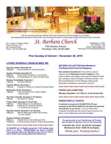 The first Sunday of Advent symbolizes Hope with the Prophet’s Candle reminding us that Jesus is coming. We are a welcoming Roman Catholic Parish that cherishes the Polish heritage of our founders and celebrates the diversity of all who enter, thus striving to give glory to God through worship and service to the community. St. Barbara Church Rev. Joseph T. Hilinski, Pastor Phone: 216 661-1191 Rev. Andrzej Panek Phone: 216 704-5080 (cell) 1505 Denison Avenue Cleveland, Ohio 44109-2890 Established in 1905 Fax: 216 661-1148 Email: [email protected] www.tinyurl.com/st-barbaracleveland First Sunday of Advent – November 30, 2014 LITURGY SCHEDULE / ROZKLAD MSZY SW. Saturday, Sobota, November 29 4:30 p.m. † Leo Kucharski int. Evelyn Kucharski Sunday, Niedziela, November 30 9:00 a.m. † Mary Molek Pechatski int. Jack Squirek 11:00 a.m. † Andrzej Rapacz int. Zofia & Andrzej Rubis Monday, Poniedziałek, December 1 7:30 a.m. † All Souls (Gillock) Tuesday, Wtorek, December 2 7:30 a.m. † Joseph A. Hilinski int. Renata & Gertraud Sliwka SECOND COLLECTION Next Weekend: The Retirement Fund for Religious Next weekend, December 6-7, there will be a special collection for the Retirement Fund for Religious. Often sisters, brothers, and religious order priests ministered for little pay, resulting in today’s shortage of retirement savings. Your gift to the Retirement Fund for Religious helps provide prescription medications, nursing care, and more. Wednesday, Środa, December 3 7:30 a.m. † Jerome Budzinski int. Loretta, Debbie, Gary & Cindy PARISH GUILD MEETING Thursday, Czwartek, December 4, St. Barbara 730 a.m. † All Souls (G. Sliwka) Friday, Piątek, December 5, First Friday 7:30 a.m. † Betty Babets int. Donald Babets 5:30 p.m. † Stanislaw & † Kazimierz Rusiecki int. Teresa & Jan Leszczak PARISH RAFFLE TICKETS Saturday, Sobota, December 6, St. Nicholas 4:30 p.m. Health & Blessings for Mary Alice Hudack int. Jack Squirek Sunday, Niedziela, December 7 9:00 a.m. † Sophie Krol int. Ken & Maureen Krol 11:00 a.m. † Teresa & Adam Gacek int. Zofia & Andrzej Rubis All MASSES are in English except the 11:00 Sunday mass which is in Polish. CONFESSIONS are heard in English every Saturday before the Vigil Mass, from 3:45 to 4:15 p.m. and in Polish every Sunday before the Polish mass. Monday, December 1 at 7:00 p.m. in the Parish Hall A reminder to everyone to PLEASE PICK UP your envelope for the Parish Raffle from the table near the west side entrance to our church. If you can help deliver envelopes to parishioners who may live near you but are not able to come to Mass that would also be helpful. The generosity of our Parishioners & Friends has brought St. Barbara Church the following: Collection Nov. 22-23 - $2,322 (87 envelopes) Maintenance Fund - $328 (16 envelopes) Thank you! Dziękuję bardzo! SPECIAL FEAST DAYS THIS WEEK Prayer List Please pray for our parishioners who are ill and all who are in need of our prayers: Phyllis Bobko, Sarah Burket Loretta Budzinski, Donna Cuevas, Donald Friedl Dorothy Friedl, Irene Heruminek, Eleanor Hodel Mary Konarski, Dorothy Noga, Doris Wojton, Dora Wotowiec, Jeanette Woznicki FROM THE SOCIAL CONCERNS COMMITTEE THANK YOU, THANK YOU, THANK YOU for your amazing generosity! We were able to fill 30 bags of Thanksgiving "fixins" and donate the surplus items to Metro Catholic Elementary School which amounted to approximately $400.00. More importantly, you helped families to enjoy a Happy Thanksgiving. As we begin a new Church year the Social Concerns theme will be WE ARE CALLED TO GIVE OF OUR TIME, TREASURE AND TALENT. We will be making sock snowmen to be distributed to the residents of Mt. Alverna Nursing Home on December 6th after the Saturday evening Mass. All materials will be provided. All that is needed is your time and talent. The Giving Tree is back! We will be contributing to the Christmas Outreach Program at Metro Catholic Elementary School. The tags on the tree indicate some of the items that are needed. So that the gifts can be distributed in a timely manner our deadline for donations will be Sunday, December 14th. All that is needed is your treasure. POINSETTIA SALE The ST. BARBARA PARISH GUILD is sponsoring the “Annual Christmas Poinsettia Sale”. You may dedicate your poinsettia “In memory” of a deceased loved one or “in Honor” of a living relative or friend. A dedication card will be attached to each flower. The poinsettias will be displayed during the Christmas Season. The flowers may be removed the weekend of January 10, 2015. The cost of a 7 ½ inch Red Poinsettia is $13.00 each. Payment in cash or check (made payable to “St. Barbara Parish Guild”) is required at the time the order is placed. An envelope with payment and order form (marked for “Poinsettia Sale”) can be dropped in the collection basket. Deadline for orders will be December 7, 2014. Order forms are available on the table at the west entrance of the church. Sunday, November 30, marks the feast of St. Andrew. Happy Name Day to Fr. Andrzej Panek and to all the Andrzejs and Andrews in our parish! While the feast day for our patron saint, St. Barbara, is no longer on the church calendar, the traditional date to celebrate is December 4. Happy Name Day to all the Barbara’s in our parish! And we can’t forget the feast day of St. Nicholas on December 6. So happy Name Day to all those in our parish named Nicholas as well! St. Nicholas (Sw. Mikolaj) will be making a special appearance at our church on Sunday, December 7, at 11:00 a.m. Polish Mass. OD KS. ANDRZEJA … Sw. Mikolaj, urodzil sie w Barii w poludniowych Wloszech w IV wieku chrzescijanstwa. Byl dzieckiem zamoznych rodzicow, uproszonym przez nich w modlitwie u Boga. Od mlodosci odznaczal sie poboznoscia i wrazliwoscia na niedole i trudnosci ludzi, zwlaszcza biednych i opuszczonych. Po smierci rodzicow majatek rozdal potrzebujacym. Ustanowiony biskupem sprawowal posluge w Azji Mniejszej. Jako biskup uczest
