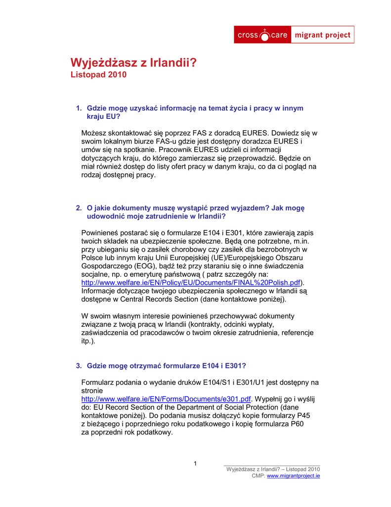WyjeŜdŜasz z Irlandii? - Crosscare Migrant Project