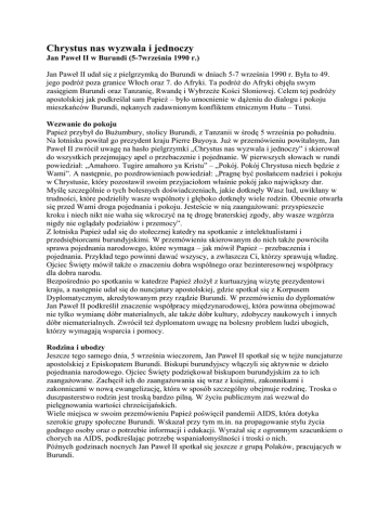Chrystus nas wyzwala i jednoczy Jan Paweł II w Burundi (5-7września 1990 r.) Jan Paweł II udał się z pielgrzymką do Burundi w dniach 5-7 września 1990 r. Była to 49. jego podróż poza granice Włoch oraz 7. do Afryki. Ta podróż do Afryki objęła swym zasięgiem Burundi oraz Tanzanię, Rwandę i Wybrzeże Kości Słoniowej. Celem tej podróży apostolskiej jak podkreślał sam Papież – było umocnienie w dążeniu do dialogu i pokoju mieszkańców Burundi, nękanych zadawnionym konfliktem etnicznym Hutu – Tutsi. Wezwanie do pokoju Papież przybył do Bużumbury, stolicy Burundi, z Tanzanii w środę 5 września po południu. Na lotnisku powitał go prezydent kraju Pierre Buyoya. Już w przemówieniu powitalnym, Jan Paweł II zwrócił uwagę na hasło pielgrzymki „Chrystus nas wyzwala i jednoczy” i skierował do wszystkich przejmujący apel o przebaczenie i pojednanie. W pierwszych słowach w rundi powiedział: „Amahoro. Tugire amahoro ya Kristu” – „Pokój. Pokój Chrystusa niech będzie z Wami”. A następnie, po pozdrowieniach powiedział: „Pragnę być posłańcem nadziei i pokoju w Chrystusie, który pozostawił swoim przyjaciołom właśnie pokój jako największy dar. Myślę szczególnie o tych bolesnych doświadczeniach, jakie dotknęły Wasz lud, uwikłany w trudności, które podzieliły wasze wspólnoty i głęboko dotknęły wiele rodzin. Obecnie otwarła się przed Wami droga pojednania i pokoju. Jesteście w nią zaangażowani: przyspieszcie kroku i niech nikt nie waha się wkroczyć na tę drogę braterskiej zgody, aby wasze wzgórza nigdy nie oglądały podziałów i przemocy”. Z lotniska Papież udał się do stołecznej katedry na spotkanie z intelektualistami i przedsiębiorcami burundyjskimi. W przemówieniu skierowanym do nich także powróciła sprawa pojednania narodowego, które wymaga – jak mówił Papież – przebaczenia i pojednania. Przykład tego powinni dawać wszyscy, a zwłaszcza Ci, którzy sprawują władzę. Ojciec Święty mówił także o znaczeniu dobra wspólnego oraz bezinteresownej współpracy dla dobra narodu. Bezpośrednio po spotkaniu w katedrze Papież złożył z kurtuazyjną wizytę prezydentowi kraju, a następnie udał się do nuncjatury apostolskiej, gdzie spotkał się z Korpusem Dyplomatycznym, akredytowanym przy rządzie Burundi. W przemówieniu do dyplomatów Jan Paweł II podkreślił znaczenie współpracy międzynarodowej, która powinna obejmować nie tylko wymianę dóbr materialnych, ale także dóbr kultury, zdobyczy naukowych i innych dóbr niematerialnych. Zwrócił też dyplomatom uwagę na bolesny problem ludzi ubogich, którzy wymagają wsparcia i pomocy. Rodzina i ubodzy Jeszcze tego samego dnia, 5 września wieczorem, Jan Paweł II spotkał się w tejże nuncjaturze apostolskiej z Episkopatem Burundi. Biskupi burundyjscy włączyli się aktywnie w dzieło pojednania narodowego. Ojciec Święty podziękował biskupom burundyjskim za to ich zaangażowane. Zachęcił ich do zaangażowania się wraz z księżmi, zakonnikami i zakonnicami w nową ewangelizację, która w sposób szczególny obejmuje rodzinę. Troska o duszpasterstwo rodzin jest troską bardzo pilną. W życiu publicznym zaś wezwał do pielęgnowania wartości chrześcijańskich. Wiele miejsca w swoim przemówieniu Papież poświęcił pandemii AIDS, która dotyka szerokie grupy społeczne Burundi. Wskazał przy tym m.in. na propagowanie stylu życia godnego osoby oraz o potrzebie informacji i edukacji. Wyrażał się z ogromnym szacunkiem o chorych na AIDS, podkreślając potrzebę wspaniałomyślności i troski o nich. Późnych godzinach nocnych Jan Paweł II spotkał się jeszcze z grupą Polaków, pracujących w Burundi. W czwartek 6 września Jan Paweł II udał się samochodem do Gitegi, dawnej stolicy kraju, położonej ok. 100 km od Bużumbury. Wzdłuż całej trasy stały setki tysięcy wiernych, pozdrawiających go żywiołowo. W Gitego Papież odprawił Mszę św. Homilię poświęcił d dużej mierze życiu chrześcijańskiej rodziny. Mówiąc o rodzinie Jan Paweł II sięgał do mądrości zawartych w rodzimych przysłowiach i zwyczajach. Podkreślał, iż życie małżeńskie wymaga czci, wierności i miłości. Wskazywał na wartość i godność dzieci w rodzinie. „Umawana ni umurina wisangi musangyie ni Imana” – „Dziecko jest wspólnym dobrem Boga i rodziców” – cytował jedno z miejscowych przysłów. Wracając od ołtarza polowego Papież wstąpił do chaty jednej z rodzin. Po południu Jan Paweł II odwiedził miejscową katedrę, gdzie spotkał się z grupą trzech tysięcy katechistów i przedstawicieli laikatu. Wskazał na ich zaangażowanie w dzieło pojednania narodowego. Po powrocie do stolicy w stołecznej katedrze Jan Paweł II spotkał się jeszcze z duchowieństwem Burundi, a następnie, w budynku nuncjatury, z przedstawicielami innych wyznań chrześcijańskich oraz innych religii. Wszystkich zachęcał do współpracy w dziele pojednania narodowego. W piątek 7 września, w godzinach porannych, Jan Paweł II odwiedził duży szpital „PrinceRegent Charles”, gdzie znajdowały się specjalne oddziały dla chorych na AIDS. Papież rozmawiał z chorymi i na koniec wręczył dyrektorowi szpitala czek na 100 tys. USD jako specjalną pomoc. Bądźcie świadkami zbawczej miłości W piątek 7 września Jan Paweł II odprawił także Mszę św. dla mieszkańców stolicy i okolic. Podczas Mszy św. udzielił sakramentu kapłaństwa 25 diakonom z Burundi i Konga (Zairu). W homilii, poświęconej w dużej mierze sakramentowi kapłaństwa, Jan Paweł II nawiązał raz jeszcze do potrzeby pokoju i pojednania narodowego. Mówił m.in. iż lud oczekuje od kapłanów bycia świadkami zbawczej miłości, przebaczenia i pojednania. Kapłan jako drugi Chrystus ma jednoczyć i gromadzić wszystkich w jednej wspólnocie. Po południu obyła się ceremonia pożegnania Papieża na lotnisku w Bużumb
