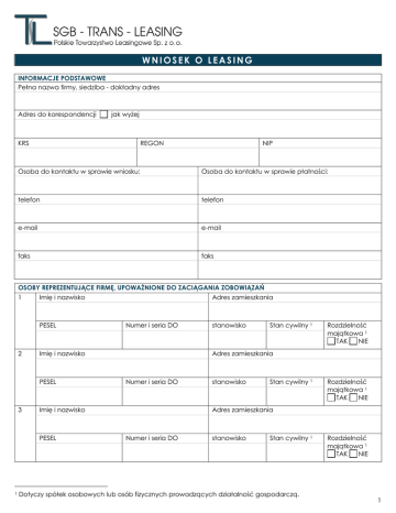 WNIOSEK O LEASING INFORMACJE PODSTAWOWE Pełna nazwa firmy, siedziba - dokładny adres Adres do korespondencji jak wyżej KRS REGON NIP Osoba do kontaktu w sprawie wniosku: Osoba do kontaktu w sprawie płatności: telefon telefon e-mail e-mail faks faks OSOBY REPREZENTUJĄCE FIRMĘ, UPOWAŻNIONE DO ZACIĄGANIA ZOBOWIĄZAŃ 1 Imię i nazwisko Adres zamieszkania PESEL 2 Imię i nazwisko PESEL 3 stanowisko Stan cywilny 1 Rozdzielność majątkowa 1 TAK NIE Adres zamieszkania Numer i seria DO Imię i nazwisko PESEL 1 Numer i seria DO stanowisko Stan cywilny 1 Rozdzielność majątkowa 1 TAK NIE Adres zamieszkania Numer i seria DO stanowisko Stan cywilny 1 Dotyczy spółek osobowych lub osób fizycznych prowadzących działalność gospodarczą. Rozdzielność majątkowa 1 TAK NIE 1 INFORMACJE UZUPEŁNIAJĄCE Data założenia Forma prawna działalności Kapitał zakładowy Opis działalności podstawowej i planowanej Liczba zatrudnionych Zasięg działalności lokalny krajowy Firma jest czynnym płatnikiem VAT TAK NIE Nazwa banku międzynarodowy Forma księgowości pełna uproszczona Adres Urzędu Skarbowego Numer rachunku podstawowego INFORMACJA O WŁAŚCICIELACH O UDZIAŁACH ≥ 25% 2 1 nazwa firmy / imię i nazwisko NIP / PESEL udział w % 2 nazwa firmy / imię i nazwisko NIP / PESEL udział w % 3 nazwa firmy / imię i nazwisko NIP / PESEL udział w % 4 nazwa firmy / imię i nazwisko NIP / PESEL udział w % PRZEDMIOT LEASINGU marka / model / typ wartość netto czy używany? TAK NIE kwota zaliczki 3 termin dostawy rok produkcji miejsce użytkowania Nazwa i adres dostawcy / NIP / osoba do kontaktu / telefon WARUNKI UMOWY okres leasingu w miesiącach pierwsza rata w % rodzaj leasingu Proponowane dodatkowe zabezpieczenie (poza wekslem4): Dotyczy spółek Należy załączyć potwierdzenie wpłaty deklarowanej zaliczki 4 Transakcja zabezpieczona będzie wekslem in blanco. W przypadku spółek osobowych lub osób fizycznych prowadzących działalność gospodarczą konieczne jest podpisanie weksla wraz współmałżonkiem. 2 2 3 DANE FINANSOWE Wyjaśnienie straty (jeżeli dotyczy) OPIS MAJĄTKU TRWAŁEGO - pojazdy, maszyny, nieruchomości nazwa (marka / typ / rok produkcji, wartość rodzaj): budowy: rynkowa netto: Obciążenie (zastaw, przewłaszczenie, hipoteka, itp.) jakie i wobec kogo: ZOBOWIĄZANIA KREDYTOWE / POŻYCZKI – stan na koniec miesiąca: wartość kredytu rodzaj średnia rata bank kredytu miesięczna przyznana do spłaty data zakończenia zabezpieczenie ZOBOWIĄZANIA LEASINGOWE (poza SGB-TL) – stan na koniec miesiąca: leasingodawca przedmiot leasingu data zawarcia data zakończenia bieżąca wartość zobowiązania średnia rata miesięczna 3 INNE ZOBOWIĄZANIA – stan na koniec miesiąca: rodzaj beneficjent wartość zobowiązania termin wygaśnięcia weksle poręczenia gwarancje GŁÓWNI DOSTAWCY nazwa firmy adres i telefon czy są podpisane kontrakty? okres współpracy procentowy udział w obrotach GŁÓWNI ODBIORCY nazwa firmy adres i telefon czy są podpisane kontrakty? okres współpracy procentowy udział w obrotach Wysokość należności i zobowiązań wobec dostawców - stan na koniec miesiąca: Główni wierzyciele Wartość zobowiązania Główni dłużnicy Wartość należności ZOBOWIĄZANIA Z TYTUŁU PODATKÓW I SKŁADEK ZUS Na Wnioskodawcy ciążą zaległości podatkowe TAK NIE Wysokość zobowiązania Na Wnioskodawcy ciążą zaległości z tytułu składek ZUS TAK NIE Wysokość zobowiązania W stosunku do Wnioskodawcy prowadzi się egzekucje administracyjne z tytułu należności budżetowych: TAK NIE Czy Zarząd posiada ograniczenia w zaciąganiu zobowiązań (w tym wekslowych) innych niż ustawowe. TAK NIE 4 Do wniosku załączam(y) dokumenty: zaświadczenie REGON statut ,PIT roczny , zaświadczenie NIP , wpis do ewidencji działalności gosp. , KRS , wyciąg z Książki Przychodów i Rozchodów za ostatni, zamknięty m-c wyników: za rok ubiegły , za okres bieżący , , bilans i rachunek , zaświadczenie o braku zaległości w US, nie starsze niż 1 miesiąc zaświadczenie o braku zaległości w ZUS, nie starsze niż 1 miesiąc akt rozdzielności majątkowej , umowa spółki , potwierdzenie wpłaty zaliczki do dostawcy , , . Oświadczam(y), że stan prawny oraz dane i informacje zawarte w powyższych dokumentach nie uległy zmianie, są nadal aktualne i zgodne ze stanem faktycznym na dzień złożenia wniosku. Wyrażają zgodę na wystąpienie do Krajowego Rejestru Długów oraz innych baz danych o ujawnienie informacji gospodarczych nas dotyczących po numerze PESEL5 i NIP. Zlecamy ubezpieczenie przedmiotu i zobowiązujemy się do uregulowania składki. Wyrażam(y) zgodę na przetwarzanie danych zawartych we wniosku (zgodnie z Ustawą z dnia 29-08-1997 o Ochronie danych osobowych Dz.U.Nr 133, poz. 883) w celu i zakresie realizacji umowy leasingowej oraz wyrażam(y) zgodę na przesyłanie informacji drogą elektroniczną. Miejscowość i data 5 podpis i pieczątka właściciela lub osoby upoważnionej do zaciągania zobowiązań w imieniu Wnioskodawcy Dotyczy spółek osobowych lub osób fizycznych prowadzących działalność gospodarczą. 5