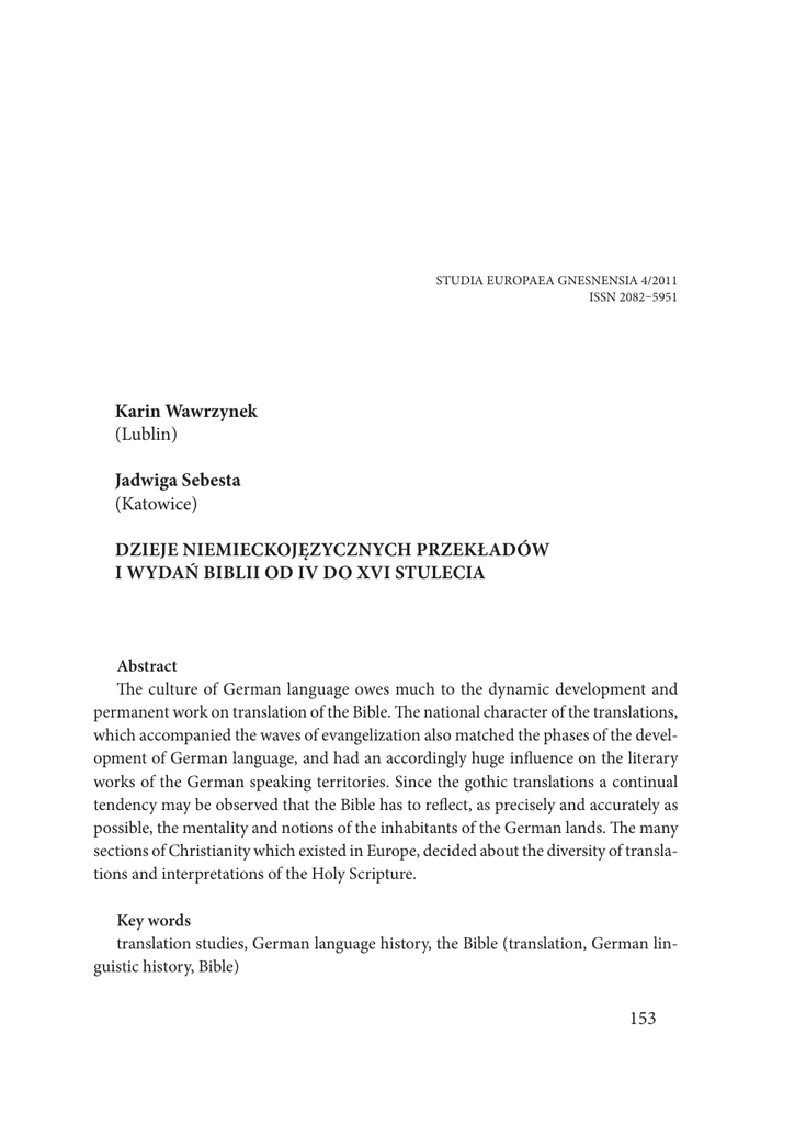 KARIN WAWRZYNEK, JADWIGA SEBESTA, DZIEJE NIEMIECKOJĘZYCZNYCH PRZEKŁADÓW… STUDIA EUROPAEA GNESNENSIA 4/2011 ISSN 2082–5951 Karin Wawrzynek (Lublin) Jadwiga Sebesta (Katowice) DZIEJE NIEMIECKOJĘZYCZNYCH PRZEKŁADÓW I WYDAŃ BIBLII OD IV DO XVI STULECIA Abstract The culture of German language owes much to the dynamic development and permanent work on translation of the Bible. The national character of the translations, which accompanied the waves of evangelization also matched the phases of the development of German language, and had an accordingly huge influence on the literary works of the German speaking territories. Since the gothic translations a continual tendency may be observed that the Bible has to reflect, as precisely and accurately as possible, the mentality and notions of the inhabitants of the German lands. The many sections of Christianity which existed in Europe, decided about the diversity of translations and interpretations of the Holy Scripture. Key words translation studies, German language history, the Bible (translation, German linguistic history, Bible) 153 STUDIA EUROPAEA GNESNENSIA 4/2011 · IDEE OD MANUSKRYPTÓW GOCKICH PO MITTELDEUTSCH — RECEPCJA BIBLII NA TERENACH MISYJNYCH I PRZEKŁADY GOCKIE Doniosłość poszczególnych języków narodowych, ich różnorodność, a także przesłanie Słowa Bożego wraz z Jego dalekosiężną misją unaocznione zostały dzięki zesłaniu Ducha Świętego. Uwiecznienie na piśmie źródeł wiary stało się koniecznością ze względu na wagę Objawienia. Dowodem na staranność w tej mierze są liczne świadectwa, które ukazują pracę translatorską, prowadzoną we wszystkich językach objętych wpływami ewangelizacji. Prócz orientalnych przekładów tekstów biblijnych centralnym tematem na Zachodzie stała się Biblia w wersji greckiej i łacińskiej. Wśród chrześcijan zamieszkujących Rzym aż do III wieku zasadniczą rolę odgrywała greka, z czym wiązała się odpowiednia forma sprawowania liturgii. Na terenie Afryki natomiast ukształtowała się łacina z domieszką języka punickiego, którą w swych homiliach stosowali tak wielcy mówcy jak Augustyn. Fakt ten uzasadnia brak znajomości innego języka ze strony rdzennego ludu. To ograniczenie powodowało, iż mimo przyjętej w Cesarstwie łaciny i greki posługiwano się w kwestiach majątkowych dialektem punickim1. Prawo wysławiania się we własnym języku uznał też Ireneusz, biskup Lyonu (II w.), odwołując się do symbolu duchowej wielkości Kościoła, w którym każdy naród i język znajduje własne miejsce, tak iż nawet poganie nieznający mowy Rzymian stają się częścią wspólnoty dzięki wierze w Chrystusa, sprawcę jedności. Dzięki nim Słowo Boże szerzone jest istotnie na całym świecie. Również Germanie zostali objęci chrystianizacją za przyczyną iroszkockich misjonarzy, działających aż do VIII wieku. Konsekwentnie doszło do pierwszego przekładu Biblii na język Gotów, którego dokonał Wulfila (łac. Ulfilas, 311–383), biskup Terwingi, Wizygotów lub Gotów zachodnich2. Ponieważ był on zwolennikiem arianizmu, więc posunął się do przyrównania stosunku między Chrystusem a Ojcem do germańskie- 1 Język punicki był popularny w basenie Morza Śródziemnego w V w. przed Chrystusem. Charakterystyczne dla tego języka było zanikanie głosek gardłowych właściwych językowi semickiemu. 2 Przodkowie Wulfili rekrutowali się z chrześcijan kapadockich, uprowadzonych w III w. przez Gotów. On sam był Gotem lub Półgotem. W języku Gotów Wulfila (Ulfilas) oznacza małego wilka. 154 KARIN WAWRZYNEK, JADWIGA SEBESTA, DZIEJE NIEMIECKOJĘZYCZNYCH PRZEKŁADÓW… go modelu opartego na posłuszeństwie, podporządkowaniu i wierności. Niemniej Wulfila nie był w pełni skłonny popierać chrystologii Arian, uznając Chrystusa za Pana i Boga. Decyzja o przejściu do obozu ariańskiego nie była uwarunkowana wyłącznie teologicznie, lecz także powodowana polityką kościelną. Zwolennicy arianizmu posiadali też swoistą liturgię: pieśni oraz ryt pochodni, który później zaadaptowano do nabożeństw katolickich. Kamieniem węgielnym pod dzieło germańskiej inkulturacji był akt święceń Wulfili, „chrześcijańskiego biskupa w kraju Gotów”, nadany przez patriarchę Konstantynopola Euzebiusza z Nikomedii w roku 341 na terenie Antiochii. Wówczas w Cesarstwie Ostrogotów dominowali arianie. Dopiero pod koniec IV wieku ustąpili miejsca trynitarzom. Nad dolnym Dunajem Wulfila przeprowadzał swą misję do roku 348 w ramach domeny zachodnich Gotów. Pod wpływami chrześcijaństwa znaleźli się także wschodni Goci, Wandalowie, Longobardowie i Burgundowie. Ogromne znaczenie zyskał przekład Biblii na język Gotów i zaznaczyło się ich szczególne zainteresowanie Pismem Świętym. Aby dokonać tłumaczenia, musiał Wulfila spełnić dwa warunki. Utworzył mianowicie wiele nowych znaków literowych, a w związku z nimi także neologizmy i nowe wyrażenia, które miały na celu ułatwienie zrozumienia treści biblijnych. Dla wielu pojęć i wyrażeń użytych w Biblii brakowało odpowiedników w języku gockim. Jako znawca greki, łaciny i gockiego biskup przystosował runiczne pismo Gotów do wyrażania treści biblijnych. Początkowym wyzwaniem było przełożenie świata wyobrażeń i światopoglądu Gotów na język Biblii tak, by powstał tekst zrozumiały, przedstawiony w formie obrazowej. Różnica w obrębie mentalności mogła być przezwyciężona wyłącznie dzięki przekształceniom, selekcji i wartościowaniu. Przekład domagał się wierności oryginalnemu stylowi, a z drugiej strony tylko poczynione zabiegi mogły dać Biblii przystęp do nowego odbiorcy, skutkując poznaniem. Utorowana została tym samym droga do alternatywnego stylu życia i myślenia. Zgodnie z wiarygodnym świadectwem historyka Prokopiusza za czasów Justyniana, w VI wieku, język Gotów dotarł do Italii, Galii, Hiszpan