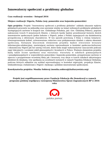 Innowatorzy społeczni a problemy globalne Czas realizacji: wrzesien - listopad 2016 Miejsce realizacji: Nigeria, Polska (woj. pomorskie oraz kujawsko-pomorskie) Opis projektu: Projekt “Innowatorzy społeczni a problemy globalne” zakłada ukazanie wpływu globalnych procesów na jednostkę oraz szerzenie wiedzy na temat wybranych problemów globalnych występujących zarówno w krajach tzw. Globalnego Południa, jak i tzw. Globalnej Północy, poprzez nakręcenie trzech 9 minutowych filmów, z których każdy będzie przedstawiał historie dwóch innowatorów społecznych (jeden bohater z Nigerii, jeden z Polski) zajmujących się działalnością prospołeczną o zbliżonym charakterze. W ten sposób powstaną 3 filmy o różnej tematyce: równouprawnienie kobiet, zrównoważone rolnictwo oraz podejmowanie działań z zakesu ekonomii społecznej. Kolejnym kluczowym elementem projektu będzie stworzenie broszury informacyjno-edukacyjnej, zawierającej zarówno wprowadzenie w kontekst społeczno-kulturowy i ekonomiczny Nigerii jak też szereg ćwiczeń, które beda mogli wykorzystywać nauczyciele podczas zajęć lekcyjnych z uczniami szkół gimnazjalnych i licealnych w Polsce. Ważnym elementem projektu będą także liczne spotkania oraz warsztaty: warsztaty w szkołach gimnazjalnych i ponadgimnazjalnych w województwie pomorskim i kujawsko-pomorskim, przygotowane zarówno w oparciu o przygotowane wcześniej filmy jak i broszurę; trzy akcje w trzech szkołach aktywizujące młodzież do działania, trzy spotkania na uczelniach wyższych w ramach Tygodnia Edukacji Globalnej, podczas których odbędzie się wykład wprowadzający w kontekst nigeryjski, projekcja filmów, telekonferencja z bohaterami z Nigerii i dyskusja z polskimi innowatorami społecznymi. Koordynatorka projektu: Monika Sobieraj ([email protected]) Projekt jest współfinansowany przez Fundacje Edukacja dla Demokracji w ramach programu polskiej współpracy rozwojowej Ministerstwa Spraw Zagranicznych RP w 2016 roku