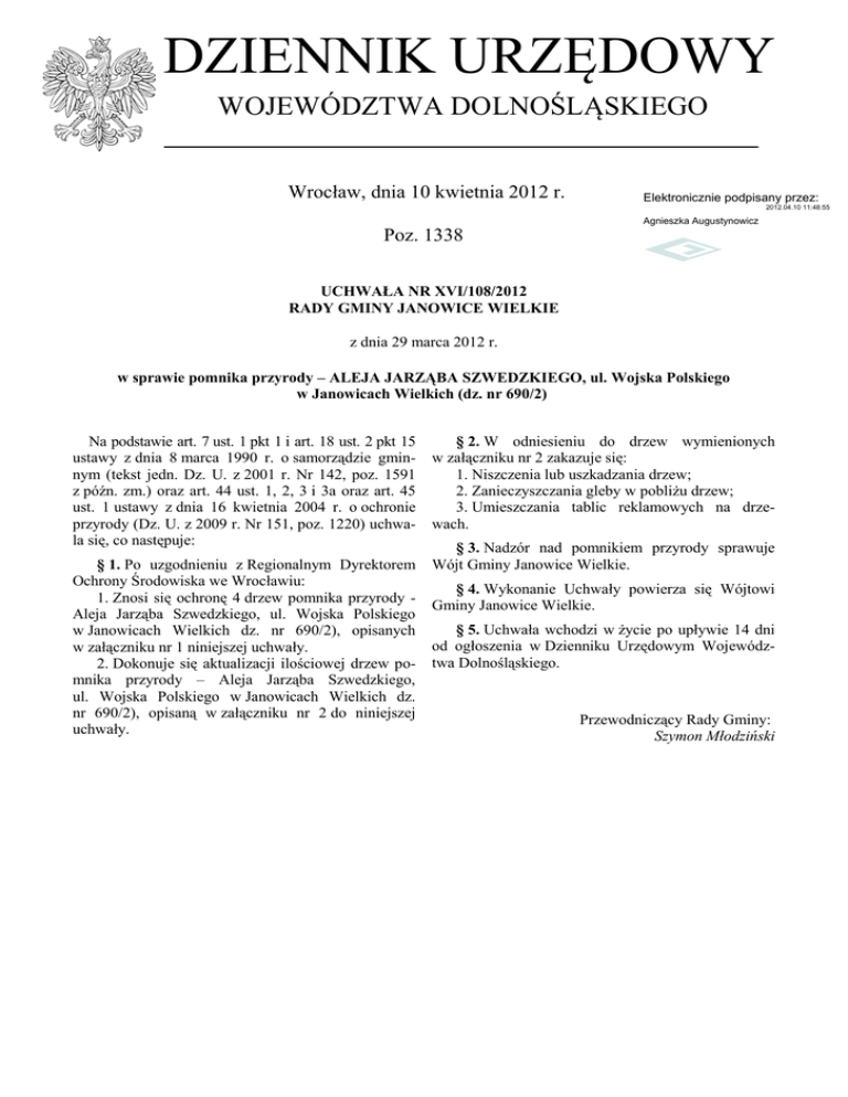 DZIENNIK URZĘDOWY WOJEWÓDZTWA DOLNOŚLĄSKIEGO Wrocław, dnia 10 kwietnia 2012 r. Elektronicznie podpisany przez: 2012.04.10 11:48:55 Agnieszka Augustynowicz Poz. 1338 UCHWAŁA NR XVI/108/2012 RADY GMINY JANOWICE WIELKIE Public key: Data: 2012-04-10 z dnia 29 marca 2012 r. w sprawie pomnika przyrody – ALEJA JARZĄBA SZWEDZKIEGO, ul. Wojska Polskiego w Janowicach Wielkich (dz. nr 690/2) Na podstawie art. 7 ust. 1 pkt 1 i art. 18 ust. 2 pkt 15 ustawy z dnia 8 marca 1990 r. o samorządzie gminnym (tekst jedn. Dz. U. z 2001 r. Nr 142, poz. 1591 z późn. zm.) oraz art. 44 ust. 1, 2, 3 i 3a oraz art. 45 ust. 1 ustawy z dnia 16 kwietnia 2004 r. o ochronie przyrody (Dz. U. z 2009 r. Nr 151, poz. 1220) uchwala się, co następuje: § 1. Po uzgodnieniu z Regionalnym Dyrektorem Ochrony Środowiska we Wrocławiu: 1. Znosi się ochronę 4 drzew pomnika przyrody Aleja Jarząba Szwedzkiego, ul. Wojska Polskiego w Janowicach Wielkich dz. nr 690/2), opisanych w załączniku nr 1 niniejszej uchwały. 2. Dokonuje się aktualizacji ilościowej drzew pomnika przyrody – Aleja Jarząba Szwedzkiego, ul. Wojska Polskiego w Janowicach Wielkich dz. nr 690/2), opisaną w załączniku nr 2 do niniejszej uchwały. § 2. W odniesieniu do drzew wymienionych w załączniku nr 2 zakazuje się: 1. Niszczenia lub uszkadzania drzew; 2. Zanieczyszczania gleby w pobliżu drzew; 3. Umieszczania tablic reklamowych na drzewach. § 3. Nadzór nad pomnikiem przyrody sprawuje Wójt Gminy Janowice Wielkie. § 4. Wykonanie Uchwały powierza się Wójtowi Gminy Janowice Wielkie. § 5. Uchwała wchodzi w życie po upływie 14 dni od ogłoszenia w Dzienniku Urzędowym Województwa Dolnośląskiego. Przewodniczący Rady Gminy: Szymon Młodziński Dziennik Urzędowy Województwa Dolnośląskiego –2– Poz. 1338 Załącznik nr 1 do uchwały nr XVI/ /108/2012 Rady Gminy Janowice Wielkie z dnia 29 marca 2012 r. ZESTAWIENIE DRZEW PRZEZNACZONYCH DO ZNIESIENIA OCHRONY Aleja Jarząba Szwedzkiego , ul. Wojska Polskiego ,dz. nr 690/2 w Janowicach Wielkich − własność: Gmina Janowice Wielkie 1. Jarząb szwedzki , strona lewa alei od ul. Kolejowej − 8. drzewo obw. 188 cm − drzewo całkowicie uschnięte. 2. Jarząb szwedzki, strona prawa alei od ul. Kolejowej − 14. drzewo obw. 178 cm − drzewo posiada dwie odnogi /trzecia wyłamana odcięta w poprzednich latach/. Jedna odnoga całkowicie uschnięta, druga wykazuje oznaki posuszu w 15%. Pochylona na posesję prywatną /dz. nr 364/9/. Odcięcie uschniętej odnogi spowoduje utratę stabilizacji drzewa i zagrożenie wyłamania usychającej pozostałej jednej odnogi. Pień drzewa po słuchowym sprawdzeniu wykazuje oznaki próchnicy. Kora pnia jest popękana wzdłuż pnia. 3. Jarząb szwedzki ,strona prawa alei od ul. Kolejowej, w okolicach posesji prywatnej Wojska Polskiego nr 3a – 33. drzewo obw. 192 cm − w 99% uschnięte. 4. Jarząb szwedzki, − 34. drzewo obw. 192 cm, strona prawa alei od ul. Kolejowej, w okolicach posesji Wojska Polskiego, SPZOZ Gminny Ośrodek Zdrowia. − w 99% uschnięte Załącznik nr 2 do uchwały nr XVI/ /108/2012 Rady Gminy Janowice Wielkie z dnia 29 marca 2012 r. 1. Gatunek drzewa. Aleja : Jarząb Szwedzki (Sorbus intermedia) 2. Sztuk 76 o obwodach pni (pierśnica) drzewa. 114−194 cm 3. Jednostka administracyjna. Gmina Janowice Wielkie Szczegółowa lokalizacja drzew. Ul. Wojska Polskiego dz. nr 690/2 Janowice Wielkie /w strefie terenu zabudowy mieszkaniowej zagrodowej oraz jednorodzinnej z dopuszczeniem wprowadzenia usług nieuciążliwych/ 4.