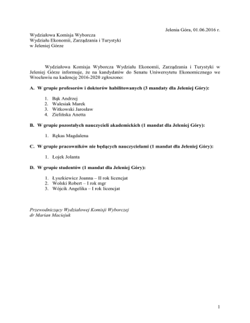 Jelenia Góra, 01.06.2016 r. Wydziałowa Komisja Wyborcza Wydziału Ekonomii, Zarządzania i Turystyki w Jeleniej Górze Wydziałowa Komisja Wyborcza Wydziału Ekonomii, Zarządzania i Turystyki w Jeleniej Górze informuje, że na kandydatów do Senatu Uniwersytetu Ekonomicznego we Wrocławiu na kadencję 2016-2020 zgłoszono: A. W grupie profesorów i doktorów habilitowanych (3 mandaty dla Jeleniej Góry): 1. 2. 3. 4. Bąk Andrzej Walesiak Marek Witkowski Jarosław Zielińska Anetta B. W grupie pozostałych nauczycieli akademickich (1 mandat dla Jeleniej Góry): 1. Rękas Magdalena C. W grupie pracowników nie będących nauczycielami (1 mandat dla Jeleniej Góry): 1. Łojek Jolanta D. W grupie studentów (1 mandat dla Jeleniej Góry): 1. Łyszkiewicz Joanna – II rok licencjat 2. Wolski Robert – I rok mgr 3. Wójcik Angelika – I rok licencjat Przewodniczący Wydziałowej Komisji Wyborczej dr Marian Maciejuk 1