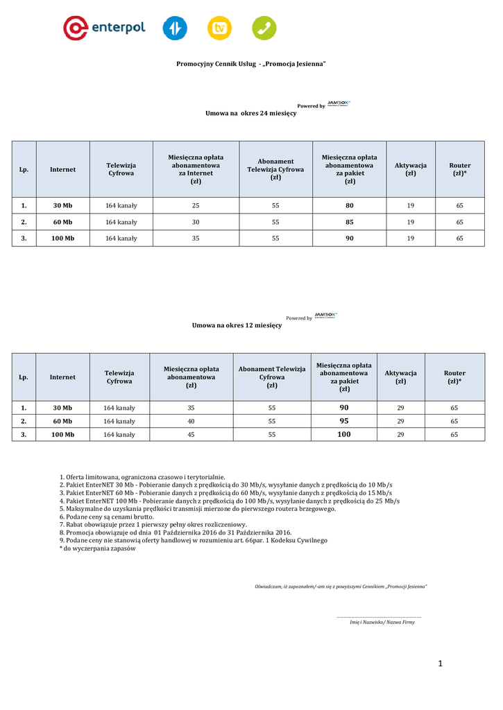 Promocyjny Cennik Usług - „Promocja Jesienna” Powered by Umowa na okres 24 miesięcy Lp. Internet Telewizja Cyfrowa Miesięczna opłata abonamentowa za Internet (zł) Abonament Telewizja Cyfrowa (zł) Miesięczna opłata abonamentowa za pakiet (zł) Aktywacja (zł) Router (zł)* 1. 30 Mb 164 kanały 25 55 80 19 65 2. 60 Mb 164 kanały 30 55 85 19 65 3. 100 Mb 164 kanały 35 55 90 19 65 Powered by Umowa na okres 12 miesięcy Miesięczna opłata abonamentowa (zł) Abonament Telewizja Cyfrowa (zł) Miesięczna opłata abonamentowa za pakiet (zł) Aktywacja (zł) Router (zł)* Lp. Internet Telewizja Cyfrowa 1. 30 Mb 164 kanały 35 55 90 29 65 2. 60 Mb 164 kanały 40 55 95 29 65 3. 100 Mb 164 kanały 45 55 100 29 65 1. Oferta limitowana, ograniczona czasowo i terytorialnie. 2. Pakiet EnterNET 30 Mb - Pobieranie danych z prędkością do 30 Mb/s, wysyłanie danych z prędkością do 10 Mb/s 3. Pakiet EnterNET 60 Mb - Pobieranie danych z prędkością do 60 Mb/s, wysyłanie danych z prędkością do 15 Mb/s 4. Pakiet EnterNET 100 Mb - Pobieranie danych z prędkością do 100 Mb/s, wysyłanie danych z prędkością do 25 Mb/s 5. Maksymalne do uzyskania prędkości transmisji mierzone do pierwszego routera brzegowego. 6. Podane ceny są cenami brutto. 7. Rabat obowiązuje przez 1 pierwszy pełny okres rozliczeniowy. 8. Promocja obowiązuje od dnia 01 Października 2016 do 31 Października 2016. 9. Podane ceny nie stanowią oferty handlowej w rozumieniu art. 66par. 1 Kodeksu Cywilnego * do wyczerpania zapasów Oświadczam, iż zapoznałem/-am się z powyższymi Cennikiem „Promocji Jesienna” ……………………………………………………………. Imię i Nazwisko/ Nazwa Firmy 1 Promocyjny Cennik Usług - „Promocja Jesienna” Powered by Umowa na okres 24 miesięcy Lp. Internet Telefon Telewizja Cyfrowa Miesięczna opłata abonamentowa za Internet (zł) Abonament Telefon (zł) Abonament Telewizja Cyfrowa (zł) Miesięczna opłata abonamentowa za pakiet (zł) Aktywacja (zł) Router (zł)* 1. 30 Mb 200 min 164 kanały 25 10 55 90 19 65 2. 60 Mb 200 min 164 kanały 30 10 55 95 19 65 3. 100 Mb 200 min 164 kanały 35 10 55 100 19 65 Powered by Umowa na okres 12 miesięcy Abonament Internet (zł) Abonament Telefon (zł) Abonament Telewizja Cyfrowa (zł) Miesięczna opłata abonamentowa za pakiet (zł) Aktywacja (zł) Router (zł)* Lp. Internet Telefon Telewizja Cyfrowa 1. 30Mb 200 min 164 kanały 35 10 55 100 29 65 2. 60 Mb 200 min 164 kanały 40 10 55 105 29 65 3. 100Mb 200 min 164 kanały 45 10 55 110 29 65 1. Oferta limitowana, ograniczona czasowo i terytorialnie. 2. Pakiet EnterNET 30 Mb - Pobieranie danych z prędkością do 30 Mb/s, wysyłanie danych z prędkością do 10 Mb/s 3. Pakiet EnterNET 60 Mb - Pobieranie danych z prędkością do 60 Mb/s, wysyłanie danych z prędkością do 15 Mb/s 4. Pakiet EnterNET 100 Mb - Pobieranie danych z prędkością do 100 Mb/s, wysyłanie danych z prędkością do 25 Mb/s 5. Maksymalne do uzyskania prędkości transmisji mierzone do pierwszego routera brzegowego. 6. Podane ceny są cenami brutto. 7. Rabat obowiązuje przez 1 pierwszy pełny okres rozliczeniowy. 8. Promocja obowiązuje od dnia 01 Października 2016 do 31 Października 2016. 9. Podane ceny nie stanowią oferty handlowej w rozumieniu art. 66par. 1 Kodeksu Cywilnego * do wyczerpania zapasów Oświadczam, iż zapoznałem/-am się z powyższymi Cennikiem „Promocji Jesienna” ……………………………………………………………. Imię i Nazwisko/ Nazwa Firmy 2