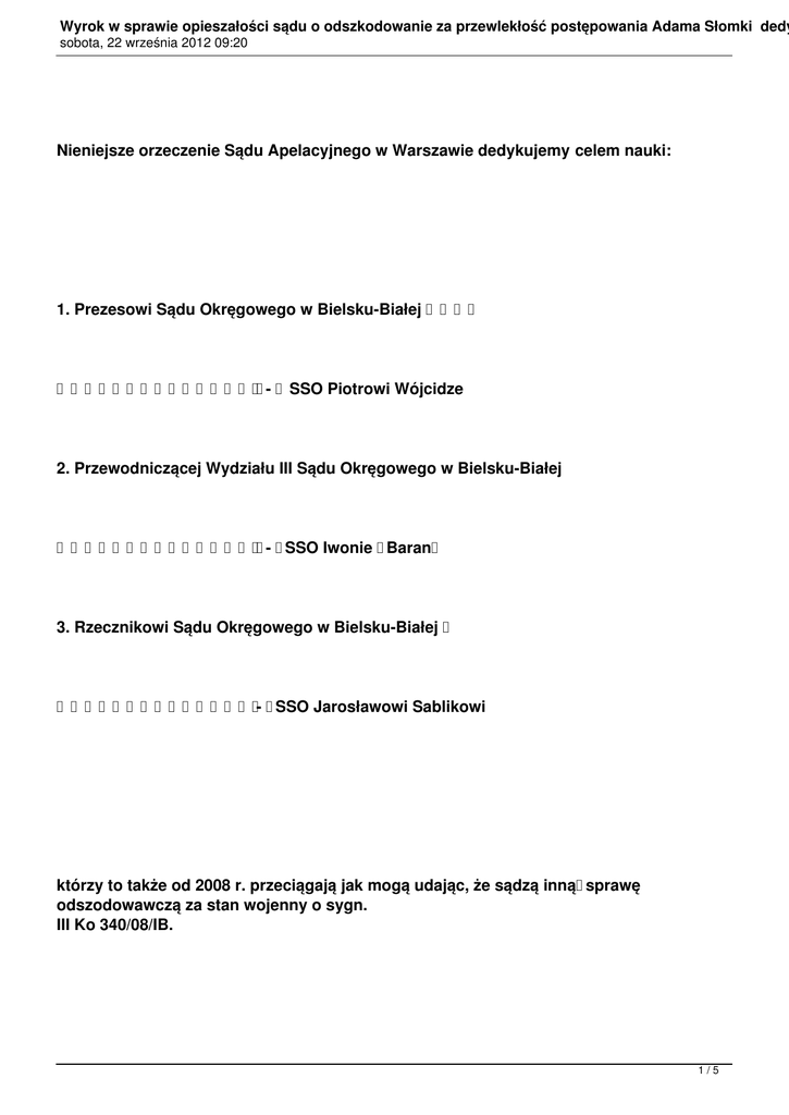 Wyrok w sprawie opieszałości sądu o odszkodowanie za przewlekłość postępowania Adama Słomki dedy