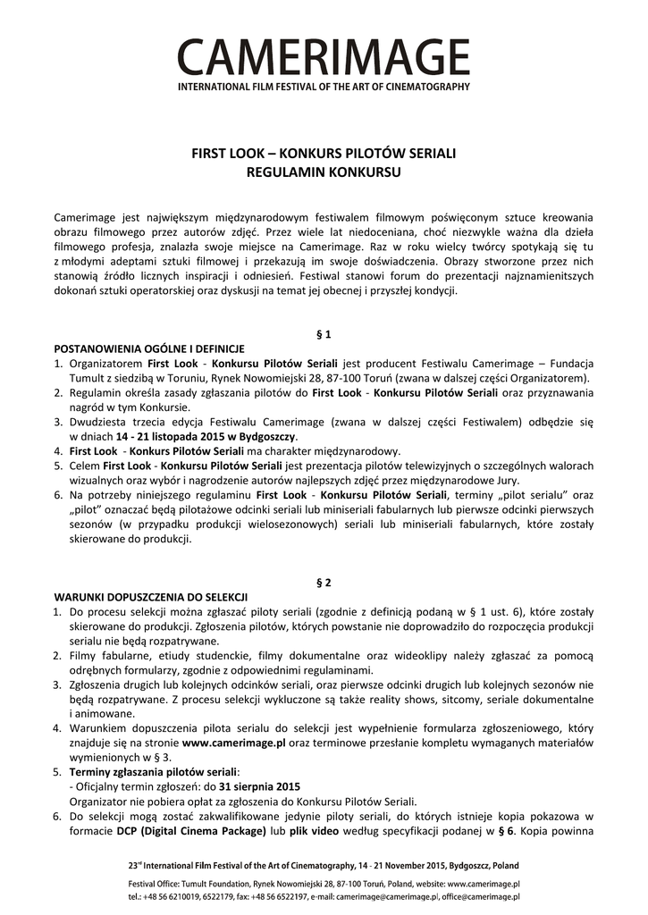 FIRST LOOK – KONKURS PILOTÓW SERIALI REGULAMIN KONKURSU Camerimage jest największym międzynarodowym festiwalem filmowym poświęconym sztuce kreowania obrazu filmowego przez autorów zdjęć. Przez wiele lat niedoceniana, choć niezwykle ważna dla dzieła filmowego profesja, znalazła swoje miejsce na Camerimage. Raz w roku wielcy twórcy spotykają się tu z młodymi adeptami sztuki filmowej i przekazują im swoje doświadczenia. Obrazy stworzone przez nich stanowią źródło licznych inspiracji i odniesień. Festiwal stanowi forum do prezentacji najznamienitszych dokonań sztuki operatorskiej oraz dyskusji na temat jej obecnej i przyszłej kondycji. §1 POSTANOWIENIA OGÓLNE I DEFINICJE 1. Organizatorem First Look - Konkursu Pilotów Seriali jest producent Festiwalu Camerimage – Fundacja Tumult z siedzibą w Toruniu, Rynek Nowomiejski 28, 87-100 Toruń (zwana w dalszej części Organizatorem). 2. Regulamin określa zasady zgłaszania pilotów do First Look - Konkursu Pilotów Seriali oraz przyznawania nagród w tym Konkursie. 3. Dwudziesta trzecia edycja Festiwalu Camerimage (zwana w dalszej części Festiwalem) odbędzie się w dniach 14 - 21 listopada 2015 w Bydgoszczy. 4. First Look - Konkurs Pilotów Seriali ma charakter międzynarodowy. 5. Celem First Look - Konkursu Pilotów Seriali jest prezentacja pilotów telewizyjnych o szczególnych walorach wizualnych oraz wybór i nagrodzenie autorów najlepszych zdjęć przez międzynarodowe Jury. 6. Na potrzeby niniejszego regulaminu First Look - Konkursu Pilotów Seriali, terminy „pilot serialu” oraz „pilot” oznaczać będą pilotażowe odcinki seriali lub miniseriali fabularnych lub pierwsze odcinki pierwszych sezonów (w przypadku produkcji wielosezonowych) seriali lub miniseriali fabularnych, które zostały skierowane do produkcji. §2 WARUNKI DOPUSZCZENIA DO SELEKCJI 1. Do procesu selekcji można zgłaszać piloty seriali (zgodnie z definicją podaną w § 1 ust. 6), które zostały skierowane do produkcji. Zgłoszenia pilotów, których powstanie nie doprowadziło do rozpoczęcia produkcji serialu nie będą rozpatrywane. 2. Filmy fabularne, etiudy studenckie, filmy dokumentalne oraz wideoklipy należy zgłaszać za pomocą odrębnych formularzy, zgodnie z odpowiednimi regulaminami. 3. Zgłoszenia drugich lub kolejnych odcinków seriali, oraz pierwsze odcinki drugich lub kolejnych sezonów nie będą rozpatrywane. Z procesu selekcji wykluczone są także reality shows, sitcomy, seriale dokumentalne i animowane. 4. Warunkiem dopuszczenia pilota serialu do selekcji jest wypełnienie formularza zgłoszeniowego, który znajduje się na stronie www.camerimage.pl oraz terminowe przesłanie kompletu wymaganych materiałów wymienionych w § 3. 5. Terminy zgłaszania pilotów seriali: - Oficjalny termin zgłoszeń: do 31 sierpnia 2015 Organizator nie pobiera opłat za zgłoszenia do Konkursu Pilotów Seriali. 6. Do selekcji mogą zostać zakwalifikowane jedynie piloty seriali, do których istnieje kopia pokazowa w formacie DCP (Digital Cinema Package) lub plik video według specyfikacji podanej w § 6. Kopia powinna Strona |2 7. 8. 9. 10. 11. 12. 13. posiadać napisy angielskie (jeśli serial nie jest w oryginale w języku angielskim). W momencie zgłaszania do selekcji Zgłaszający powinien zarezerwować kopię dla Organizatora na czas trwania Festiwalu. W procesie selekcyjnym będą brane pod uwagę wyłącznie piloty seriali zrealizowane po 1 stycznia 2014. Osoba zgłaszająca pilot serialu zobowiązana jest złożyć w formularzu zgłoszeniowym oświadczenie, że: a) jest uprawniona do dokonania zgłoszenia i udzielenia Organizatorowi określonej w Regulaminie licencji do korzystania z pilota serialu i materiałów towarzyszących, tj. że przysługują jej wszelkie prawa autorskie i prawa pokrewne (producenckie, wykonawcze) lub jest upoważniona przez dysponenta tych praw do działania w jego imieniu i na jego rzecz w zakresie objętym zgłoszeniem, albo że b) jest uprawniona wyłącznie do dokonania zgłoszenia pilota serialu i materiałów towarzyszących, a Organizator ma obowiązek odrębnego uzyskania od uprawnionego stosownej licencji na korzystanie z pilota serialu. W przypadku określonym w ust. 8 lit. b) warunkiem zakwalifikowania pilota serialu do Konkursu jest udzielenie Organizatorowi przez podmiot uprawniony stosownej, nieodpłatnej zgody (licencji) na korzystanie z pilota serialu na potrzeby Konkursu w sposób określony w Regulaminie i w stosownym czasie umożliwiającym udział pilota serialu w Konkursie. W przypadku określonym w ust. 8 lit. a) Zgłaszający oświadcza, że w zakresie objętym Regulaminem przysługują mu (lub jego Mocodawcy) wyłączne i niczym nieograniczone prawa do pilota serialu i materiałów towarzyszących oraz że pilot serialu i materiały nie są obciążone prawami osób trzecich i praw takich nie naruszają. Oświadcza ponadto, że jest prawidłowo umocowany do dokonania zgłoszenia i udzielenia licencji, a umocowanie w chwili dokonywania zgłoszenia nie wygasło, ani nie zostało odwołane. W razie wystąpienia przez jakikolwiek podmiot do Organizatora z roszczeniami dotyczącymi naruszenia praw osób trzecich (w szczególności praw autorskich, wykonawczych, producenckich), Zgłaszający zobowiązuje się zaspokoić w całości słuszne roszczenia tych osób i zwolnić Organizatora z obowiązku wszelkich świadczeń z tego tytułu. W przypadku określonym w ust. 8 lit. b) Zgłaszający oświadcza, że dokonuje zgłoszenia za zgodą i wiedzą dysponenta praw do pilota serialu oraz że zgoda (licencja) na korzystanie z pilota serialu zostanie Organizatorowi odrębnie udzielona pod rygorem odmowy zakwalifikowania pilota serialu do Konkursu, a także przyjmuje na siebie odpowiedzialność za dokonanie zgłoszenia bez wiedzy i zgody dysponenta praw do pilota serialu. W przypadku określonym w ust. 8 lit. a) Zgłaszający z chwilą przesłania zgłoszenia udziela Organizat