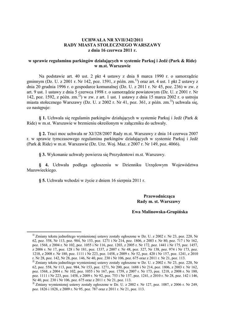 UCHWAŁA NR XVII/342/2011 RADY MIASTA STOŁECZNEGO WARSZAWY z dnia 16 czerwca 2011 r. w sprawie regulaminu parkingów działających w systemie Parkuj i Jedź (Park & Ride) w m.st. Warszawie Na podstawie art. 40 ust. 2 pkt 4 ustawy z dnia 8 marca 1990 r. o samorządzie gminnym (Dz. U. z 2001 r. Nr 142, poz. 1591, z późn. zm.1)) oraz art. 4 ust. 1 pkt 2 ustawy z dnia 20 grudnia 1996 r. o gospodarce komunalnej (Dz. U. z 2011 r. Nr 45, poz. 236) w zw. z art. 9 ust. 1 ustawy z dnia 5 czerwca 1998 r. o samorządzie powiatowym (Dz. U. z 2001 r. Nr 142, poz. 1592, z późn. zm.2)) w zw. z art. 1 ust. 1 ustawy z dnia 15 marca 2002 r. o ustroju miasta stołecznego Warszawy (Dz. U. z 2002 r. Nr 41, poz. 361, z późn. zm.3)) uchwala się, co następuje: § 1. Uchwala się regulamin parkingów działających w systemie Parkuj i Jedź (Park & Ride) w m.st. Warszawie w brzmieniu określonym w załączniku do uchwały. § 2. Traci moc uchwała nr XI/328/2007 Rady m.st. Warszawy z dnia 14 czerwca 2007 r. w sprawie tymczasowego regulaminu parkingów działających w systemie Parkuj i Jedź (Park & Ride) w m.st. Warszawie (Dz. Urz. Woj. Maz. z 2007 r. Nr 149, poz. 4066). § 3. Wykonanie uchwały powierza się Prezydentowi m.st. Warszawy. § 4. Uchwała podlega ogłoszeniu w Dzienniku Urzędowym Województwa Mazowieckiego. § 5. Uchwała wchodzi w życie z dniem 16 sierpnia 2011 r. Przewodnicząca Rady m. st. Warszawy Ewa Malinowska-Grupińska 1) Zmiany tekstu jednolitego wymienionej ustawy zostały ogłoszone w Dz. U. z 2002 r. Nr 23, poz. 220, Nr 62, poz. 558, Nr 113, poz. 984, Nr 153, poz. 1271 i Nr 214, poz. 1806, z 2003 r. Nr 80, poz. 717 i Nr 162, poz. 1568, z 2004 r. Nr 102, poz. 1055 i Nr 116, poz. 1203, z 2005 r. Nr 172, poz. 1441 i Nr 175, poz. 1457, z 2006 r. Nr 17, poz. 128 i Nr 181, poz. 1337, z 2007 r. Nr 48, poz. 327, Nr 138, poz. 974 i Nr 173, poz. 1218, z 2008 r. Nr 180, poz. 1111 i Nr 223, poz. 1458, z 2009 r. Nr 52, poz. 420 i Nr 157, poz. 1241, z 2010 r. Nr 28, poz. 142, Nr 28, poz. 146, Nr 40, poz. 230 i Nr 106, poz. 675 oraz z 2011 r. Nr 21, poz. 113. 2) Zmiany tekstu jednolitego wymienionej ustawy zostały ogłoszone w Dz. U. z 2002 r. Nr 23, poz. 220, Nr 62, poz. 558, Nr 113, poz. 984, Nr 153, poz. 1271, Nr 200, poz. 1688 i Nr 214, poz. 1806, z 2003 r. Nr 162, poz. 1568, z 2004 r. Nr 102, poz. 1055 i Nr 167, poz. 1759, z 2007 r. Nr 173, poz. 1218, z 2008 r. Nr 180, poz. 1111 i Nr 223, poz. 1458, z 2009 r. Nr 92, poz. 753 i Nr 157, poz. 1241, z 2010 r. Nr 28, poz. 142 i 146, Nr 40, poz. 230 i Nr 106, poz. 675 oraz z 2011 r. Nr 21, poz. 113. 3) Zmiany wymienionej ustawy zostały ogłoszone w Dz. U. z 2002 r. Nr 127, poz. 1087, z 2006 r. Nr 249, poz. 1826 i 1828, z 2009 r. Nr 95, poz. 787 oraz z 2011 r. Nr 21, poz. 113. Załącznik do uchwały nr XVII/342/2011 Rady Miasta Stołecznego Warszawy z dnia 16 czerwca 2011 r. Regulamin parkingów działających w systemie Parkuj i Jedź (Park & Ride) w m.st. Warszawie § 1. 1. Niniejszy Regulamin reguluje zasady korzystania z parkingów działających w systemie „Parkuj i Jedź” (Park & Ride) w m.st. Warszawie, zwanych dalej „Parkingami”, zarządzanych przez jednostkę budżetową m.st. Warszawy o nazwie Zarząd Transportu Miejskiego – zwaną dalej „Zarządcą”. 2. Parking jest parkingiem publicznym i niestrzeżonym. § 2. W rozumieniu niniejszego Regulaminu: 1) Pojazdem jest środek transportu przeznaczony do poruszania się na drodze oraz maszyna lub urządzenie do tego przystosowane; 2) Użytkownikiem Parkingu jest osoba fizyczna faktycznie korzystająca z Parkingu (osoba kierująca pojazdem) lub właściciel pojazdu. W przypadku braku możliwości ustalenia tożsamości kierującego pojazdem, za użytkownika uważa się w szczególności osobę kierującą pojazdem w chwili wyjazdu z Parkingu; 3) Miejscem parkingowym jest wydzielona powierzchnia na terenie Parkingu przeznaczona na parkowanie pojazdu. § 3. 1. Poprzez wjazd na teren Parkingu następuje zawarcie przez użytkownika z m.st. Warszawą umowy najmu miejsca parkingowego na warunkach określonych w niniejszym Regulaminie. 2. Każdy użytkownik pojazdu poprzez wjazd na teren Parkingu wyraża zgodę na warunki niniejszego Regulaminu i zobowiązuje się do przestrzegania jego postanowień. 3. Umowa najmu miejsca parkingowego wygasa z chwilą wyjazdu użytkownika z Parkingu lub z zakończeniem Doby Parkingowej, określonej w § 5 ust. 1. 4. Przy korzystaniu z Parkingu wyłącza się stosowanie przepisów art. 674 k.c. § 4. 1. Parking jest czynny 7 dni w tygodniu w godzinach 4.30 - 2.30, z codzienną przerwą na konserwację Parkingu od godz. 2.30 do godz. 4.30, za wyjątkiem dni wolnych od pracy wymienionych w art. 1 ust. 1 Ustawy z dnia 18 stycznia 1951 r. o dniach wolnych od pracy (Dz. U. z 1951 r. Nr 4, poz. 28, z późn. zm.). 2. O otwarciu Parkingu w godzinach lub dniach innych niż wymienione w ust. 1 decyduje Zarządca. 3. W szczególnie uzasadnionych przypadkach Zarządca może podjąć decyzję o okresowym wyłączeniu Parkingu z użytkowania lub zmianie godzin otwarcia Parkingu. § 5. 1. Pod pojęciem Doby Parkingowej należy rozumieć okres czasu trwający od godz. 4.30 do godz. 2.30 dnia następnego lub określony na podstawie § 4 ust. 2 lub ust. 3. 2. Poza Dobą Parkingową na terenie Parkingu obowiązuje zakaz parkowania pojazdów. 3. Zakaz, o którym mowa w ust. 2 nie dotyczy: 1) rowerów, o ile parkowanie nie trwa dłużej niż 48 godzin; 2) pojazdów obsługi Parkingu. § 6. 1. Na terenie Parkingu obowiązują zasady ruchu pojazdów zawarte w ustawie z dnia 20 czerwca 1997 r. - Prawo o ruchu drogowym (Dz. U. z 2005 r. Nr 108, poz. 908, z późn. zm.). 2. Zabronione jest parkowanie pojazdów poza miejscami wyznaczonymi do parkowania. 3. Pojazd po ustawieniu na miejscu parkingowym powinien być unieruchomiony, mieć wyłączony zapłon, światła, zamknięte okna, drzwi oraz bagażnik; użytkownik zobowiązany jest do wyłączenia pozostawionych w poj