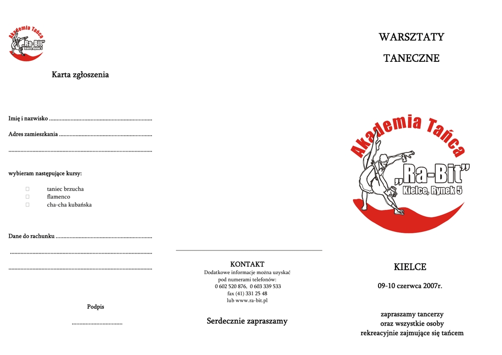 WARSZTATY TANECZNE Karta zgłoszenia Imię i nazwisko .................................................................... Adres zamieszkania .............................................................. ................................................................................................ wybieram następujące kursy: taniec brzucha flamenco cha-cha kubańska Dane do rachunku ................................................................ ............................................................................................... ................................................................................................ KONTAKT Dodatkowe informacje można uzyskać pod numerami telefonów: 0 602 520 876, 0 603 339 533 fax (41) 331 25 48 lub www.ra-bit.pl KIELCE 09-10 czerwca 2007r. Podpis ................................. Serdecznie zapraszamy zapraszamy tancerzy oraz wszystkie osoby rekreacyjnie zajmujące się tańcem Miejsce warsztatów: Warsztaty prowadzić będą: „Samira” (Anna Mendak) – taniec brzucha Anna Mendak – flamenco Bartosz Penkala - cha-cha kubańska cha-cha kubańska Koszty dydaktyczne: Bartosz Penkala taniec brzucha flamenco Choreograf, instruktor tańca towarzyskiego, cheerleadingu oraz tańców latynoskich, właściciel Studia Muzyczno-Artystycznego „BIT”, Prezes Polskiego Stowarzyszenia Cheerleaders, twórca konwencji tanecznej – Latino opartej na połączeniu tańców latynoskich tj. salsy, marengue, rumby, cha-chy z elemantami tańca jazzowego, funky - jazz, hip-hop. Swoją przygodę z tańcem rozpoczął mając 5 lat jako tancerz tańca towarzyskiego. Swoje umiejętności rozwijał pod okiem czołowych pedagogów z Włoch, Anglii, Niemiec, Portugalii i Polski. Pracuje jako konsultant i choreograf z zespołami dziecięcymi i młodzieżowymi a także prowadzi regularne lekcje tańca i warsztaty. Wykłada również na kursach dla nauczycieli i instruktorów. 1 kurs – 60 zł 2 kursy – 90 zł 3 kursy – 120 zł • • • wraz z potwierdzeniem dokonania wpłaty w nieprzekraczalnym terminie tj. do 04.06.2007r. „SAMIRA” –Anna Mendak Tancerka brzucha i flamenco. Swoją przygodę z tańcem rozpoczęła jeszcze jako dziecko. Tańca flamenco uczyła się podczas licznych kursów prowadzonych w Polsce i Hiszpanii ale przede wszystkim pracując indywidualnie oraz pobierając lekcje u cenionych artystów jak: Carmen de Torres, Juan Polvillo, Ana Maria Amahi, Araceli de Alcala, Adela Campallo, El Torombo. Na co dzień jest tancerką znanej polskiej grupy Danza del Fuego oraz Rumbero Flamenco. Taniec orientalny w stylu egipskim kształciła pod okiem Rosjanki Elwiry Isypowej światowej brązowej medalistki i Elwiry Janitzki z Berlina, a także podczas wyjazdów do Turcji i Hiszpanii. Na co dzień występuje solowo i w duecie z Fakirem jako „Samira”. Ilość miejsc ograniczona O przyjęciu decyduje kolejność zgłoszeń Karty zgłoszeń należy dostarczyć: *(lub) - do siedziby Akademii Tańca „Ra-Bit” - za pośrednictwem poczty na adres: Studio Muzyczno-Artystyczne „BIT” 25-430 Kielce ul. Krasickiego 16/16 - fax-em na numer (41) 331 25 48 Plan warsztatów: • Sobota 09 czerwiec 2007r. 11:00 – 12:00 12:15 – 13:15 13:30 – 14:30 16:00 – 17:00 17:15 – 18:15 Niedziela 10 czerwiec 2007r. 10:00 – 11:00 11:15 – 12:15 12:30 – 13:30 15:00 – 16:00 cha-cha kubańska taniec brzucha taniec brzucha cha-cha kubańska flamenco Studio Muzyczno-Artystyczne „BIT” KREDYT BANK o. KIELCE: 85 1500 1458 1214 5003 3014 0000 z dopiskiem „warsztaty taneczne” • taniec brzucha flamenco flamenco cha-cha kubańska Wpłaty można dokonywać: *(lub) - w siedzibie Akademii Tańca „Ra-Bit” - na konto bankowe: • W przypadku rezygnacji ze szkolenia po dokonaniu rezerwacji miejsc organizator zastrzega sobie prawo do zatrzymania 30% kwoty. Obowiązuje całkowity zakaz filmowania zajęć.