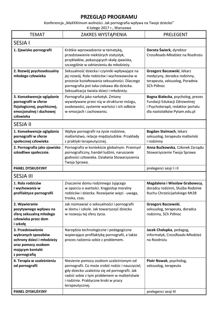 PRZEGLĄD PROGRAMU Konferencja „MaXXXimum wolności. Jak pornografia wpływa na Twoje dziecko” 4 lutego 2017 r., Warszawa TEMAT ZAKRES WYSTĄPIENIA PRELEGENT SESJA I 1. Zjawisko pornografii Krótkie wprowadzenie w tematykę, przedstawienie niektórych statystyk, przykładów, pokazujących skalę zjawiska, szczególnie w odniesieniu do młodzieży. Dorota Świerk, dyrektor CrossRoads-Młodzież na Rozdrożu 2. Rozwój psychoseksualny młodego człowieka Seksualność dziecka i czynniki wpływające na jej rozwój. Rola rodziców i wychowawców w procesie kształtowania seksualności. Dlaczego pornografia jest taka ciekawa dla dziecka. Seksualizacja świata dzieci i młodzieży. Grzegorz Baczewski, lekarz medycyny, doradca rodzinny, terapeuta, seksuolog, Poradnia SCh Północ 3. Konsekwencje oglądanie pornografii w sferze fizjologicznej, psychicznej, emocjonalnej i duchowej człowieka Pornografia jako narkotyk. Zmiany wywoływane przez nią w strukturze mózgu, osobowości, systemie wartości i ich odbicie w emocjach i zachowaniu. Bogna Białecka, psycholog, prezes Fundacji Edukacji Zdrowotnej i Psychoterapii, redaktor portalu dla nastolatków Pytam.edu.pl 1. Konsekwencje oglądania pornografii w sferze społecznej człowieka Wpływ pornografii na życie rodzinne, małżeństwo, relacje międzyludzkie. Przykłady z praktyki terapeutycznej. Bogdan Stelmach, lekarz seksuolog, terapeuta małżeński i rodzinny 2. Pornografia jako zjawisko szkodliwe społecznie. Pornografia w kontekście globalnym. Przemysł pornograficzny, handel ludźmi, naruszanie godności człowieka. Działania Stowarzyszenia Twoja Sprawa. Anna Bućkowska, Członek Zarządu Stowarzyszenie Twoja Sprawa SESJA II PANEL DYSKUSYJNY prelegenci sesji I i II SESJA III 1. Rola rodziców i wychowania w profilaktyce pornografii Znaczenie domu rodzinnego żyjącego w oparciu o wartości. Kręgosłup moralny rodziców i dziecka. Rozwijanie więzi - uwaga, troska, czas. Magdalena i Wiesław Grabowscy, doradcy rodzinni, Służba Rodzinie Ruchu Chrześcijańskiego Mt28 2. Wywieranie pozytywnego wpływu na sferę seksualną młodego człowieka przez dom i szkołę Jak rozmawiać o seksualności i pornografii w domu i szkole. Jak towarzyszyć dziecku w rozwoju tej sfery życia. Grzegorz Baczewski, seksuolog, terapeuta, doradca rodzinny, SCh Północ 3. Przedstawienie wybranych sposobów ochrony dzieci i młodzieży oraz pomocy osobom mającym kontakt z pornografią Narzędzia technologiczne i pedagogiczne wspierające profilaktykę pornografii, a także proces radzenia sobie z problemem. Jacek Chałupka, pedagog, informatyk, CrossRoads-Młodzież na Rozdrożu 4. Terapia w uzależnieniu od pornografii Niesienie pomocy osobom uzależnionym od pornografii. Co może zrobić rodzic i nauczyciel, gdy dziecko uzależnia się od pornografii. Jak radzić sobie z tym problemem w małżeństwie i rodzinie. Praktyczne kroki w pracy terapeutycznej. Piotr Nowak, psycholog, seksuolog, terapeuta PANEL DYSKUSYJNY prelegenci sesji III