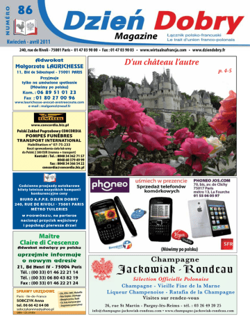 86 Magazine Kwiecień - avril 2011 240, rue de Rivoli - 75001 Paris • 01 47 03 90 00 • Fax : 01 47 03 90 03 • www.wirtualnafrancja.com • www.dziendobry.fr adwokat Małgorzata LaUrIChESSE 11, Bld de Sébastopol - 75001 parIS przyjmuje tylko na umówione spotkanie (Mówimy po polsku) D'un château l'autre p. 4-5 Kom. : 06 89 51 01 23 Fax : 01 80 27 00 96 www.laurichesse-avocat-avotreecoute.com e-mail : [email protected] www.concordia.biz.pl Polski Zakład Pogrzebowy CONCORDIA POMPES FuNÈBRES TRANSPORT INTERNATIONAL Habilitation n° 07-75-233 Koszt sprowadzenia ciała lub urny do Polski 2 380 EUR (trumna + transport) Kontakt : Tel. : 0048 34 362 71 57 0048 60 379 49 99 fax : 0048 34 366 54 22 [email protected] codzienne przejazdy autokarowe bilety lotnicze wszystkich kompanii konkurencyjne ceny BIuRO A.F.P.E. DZIEN DOBRY 240, RuE DE RIVOLI - 75001 PARIS MéTRO TuILERIES w PODWóRZu , na parterze nacisnąć przycisk wejściowy i popchnąć pierwsze drzwi Maître claire di crescenzo adwokat mówiàcy po polsku uprzejmie informuje o nowym adresie 21, Bd henri IV - 75004 paris Tél. : (00 33) 01 46 22 21 14 Tél. : (00 33) 06 80 43 82 19 Fax : (00 33) 01 46 22 21 24 Paris - Ile-de-France SObcZYK Anna tel. 06 66 42 64 08 [email protected] SIREN : 524 219 854 lle - CFA, RSA, CMU, Mutue - Pôle Emploi, Chômage - Ubezpieczenia, Bank - CV, listy motywacyjne cy - znajomość prawa pra Champagne Jackowiak - Rondeau Sélection Officielle Polonaise Champagne - Vieille Fine de la Marne Liqueur Champenoise - Ratafia de la Champagne Visites sur rendez-vous 26, rue St Martin - Pargny-lès-Reims - tél. : 03 26 49 20 25 [email protected] • www.champagne-jackowiak-rondeau.com Polska, Polska... cała Polska ! Dzięki A.F.P.E. Dzień Dobry - najlepsze linie lotnicze biorą Was pod swoje skrzydła ! PARIS - WARSZAWA tél. : 01 47 03 90 02 PARIS CDG - Krakow PARIS - RZESZOW (via WARSZAWA) WARSZAWA - PARIS tél. : 01 47 03 90 02 KRAKOW - PARIS CDG RZESZOW - PARIS PARIS - WARSZAWA tél. : 01 47 03 90 00 WARSZAWA - PARIS tél. : 01 47 03 90 00 PARIS CDG - KRAKOW PARIS CDG - KRAKOW PARIS CDG - KRAKOW (1-3-5) (6) (7) LUNDI PONIEDZ. (1) MARDI WTOREK (2) MERCREDI ŚRODA (3) JEUDI CZWARTEK (4) VENDREDI PIĄTEK (5) SAMEDI SOBOTA (6) DIMANCHE NIEDZIELA (7) 07:15 - 09:35 12:00 - 14:20 16:30 - 18:50 19:30 - 21:50 11:00 - 13:20 07:15 - 13:30 12:00 - 17:40 08:40 - 11:10 13:00 - 15:30 16:15 - 18:40 19:55 - 22:20 07:55 - 10:10 09:05 - 15:30 14:00 - 18:40 18:05 - 22:20 09:35 - 11:50 12:40 - 14:55 15:55 - 18:10 18:40 - 20:55 07:05 - 09:30 12:45 - 15:10 15:45 - 18:10 19:05 - 21:30 07:15 - 09:35 12:00 - 14:20 19:30 - 21:50 11:00 - 13:20 07:15 - 13:30 12:00 - 17:40 08:40 - 11:10 13:00 - 15:30 16:15 - 18:40 07:55 - 10:10 09:05 - 15:30 14:00 - 18:40 09:35 - 11:50 12:40 - 14:55 15:55 - 18:10 18:40 - 20:55 07:05 - 09:30 12:45 - 15:10 15:45 - 18:10 19:05 - 21:30 12:00 - 14:20 16:30 - 18:50 19:30 - 21:50 11:00 - 13:20 12:00 - 17:30 08:40 - 11:10 13:00 - 15:30 16:15 - 18:40 19:55 - 22:20 07:55 - 10:10 09:05 - 15:30 14:00 - 18:40 18:05 - 22:20 09:35 - 11:50 12:40 - 14:55 15:55 - 18:10 18:40 - 20:55 07:05 - 09:30 12:45 - 15:10 15:45 - 18:10 19:05 - 21:30 07:15 - 09:35 12:00 - 14:20 16:30 - 18:50 19:30 - 21:50 11:00 - 13:20 07:15 - 13:20 12:00 - 17:30 08:40 - 11:10 13:00 - 15:30 16:15 - 18:40 19:55 - 22:20 07:55 - 10:10 09:05 - 15:30 14:00 - 18:40 18:05 - 22:20 09:35 - 11:50 12:40 - 14:55 15:55 - 18:10 18:40 - 20:55 07:05 - 09:30 12:45 - 15:10 15:45 - 18:10 19:05 - 21:30 07:15 - 09:35 12:00 - 14:20 16:30 - 18:50 19:30 - 21:50 11:00 - 13:20 07:15 - 13:30 12:00 - 17:40 08:40 - 11:10 13:00 - 15:30 16:15 - 18:40 19:55 - 22:20 07:55 - 10:10 09:05 - 15:30 14:00 - 18:40 18:05 - 22:20 09:35 - 11:50 12:40 - 14:55 15:55 - 18:10 18:40 - 20:55 07:05 - 09:30 12:45 - 15:10 15:45 - 18:10 19:05 - 21:30 07:15 - 09:35 12:00 - 14:20 19:30 - 21:50 11:00 - 13:20 07:15 - 13:30 12:00 - 17:40 08:40 - 11:10 16:15 - 18:40 07:55 - 10:10 14::00 - 18:40 09:35 - 11:50 12:40 - 14:55 18:40 - 20:55 07:05 - 09:30 12:45 - 15:10 15:45 - 18:10 - 12:00 - 14:20 19:30 - 21:50 11:00 - 13:20 12:00 - 17:40 08:40 - 11:10 13:00 - 15:30 16:15 - 18:40 19:55 - 22:20 07:55 - 10:10 09:05 - 15:30 14:00 - 18:40 18:05 - 22:20 09:35 - 11:50 12:40 - 14:55 15:55 - 18:10 18:40 - 20:55 07:05 - 09:30 12:45 - 15:10 15:45 - 18:10 19:05 - 21:30 11:30 - 13:45 11:40 - 13:55 8:00 - 10:15 KRAKOW - PARIS CDG KRAKOW - PARIS KRAKOW - PARIS CDG WARSZAWA - BEAUVAIS (1-3-4-5-7) 6:00 - 8:20 KATOWICE-BEAUVAIS (2-4-6) 6:10 - 8:15 POZNAN - BEAUVAIS (1-5) 11:40 - 13:40 WROCLAW - BEAUVAIS (1-3-5) 15:50 - 17:45 GDANSK - BEAUVAIS (1-5) 10:30 - 12:40 (1-3-5) (6) (7) 14:15 - 16:25 14:15 - 16:25 10:45 - 12:55 BEAUVAIS-WARSZAWA (1-3-4-5-7) 08:50 - 11:05 BEAUVAIS - KATOWICE (2-4-6) 8:45 - 10:45 BEAUVAIS - POZNAN (1-5) 14:10 - 16:00 BEAUVAIS - WROCLAW (1-3-5) 18:15 - 20:10 BEAUVAIS-GDANSK (1-5) 13:10 - 15:10 Au départ de PARIS cDg vers tous les aéroports de Pologne Warszawa - Poznan - Krakow - Katowice Rzeszow - Gdansk - Wroclaw - Szczecin Profitez toute l'année des meilleurs tarifs et promotions mais aussi aucun supplément pour 1 bagage en cabine (6 kg) et jusqu'à 20 kg de bagages en soute par billet contactez le 01 47 03 90 02 Bilety do nabycia w Biurze A.F.P.E. Dzień Dobry 240, rue de Rivoli 75001 Paris La SEINE Avec le télé-règlement par carte de crédit RECEVEZ VOS BILLETS SOUS 2 JOURS ! (RDC - cour, parter w podwórzu) nacisnąć przycisk wejściowy i popchnąć pierwsze drzwi M Concorde M métro Tuileries 2 Rue CAMBON 240, Rue de RIVOLI métro Tuileries Tél. : 01 47 03 90 00 01 47 03 90 02 Place de la CONCORDE Dzień Dobry www.wirtualnafrancja.com Polska na wyciągnięcie ręki ! Tanie przeloty do Polski w biurze A.F.P.E. 240, rue de Rivoli - 75001 Paris Tel. : 01 47 03 90 02 biuro czynne codziennie od 9:00 do 18:00 biuro zamknięte w soboty Kupując bilet wcześniej oszczędzasz ! PŁACĄC KARTĄ KREDYTOWĄ OTRZYMASZ BILET TEGO SAMEGO DNIA za pośrednictwem e-mail, faksu lub pocztą nazajutrz. Tel.
