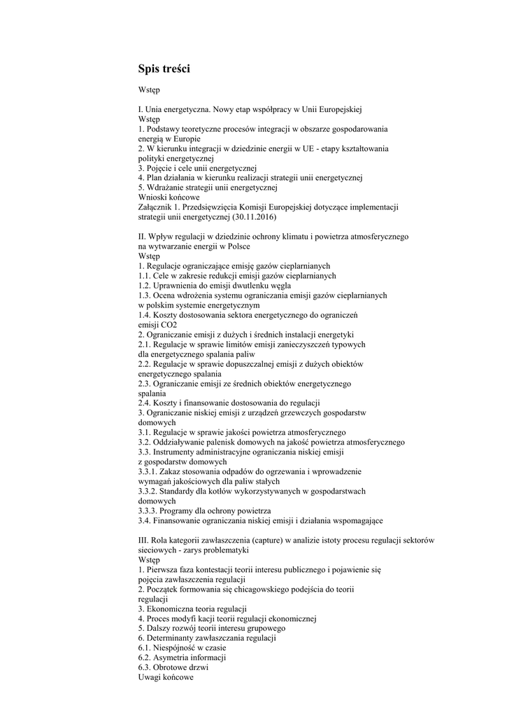 Spis treści Wstęp I. Unia energetyczna. Nowy etap współpracy w Unii Europejskiej Wstęp 1. Podstawy teoretyczne procesów integracji w obszarze gospodarowania energią w Europie 2. W kierunku integracji w dziedzinie energii w UE - etapy kształtowania polityki energetycznej 3. Pojęcie i cele unii energetycznej 4. Plan działania w kierunku realizacji strategii unii energetycznej 5. Wdrażanie strategii unii energetycznej Wnioski końcowe Załącznik 1. Przedsięwzięcia Komisji Europejskiej dotyczące implementacji strategii unii energetycznej (30.11.2016) II. Wpływ regulacji w dziedzinie ochrony klimatu i powietrza atmosferycznego na wytwarzanie energii w Polsce Wstęp 1. Regulacje ograniczające emisję gazów cieplarnianych 1.1. Cele w zakresie redukcji emisji gazów cieplarnianych 1.2. Uprawnienia do emisji dwutlenku węgla 1.3. Ocena wdrożenia systemu ograniczania emisji gazów cieplarnianych w polskim systemie energetycznym 1.4. Koszty dostosowania sektora energetycznego do ograniczeń emisji CO2 2. Ograniczanie emisji z dużych i średnich instalacji energetyki 2.1. Regulacje w sprawie limitów emisji zanieczyszczeń typowych dla energetycznego spalania paliw 2.2. Regulacje w sprawie dopuszczalnej emisji z dużych obiektów energetycznego spalania 2.3. Ograniczanie emisji ze średnich obiektów energetycznego spalania 2.4. Koszty i finansowanie dostosowania do regulacji 3. Ograniczanie niskiej emisji z urządzeń grzewczych gospodarstw domowych 3.1. Regulacje w sprawie jakości powietrza atmosferycznego 3.2. Oddziaływanie palenisk domowych na jakość powietrza atmosferycznego 3.3. Instrumenty administracyjne ograniczania niskiej emisji z gospodarstw domowych 3.3.1. Zakaz stosowania odpadów do ogrzewania i wprowadzenie wymagań jakościowych dla paliw stałych 3.3.2. Standardy dla kotłów wykorzystywanych w gospodarstwach domowych 3.3.3. Programy dla ochrony powietrza 3.4. Finansowanie ograniczania niskiej emisji i działania wspomagające III. Rola kategorii zawłaszczenia (capture) w analizie istoty procesu regulacji sektorów sieciowych - zarys problematyki Wstęp 1. Pierwsza faza kontestacji teorii interesu publicznego i pojawienie się pojęcia zawłaszczenia regulacji 2. Początek formowania się chicagowskiego podejścia do teorii regulacji 3. Ekonomiczna teoria regulacji 4. Proces modyfi kacji teorii regulacji ekonomicznej 5. Dalszy rozwój teorii interesu grupowego 6. Determinanty zawłaszczania regulacji 6.1. Niespójność w czasie 6.2. Asymetria informacji 6.3. Obrotowe drzwi Uwagi końcowe Bibliografia ISBN: 978-83-8017-138-1