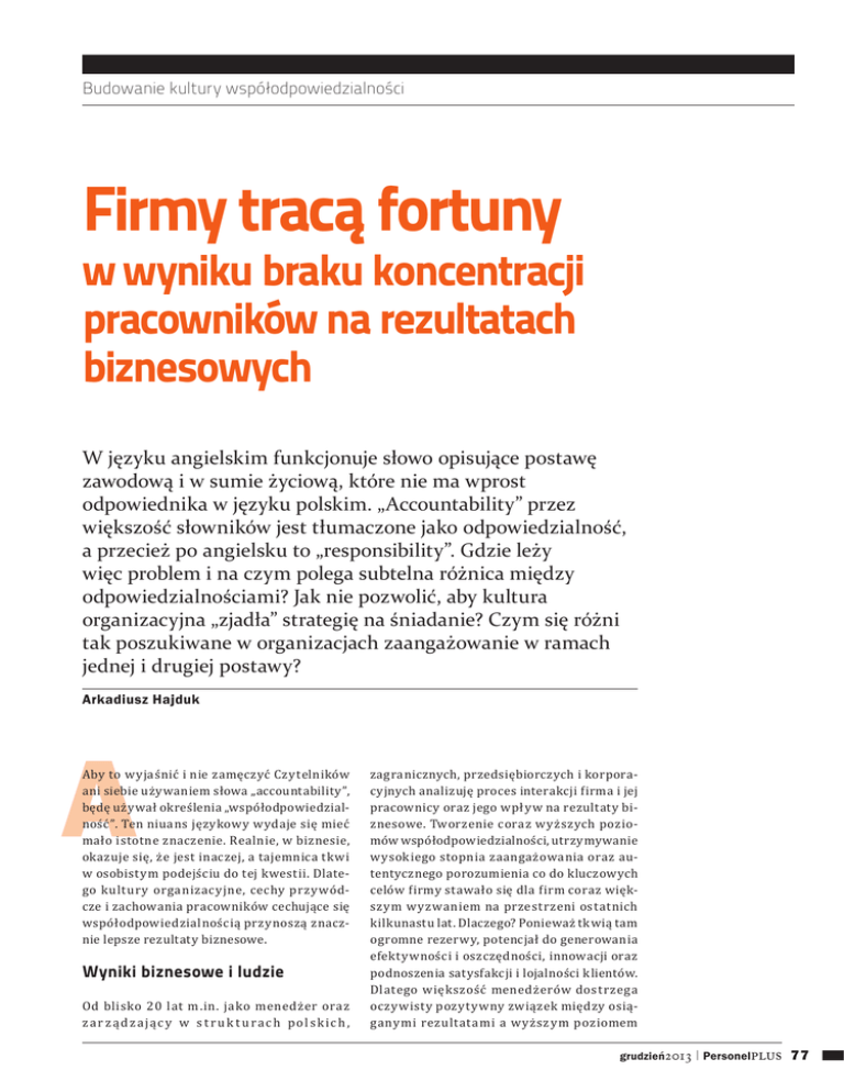 Budowanie kultury współodpowiedzialności Firmy tracą fortuny w wyniku braku koncentracji pracowników na rezultatach biznesowych W języku angielskim funkcjonuje słowo opisujące postawę zawodową i w sumie życiową, które nie ma wprost odpowiednika w języku polskim. „Accountability” przez większość słowników jest tłumaczone jako odpowiedzialność, a przecież po angielsku to „responsibility”. Gdzie leży więc problem i na czym polega subtelna różnica między odpowiedzialnościami? Jak nie pozwolić, aby kultura organizacyjna „zjadła” strategię na śniadanie? Czym się różni tak poszukiwane w organizacjach zaangażowanie w ramach jednej i drugiej postawy? Arkadiusz Hajduk A Aby to wyjaśnić i nie zamęczyć Czytelników ani siebie używaniem słowa „accountability”, będę używał określenia „współodpowiedzialność”. Ten niuans językowy wydaje się mieć mało istotne znaczenie. Realnie, w biznesie, okazuje się, że jest inaczej, a tajemnica tkwi w osobistym podejściu do tej kwestii. Dlatego kultury organizacyjne, cechy przy wódcze i zachowania pracowników cechujące się współodpowiedzialnością przynoszą znacznie lepsze rezultaty biznesowe. Wyniki biznesowe i ludzie Od blisko 20 lat m.in. jako menedżer oraz zar ządzając y w st r uk t urach polsk ich, zagranicznych, przedsiębiorczych i korporacyjnych analizuję proces interakcji firma i jej pracownicy oraz jego wpływ na rezultaty biznesowe. Tworzenie coraz wyższych poziomów współodpowiedzialności, utrzymywanie wysokiego stopnia zaangażowania oraz autentycznego porozumienia co do kluczowych celów firmy stawało się dla firm coraz większym wyzwaniem na przestrzeni ostatnich kilkunastu lat. Dlaczego? Ponieważ tkwią tam ogromne rezerwy, potencjał do generowania efektywności i oszczędności, innowacji oraz podnoszenia satysfakcji i lojalności klientów. Dlatego większość menedżerów dostrzega oczywisty pozytywny związek między osiąganymi rezultatami a w yższym poziomem grudzień2013 | Personelplus 77 HRM Budowanie kultury współodpowiedzialności ►► Pułapki w procesie budowania współodpowiedzialności •Wykonywanie pracy kontra osiąganie rezultatów – większość liderów dość dobrze potrafi przekazać odpowiedzialność dla różnych poziomów działań (czyt. delegowanie zadań). Rzadkością są jednak przywódcy, którzy tworzą współodpowiedzialność wokół wyników organizacyjnych. •Eksternalizacja kontra internalizacja potrzeby zmian – pracownicy mają tendencję do eksternalizacji potrzeby zmian. Większość ludzi zazwyczaj dość dobrze potrafi określić, że istnieje jakiś problem. Na przykład: „Wolałabym, żeby zarząd bardziej reagował na to, co się dzieje”. Jednak z większym trudem przychodzi im określenie siebie samych w ramach tych kwestii. •Zrzucanie winy na innych kontra podjęcie działania – natura ludzka skłania do zrzucania winy na innych w momencie, gdy sprawy idą źle. W przypadku niektórych organizacji gra w zrzucanie winy jest tak rozpowszechniona, że staje się rzeczą nie tylko akceptowaną, lecz wręcz oczywistą w momencie, w którym jednostka lub zespół nie osiąga oczekiwanych wyników. •Wydawanie poleceń kontra angażowanie ludzi – kultura oparta na: „Powiedz mi, co mam zrobić” (czyt. delegowanie w górę) to kultura, w której ludzie zostawiają mózgi przed drzwiami, podpisują listę obecności i odhaczają działania określające ich pracę. Taka mentalność zorientowana na działania jest wyprana z jakiejkolwiek postawy proaktywności, ponieważ: „Mówią mi, co mam zrobić!”. •Niewłaściwa definicja i rozumienie współodpowiedzialności – większość osób ma przekonanie, że odpowiedzialność pojawia się dopiero wtedy, gdy coś idzie nie tak lub gdy ktoś inny chce dociec przyczyn problemu – wszystko po to, by obarczyć kogoś winą i wskazać palcem. W rezultacie koncepcja odpowiedzialności w większości firm przyjęła ciężki, krytyczny odcień o zabarwieniu negatywnym. Definicja Webstera: „Posiadający obowiązek składania raportów, wyjaśnienia lub usprawiedliwienia; będący osobą odpowiadającą za coś przed innymi”. Zauważmy, że definicja zaczyna się od słów „posiadający obowiązek”, co sugeruje niewielki wybór w tej kwestii. Owa zorientowana na wyznania i pozbawiona mocy definicja sugeruje to, co wszyscy obserwujemy – odpowiedzialność – postrzegane jest jako rezultat złych wyników. Nic zatem dziwnego, że ludzie tak bardzo starają się uniknąć odpowiedzialności. zaangażowania i koncentracji na wynikach w ich zespołach. Firmy wydają mnóstwo pieniędzy i angażują sporo swojego czasu na badania satysfakcji i stopnia zaangażowania, na narzędzia komunikacji wewnętrznej, wyjazdy integracyjne, świadczenia dodatkowe, zarządzanie międzypokoleniowe czy wprowadzanie modeli przywództwa typu sytuacyjnego lub angażującego, które w efekcie mają zapewnić większą współodpowiedzialność pracowników za kluczowe cele ich zespołu i całej organizacji. Rzeczywistość jest jednak inna. Wielokrotnie byłem świadkiem sytuacji związanych z marnowaniem czasu, zasobów, arogancją menedżerów, pasywną postawą pracowników, mnóstwem niepotrzebnych konfliktów, niską zdolnością do implementacji planów, utopionymi kosztami czy niedokończonymi projektami. Stawka jest często bardzo wysoka. Wydaje się, że kolejnych kosztów operacyjnych nie da się już ciąć, poszczególne działy wołają o środki 78 Personelplus | grudzień2013 na inwestycje, konkurencja nie śpi, trudno nadążyć za postępem technologicznym. W firmach mają miejsce trwające w nieskończoność spotkania, dużo się rozmawia, wymyśla i planuje, a mało następnie wykonuje. Atmosfera się zagęszcza, a „firmowa gra”, nazywana wiktymizacją lub szukaniem winnych oraz odpowiedzialnych, staje się normą – instytucjonaliz