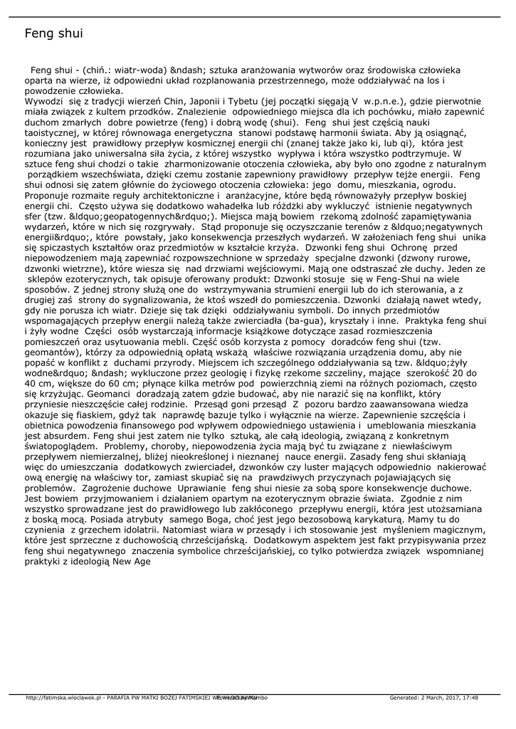 Feng shui Feng shui - (chiń.: wiatr-woda) – sztuka aranżowania wytworów oraz środowiska człowieka oparta na wierze, iż odpowiedni układ rozplanowania przestrzennego, może oddziaływać na los i powodzenie człowieka. Wywodzi się z tradycji wierzeń Chin, Japonii i Tybetu (jej początki sięgają V w.p.n.e.), gdzie pierwotnie miała związek z kultem przodków. Znalezienie odpowiedniego miejsca dla ich pochówku, miało zapewnić duchom zmarłych dobre powietrze (feng) i dobrą wodę (shui). Feng shui jest częścią nauki taoistycznej, w której równowaga energetyczna stanowi podstawę harmonii świata. Aby ją osiągnąć, konieczny jest prawidłowy przepływ kosmicznej energii chi (znanej także jako ki, lub qi), która jest rozumiana jako uniwersalna siła życia, z której wszystko wypływa i która wszystko podtrzymuje. W sztuce feng shui chodzi o takie zharmonizowanie otoczenia człowieka, aby było ono zgodne z naturalnym porządkiem wszechświata, dzięki czemu zostanie zapewniony prawidłowy przepływ tejże energii. Feng shui odnosi się zatem głównie do życiowego otoczenia człowieka: jego domu, mieszkania, ogrodu. Proponuje rozmaite reguły architektoniczne i aranżacyjne, które będą równoważyły przepływ boskiej energii chi. Często używa się dodatkowo wahadełka lub różdżki aby wykluczyć istnienie negatywnych sfer (tzw. “geopatogennych”). Miejsca mają bowiem rzekomą zdolność zapamiętywania wydarzeń, które w nich się rozgrywały. Stąd proponuje się oczyszczanie terenów z “negatywnych energii”, które powstały, jako konsekwencja przeszłych wydarzeń. W założeniach feng shui unika się spiczastych kształtów oraz przedmiotów w kształcie krzyża. Dzwonki feng shui Ochronę przed niepowodzeniem mają zapewniać rozpowszechnione w sprzedaży specjalne dzwonki (dzwony rurowe, dzwonki wietrzne), które wiesza się nad drzwiami wejściowymi. Mają one odstraszać złe duchy. Jeden ze sklepów ezoterycznych, tak opisuje oferowany produkt: Dzwonki stosuje się w Feng-Shui na wiele sposobów. Z jednej strony służą one do wstrzymywania strumieni energii lub do ich sterowania, a z drugiej zaś strony do sygnalizowania, że ktoś wszedł do pomieszczenia. Dzwonki działają nawet wtedy, gdy nie porusza ich wiatr. Dzieje się tak dzięki oddziaływaniu symboli. Do innych przedmiotów wspomagających przepływ energii należą także zwierciadła (ba-gua), kryształy i inne. Praktyka feng shui i żyły wodne Części osób wystarczają informacje książkowe dotyczące zasad rozmieszczenia pomieszczeń oraz usytuowania mebli. Część osób korzysta z pomocy doradców feng shui (tzw. geomantów), którzy za odpowiednią opłatą wskażą właściwe rozwiązania urządzenia domu, aby nie popaść w konflikt z duchami przyrody. Miejscem ich szczególnego oddziaływania są tzw. “żyły wodne” – wykluczone przez geologię i fizykę rzekome szczeliny, mające szerokość 20 do 40 cm, większe do 60 cm; płynące kilka metrów pod powierzchnią ziemi na różnych poziomach, często się krzyżując. Geomanci doradzają zatem gdzie budować, aby nie narazić się na konflikt, który przyniesie nieszczęście całej rodzinie. Przesąd goni przesąd Z pozoru bardzo zaawansowana wiedza okazuje się fiaskiem, gdyż tak naprawdę bazuje tylko i wyłącznie na wierze. Zapewnienie szczęścia i obietnica powodzenia finansowego pod wpływem odpowiedniego ustawienia i umeblowania mieszkania jest absurdem. Feng shui jest zatem nie tylko sztuką, ale całą ideologią, związaną z konkretnym światopoglądem. Problemy, choroby, niepowodzenia życia mają być tu związane z niewłaściwym przepływem niemierzalnej, bliżej nieokreślonej i nieznanej nauce energii. Zasady feng shui skłaniają więc do umieszczania dodatkowych zwierciadeł, dzwonków czy luster mających odpowiednio nakierować ową energię na właściwy tor, zamiast skupiać się na prawdziwych przyczynach pojawiających się problemów. Zagrożenie duchowe Uprawianie feng shui niesie za sobą spore konsekwencje duchowe. Jest bowiem przyjmowaniem i działaniem opartym na ezoterycznym obrazie świata. Zgodnie z nim wszystko sprowadzane jest do prawidłowego lub zakłóconego przepływu energii, która jest utożsamiana z boską mocą. Posiada atrybuty samego Boga, choć jest jego bezosobową karykaturą. Mamy tu do czynienia z grzechem idolatrii. Natomiast wiara w przesądy i ich stosowanie jest myśleniem magicznym, które jest sprzeczne z duchowością chrześcijańską. Dodatkowym aspektem jest fakt przypisywania przez feng shui negatywnego znaczenia symbolice chrześcijańskiej, co tylko potwierdza związek wspomnianej praktyki z ideologią New Age http://fatimska.wloclawek.pl - PARAFIA PW MATKI BOŻEJ FATIMSKIEJ WE Powered WŁOCŁAWKU by Mambo Generated: 2 March, 2017, 17:48