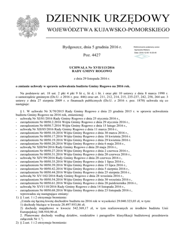 DZIENNIK URZĘDOWY WOJEWÓDZTWA KUJAWSKO-POMORSKIEGO Bydgoszcz, dnia 5 grudnia 2016 r. Elektronicznie podpisany przez: Agnieszka Makara Poz. 4427 Data: 2016-12-05 10:20:45 UCHWAŁA Nr XVII/113/2016 RADY GMINY ROGOWO z dnia 29 listopada 2016 r. o zmianie uchwały w sprawie uchwalenia budżetu Gminy Rogowo na 2016 rok. Na podstawie art. 18 ust. 2 pkt 4 pkt 9 lit c, lit d, i lit. i oraz pkt 10 ustawy z dnia 8 marca 1990 r. o samorządzie gminnym (Dz.U. z 2016 r. poz. 446) oraz art. 211, 212, 214, 215, 235-237, 242, 258, 264 ust. 3 ustawy z dnia 27 sierpnia 2009 r. o finansach publicznych (Dz.U. z 2016 r. poz. 1870) uchwala się co następuje: § 1. W uchwale Nr X/70/2015 Rady Gminy Rogowo z dnia 23 grudnia 2015 r. w sprawie uchwalenia budżetu Gminy Rogowo na 2016 rok, zmienionej: - uchwałą Nr XI/81/2016 Rady Gminy Rogowo z dnia 25 stycznia 2016 r., - zarządzeniem Nr 0050.2.2016 Wójta Gminy Rogowo z dnia 29 stycznia 2016 r., - zarządzeniem Nr 0050.7.2016 Wójta Gminy Rogowo z dnia 15 lutego 2016 r., - uchwałą Nr XII/85/2016 Rady Gminy Rogowo z dnia 11 marca 2016 r., - zarządzeniem Nr 0050.10.2016 Wójta Gminy Rogowo z dnia 30 marca 2016 r., - zarządzeniem Nr 0050.17.2016 Wójta Gminy Rogowo z dnia 18 kwietnia 2016 r. - zarządzeniem Nr 0050.19.2016 Wójta Gminy Rogowo z dnia 29 kwietnia 2016 r. - zarządzeniem Nr 0050.20.2016 Wójta Gminy Rogowo z dnia 6 maja 2016 r., - uchwałą Nr XIII/94/2016 Rady Gminy Rogowo z dnia 20 maja 2016 r., - zarządzeniem Nr 0050.27.2016 Wójta Gminy Rogowo z dnia 2 czerwca 2016 r., - zarządzeniem Nr 0050.31.2016 Wójta Gminy Rogowo z dnia 20 czerwca 2016 r., - uchwałą Nr XIV/99/2016 Rady Gminy Rogowo z dnia 28 czerwca 2016 r., - zarządzeniem Nr 0050.35.2016 Wójta Gminy Rogowo z dnia 1 lipca 2016 r., - zarządzeniem Nr 0050.39.2016 Wójta Gminy Rogowo z dnia 15 lipca 2016 r., - zarządzeniem Nr 0050.42.2016 Wójta Gminy Rogowo z dnia 5 sierpnia 2016 r., - zarządzeniem Nr 0050.44.2016 Wójta Gminy Rogowo z dnia 25 sierpnia 2016 r., - uchwałą Nr XV/102/2016 Rady Gminy Rogowo z dnia 28 września 2016 r., - zarządzeniem Nr 0050.54.2016 Wójta Gminy Rogowo z dnia 30 września 2016 r., - zarządzeniem Nr 0050.61.2016 Wójta Gminy Rogowo z dnia 28 października 2016 r., - uchwałą Nr XVI/110/2016 Rady Gminy Rogowo z dnia 14 listopada 2016 r., - zarządzeniem Nr 0050.68.2016 Wójta Gminy Rogowo z dnia 23 listopada 2016 r., wprowadza się następujące zmiany: 1) § 1.ust. 1 i 2 otrzymuje brzmienie: „Ustala się łączną kwotę dochodów budżetu na 2016 rok w wysokości 29.040.323,03 zł, w tym: 1) dochody bieżące w kwocie 28.497.953,86 zł; 2) dochody majątkowe w kwocie 542.369,17 zł, w tym realizowanych ze środków budżetu Unii Europejskiej 348.910,90 zł. 2. Planowane dochody według działów, rozdziałów i paragrafów klasyfikacji budżetowej przedstawia załącznik Nr 1.”; 2) § 2.ust. 1 i 2 otrzymuje brzmienie: Dziennik Urzędowy Województwa Kujawsko-Pomorskiego 3) 4) 5) 6) 7) 8) –2– Poz. 4427 „§ 2.1. Ustala się łączną kwotę wydatków budżetu na 2016 rok w wysokości 29.563.626,90 zł, w tym: 1) wydatki bieżące w wysokości 27.562.882,44 zł; 2) wydatki majątkowe w wysokości 2.000.744,46 zł, w tym na programy finansowane z udziałem środków, o których mowa w art. 5 ust. 1 pkt 2 i 3 ustawy o finansach publicznych 501.613,74 zł. 2. Planowane wydatki według działów, rozdziałów i paragrafów klasyfikacji budżetowej przedstawia załącznik Nr 2.”; § 3 ust. 1 i 2 otrzymuje brzmienie: „§ 3.1 Deficyt budżetu w wysokości 523.303,87 zł zostanie sfinansowany przychodami z tytułu: 1) zaciągnięcia kredytu w kwocie 523.303,87 zł. 2. Określa się łączną kwotę planowanych przychodów 1.322.936,87 zł i łączną kwotę planowanych rozchodów 799.633,00 zł,”; § 4 otrzymuje brzmienie: „§ 4. Określa się limit wydatków inwestycyjnych na 2016 rok, zgodnie z załącznikiem Nr 3.”; § 11 otrzymuje brzmienie: „§ 11. Określa się planowane wydatki na realizację zadań wynikających z ustawy o funduszu sołeckim, zgodnie z załącznikiem Nr 4.”; § 12 otrzymuje brzmienie: „§ 12. W budżecie tworzy się rezerwy w wysokości 71.000,00 zł: 1) ogólną w wysokości - 8.433,00 zł; 2) celową w wysokości - 62.567,00 zł z przeznaczeniem na realizację zadań własnych z zakresu zarządzania kryzysowego.”; § 13 otrzymuje brzmienie: „§ 13. Ustala się limity zobowiązań z tytułu emisji papierów wartościowych oraz kredytów i pożyczek zaciąganych na: 1) sfinansowanie przejściowego deficytu budżetu do wysokości 3.000.000,00 zł; 2) sfinansowanie planowanego deficytu budżetu do wysokości 523.303,87 zł; 3) spłatę wcześniej zaciągniętych zobowiązań z tytułu pożyczek i kredytów do wysokości 18.742,13 zł; 4) wyprzedzające finansowanie realizowanych zadań ze środków pochodzących z budżetu Unii Europejskiej do wysokości 348.910,90 zł.”; § 14 otrzymuje brzmienie: „§ 14. Upoważnia się Wójta Gminy do: 1) dokonywania zmian w planie wydatków majątkowych polegających na przesunięciach między paragrafami i rozdziałami w ramach działu z wyłączeniem przesunięć między działami; 2) dokonywania zmian w planie wydatków na uposażenia i wynagrodzenia ze stosunku pracy polegających na przesunięciach między rozdziałami i paragrafami w ramach działu z wyłączeniem przesunięć między działami; 3) lokowania wolnych środków budżetowych na rachunkach bankowych w innych bankach niż bank prowadzący obsługę budżetu gminy; 4) zaciągania kredytów i pożyczek oraz emisji papierów wartościowych na: a) pokrycie występującego w ciągu roku przejściowego deficytu budżetu do wysokości 3.000.000,00 zł, b) sfinansowanie planowanego deficytu budżetu do wysokości 523.303,87 zł, c) spłatę wcześniej zaciągniętych zobowiązań z tytułu emisji papierów wartościowych oraz zaciągniętych pożyczek i kredytów do wysokości 18.742,13 zł, d) wypr