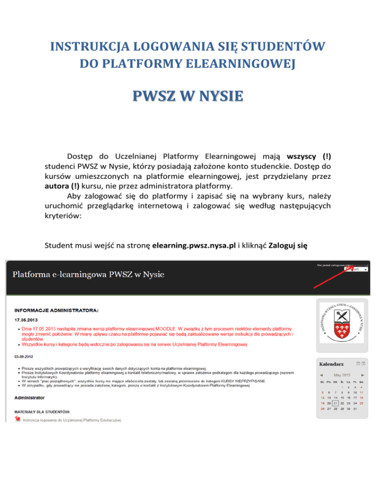 INSTRUKCJA LOGOWANIA SIĘ STUDENTÓW DO PLATFORMY ELEARNINGOWEJ PWSZ W NYSIE Dostęp do Uczelnianej Platformy Elearningowej mają wszyscy (!) studenci PWSZ w Nysie, którzy posiadają założone konto studenckie. Dostęp do kursów umieszczonych na platformie elearningowej, jest przydzielany przez autora (!) kursu, nie przez administratora platformy. Aby zalogować się do platformy i zapisać się na wybrany kurs, należy uruchomić przeglądarkę internetową i zalogować się według następujących kryteriów: Student musi wejść na stronę elearning.pwsz.nysa.pl i kliknąć Zaloguj się Jako login proszę podać: literkę s oraz numer indeksu (jeżeli student zaczynał studia na naszej uczelni, gdy nie obowiązywał jeszcze e-index) lub legitymacji Jako hasło proszę podać PESEL lub hasło, które student ustawił logując się na indywidualne konto studenckie Przykład: Login : s152314 Hasło: 92110723612 Po wpisaniu danych proszę kliknąć Zaloguj się Kursy oraz kategorie kursów będą widoczne dopiero po zalogowaniu się. UWAGA: Nasz platforma nie umożliwia logowania się jako gość ! Po zalogowaniu się na platformę należy wybrać instytut i prowadzącego, na którego kurs chcemy się zapisać (przykład poniżej). Następnie wybieramy kurs, na który chcemy się zapisać W przypadku, gdy jest to kurs ogólnodostępny lub prowadzący zapisał studenta na kurs, na ekranie pojawi się zawartość tego kursu. Aby jednak być zarejestrowanym uczestnikiem kursu (w przypadku kursu ogólnodostępnego), należy kliknąć w opcję Zapisz mnie na ten kurs Jeżeli wejście do kursu wymaga klucza, musimy taki klucz podać. Klucz podaje studentowi właściciel kursu. Po wpisaniu klucza klikamy w przycisk Zapisz mnie Po zapisaniu się na kurs widzimy materiały umieszczone dla studentów, z których można korzystać. W razie problemów z logowaniem należy skontaktować się z Administratorem platformy lub Biurem Obsługi Informatycznej PWSZ w Nysie.