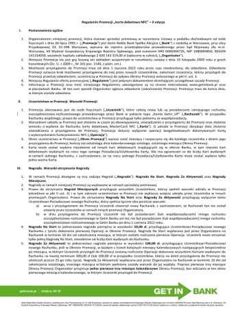 Regulamin Promocji „karta debetowa NFC” – II edycja I. 1. 2. 3. 4. 5. II. 1. 2. 3. 4. III. 1. 2. 3. 4. 5. Postanowienia ogólne Organizatorem niniejszej promocji, która stanowi sprzedaż premiową w rozumieniu Ustawy o podatku dochodowym od osób fizycznych z dnia 26 lipca 1991 r. („Promocja”) jest Getin Noble Bank Spółka Akcyjna („Bank”) z siedzibą w Warszawie, przy ulicy Przyokopowej 33, 01-208 Warszawa, wpisana do rejestru przedsiębiorców prowadzonego przez Sąd Rejonowy dla m.st. Warszawy, XII Wydział Gospodarczy Krajowego Rejestru Sądowego, pod numerem KRS 0000304735, NIP 1080004850, REGON 141334039, wysokość kapitału zakładowego 2 650 143 319,00 zł (opłacony w całości), („Organizator”). Niniejsza Promocja nie jest grą losową ani zakładem wzajemnym w rozumieniu ustawy z dnia 19 listopada 2009 roku o grach hazardowych (Dz. U. z 2009 r., Nr 201 poz. 1540, z późn. zm.). Możliwość przystąpienia do Promocji trwa od dnia 1 stycznia 2015 roku przez czas nieokreślony, do odwołania. Odwołanie Promocji oznacza brak możliwości przystąpienia do niej przez nowych Uczestników, natomiast Uczestnicy, którzy przystąpili do Promocji przed jej odwołaniem, uczestniczą w Promocji do upływu Okresu Promocji wskazanego w pkt II. ust. 3. Niniejszy Regulamin oferty promocyjnej („Regulamin”) jest jedynym dokumentem określającym szczegółowe zasady Promocji. Informacja o Promocji oraz treść niniejszego Regulaminu udostępniane są na stronie internetowej www.getinbank.pl oraz w placówkach Banku. W ten sam sposób Organizator ogłasza odwołanie (zakończenie) Promocji. Promocja trwa do końca dnia, w którym została odwołana. Uczestnictwo w Promocji. Warunki Promocji Promocja skierowana jest do osób fizycznych („Uczestnik”), które założą nowy lub są posiadaczami istniejącego rachunku oszczędnościowo-rozliczeniowego prowadzonego przez Bank w pakiecie typu „Konto Getin UP” („Rachunek”). W przypadku Rachunku wspólnego, prawo do uczestnictwa w Promocji przysługuje tylko jednemu ze współposiadaczy. Warunkiem udziału w Promocji jest złożenie w czasie jej obowiązywania, oświadczenia o przystąpieniu do Promocji oraz złożenie wniosku o wydanie do Rachunku karty debetowej MasterCard NFC („Karta”). O udziale w Promocji decyduje data złożenia oświadczenia o przystąpieniu do Promocji. Promocja dotyczy wyłącznie operacji bezgotówkowych dokonywanych Kartą z wykorzystaniem funkcjonalności NFC („Operacja”). Okres uczestnictwa w Promocji („Okres Promocji”) wynosi sześć miesięcy i rozpoczyna się dla każdego Uczestnika z dniem jego przystąpienia do Promocji, kończy zaś ostatniego dnia kalendarzowego szóstego, ostatniego miesiąca Okresu Promocji. Karta może zostać wydana niezależnie od innych kart debetowych znajdujących się w ofercie Banku, w tym również kart debetowych wydanych na rzecz tego samego Posiadacza/Użytkownika Karty. Nie ma ograniczeń co do liczby Kart wydanych w ramach jednego Rachunku, z zastrzeżeniem, że na rzecz jednego Posiadacza/Użytkownika Karty może zostać wydana tylko jedna ważna Karta. Nagroda. Warunki otrzymania Nagrody W ramach Promocji dostępne są trzy rodzaje Nagród („Nagroda”): Nagroda Na Start, Nagroda Za Aktywność oraz Nagrody Miesięczne. Nagrody w ramach niniejszej Promocji są wydawane w ramach sprzedaży premiowej. Prawo do otrzymania Nagród Miesięcznych przysługuje wszystkim Uczestnikom, którzy spełnili warunki udziału w Promocji (określone w pkt II ust. 2) i w tym zakresie uczestnictwo w Promocji nie wyklucza wzięcia udziału przez Uczestnika w innych promocjach Organizatora. Prawo do otrzymania Nagrody Na Start oraz Nagrody Za Aktywność przysługują wyłącznie temu Uczestnikowi-Posiadaczowi nowego Rachunku, który spełnia łącznie oba poniższe warunki: a) wraz z przystąpieniem do Promocji Uczestnik otworzył nowy Rachunek, z zastrzeżeniem, że Rachunek ten nie został otwarty przez Uczestnika w ramach innych promocji Organizatora, b) w dniu przystąpienia do Promocji Uczestnik nie był posiadaczem (lub współposiadaczem) innego rachunku oszczędnościowo-rozliczeniowego w Getin Banku ani też nie był posiadaczem (lub współposiadaczem) innego rachunku oszczędnościowo-rozliczeniowego w Getin Banku po dniu 1 czerwca 2012 roku. Nagroda Na Start to jednorazowa nagroda pieniężna w wysokości 50,00 zł, przysługująca Uczestnikowi-Posiadaczowi nowego Rachunku z tytułu dokonania pierwszej Operacji w Okresie Promocji. Nagroda Na Start wypłacana jest przez Organizatora na Rachunek w terminie 10 dni od zakończenia miesiąca, w którym została rozliczona pierwsza Operacja. Uczestnik może otrzymać tylko jedną Nagrodę Na Start, niezależnie od liczby Kart wydanych do Rachunku. Nagroda Za Aktywność to jednorazowa nagroda pieniężna w wysokości 100,00 zł, przysługująca Uczestnikowi-Posiadaczowi nowego Rachunku, jeśli w Okresie Promocji, w każdym z trzech kolejnych miesięcy kalendarzowych następujących bezpośrednio po miesiącu, w którym Uczestnik przystąpił do Promocji zostaną rozliczone Operacje dokonane wszystkimi Kartami wydanymi do Rachunku na kwotę minimum 300,00 zł (lub 100,00 zł w przypadku Uczestników, którzy na dzień przystąpienia do Promocji nie ukończyli jeszcze 25-go roku życia). Nagroda Za Aktywność wypłacana jest przez Organizatora na Rachunek w terminie 10 dni od zakończenia ostatniego, trzeciego miesiąca w którym spełnione zostały warunki do jej wypłaty. Poprzez pierwsze trzy miesiące Okresu Promocji Organizator przyjmuje pełne pierwsze trzy miesiące kalendarzowe Okresu Promocji, bez wliczania w ten okres pierwszego miesiąca kalendarzowego, w którym Uczestnik przystąpił do Promocji. Getin Noble Bank Spółka Akcyjna z siedzibą przy ulicy Przyokopowej 33, 01-208 Warszawa, wpisana do rejestru przedsiębiorców Krajowego Rejestru Sądowego pod numerem 0000304735 przez S