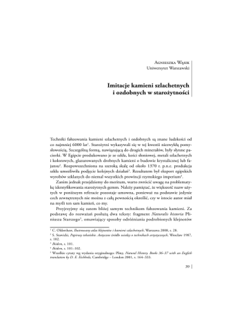 Agnieszka Wąsik Uniwersytet Warszawski Imitacje kamieni szlachetnych i ozdobnych w starożytności Techniki fałszowania kamieni szlachetnych i ozdobnych są znane ludzkości od co najmniej 6000 lat1. Starożytni wykazywali się w tej kwestii niezwykłą pomysłowością. Szczególną formą, nawiązującą do drogich minerałów, były słynne paciorki. W Egipcie produkowano je ze szkła, kości słoniowej, metali szlachetnych i kolorowych, glazurowanych drobnych kamieni o budowie krystalicznej lub fajansu2. Rozpowszechniona na szeroką skalę od około 1370 r. p.n.e. produkcja szkła umożliwiła podjęcie kolejnych działań3. Rezultatem był eksport egipskich wyrobów szklanych do niemal wszystkich prowincji rzymskiego imperium4. Zanim jednak przejdziemy do meritum, warto zwrócić uwagę na problematykę identyfikowania starożytnych gemm. Należy pamiętać, że większość nazw użytych w poniższym referacie pozostaje umowna, ponieważ na podstawie jedynie cech zewnętrznych nie można z całą pewnością określić, czy w istocie autor miał na myśli ten sam kamień, co my. Przyjrzyjmy się zatem bliżej samym technikom fałszowania kamieni. Za podstawę do rozważań posłużą dwa teksty: fragment Naturalis historia Pliniusza Starszego5, omawiający sposoby odróżniania podrobionych klejnotów 1 C. Oldershaw, Ilustrowany atlas klejnotów i kamieni szlachetnych, Warszawa 2008, s. 28. S. Stawicki, Papirusy tebańskie. Antyczne źródło wiedzy o technikach artystycznych, Wrocław 1987, s. 102. 3 Ibidem, s. 101. 4 Ibidem, s. 101–102. 5 Wszelkie cytaty wg wydania oryginalnego: Pliny, Natural History. Books 36–37 with an English translation by D. E. Eichholz, Cambridge – London 2001, s. 164–333. 2 39 Agnieszka Wąsik od prawdziwych, oraz tak zwany Papirus Sztokholmski, pochodzący z okresu ptolemejskiego lub rzymskiego, odkryty w egipskich Tebach, a w 1832 r. przekazany Królewskiej Szwedzkiej Akademii Starożytności w Sztokholmie6, bardzo szczegółowo omawiający metody tworzenia imitacji. Zacznijmy od tego drugiego. Papirus Sztokholmski stanowi wyjątkowy zabytek kultury starożytnej. Zawiera opisy technik fałszowania trzynastu kamieni szlachetnych: szmaragdu (15 sposobów), berylu (5), kamienia słonecznego (4), perły (3), chryzolitu (2), rubinu (1), karneolu (1), jaspisu (1), ametystu (1), chryzoprazu (1), lapisu lazuli (1) oraz klejnotu zwanego lychnis (1). Pojawiają się także opisy wytwarzania bliżej nieokreślonych gemm, na przykład zielonego kamienia (1). Widać zatem wyraźnie, że w okresach ptolemejskim i rzymskim najbardziej pożądane były szmaragdy. Niezależnie od rodzaju wytwarzanego klejnotu, recepty za materiał wyjściowy najczęściej podają inne minerały, np. kryształ górski, topaz, piryt. O ile co do tego pierwszego nie ma zbyt wielu wątpliwości, o tyle dwa pozostałe budzą ich wiele. Oba nie nadają się do barwienia, pozostaje więc twierdzić, iż pod tymi nazwami krył się w starożytności inny rodzaj albo nawet kilka rodzajów kamieni7. Większość recept ma wspólny schemat. Najpierw opisują mechaniczną obróbkę surowca, a następnie proces barwienia8. Czasami natomiast informacje dotyczące pierwszego etapu są zawarte w oddzielnym przepisie. Tak na przykład przepis na wytworzenie imitacji rubinu podaje, że najpierw należy obrobić kryształ dymny9. Następnie rozpalało się go stopniowo na odpadkach z pracy złotniczej w cieniu do momentu, aż będzie wyglądał, jakby zajął się ogniem, po czym zanurzony w olejku cedrowym z siarką naturalną musiał przeleżeć do dnia następnego10. Z kolei w celu stworzenia fałszywej perły, kryształ zaprawia się w ałunie11 6 Wszelkie wiadomości wg tłumaczenia S. Stawickiego i J. Wojtczaka, [w:] S. Stawicki, op. cit., s. 243–275. 7 S. Stawicki, op.cit., s. 105–106. Należy pamiętać, że starożytni klasyfikowali kamienie szlachetne według koloru, a nie – jak dziś – według bardzo precyzyjnego składu chemicznego. Cf. K. Maślankiewicz, Kamienie szlachetne, Warszawa 1983, s. 29–30. Dlatego też bardzo możliwe są wszelkie pomyłki w nazewnictwie kamieni. 8 S. Stawicki, op.cit., s. 110–111. 9 Chodzi tu zapewne o kwarc dymny, czyli odmianę kwarcu w kolorze brunatnym. Kryształ górski także jest kwarcem. Cf. W. Schumann, Minerały świata, Warszawa 2008, s. 120–121. 10 Pap. Holm. 19. 11 Ałun to uwodniony podwójny siarczan. W farbiarstwie jako zaprawa zastosowanie znalazły ałun potasowo-glinowy i ałun potasowo-chromowy. Cf. Słownik chemii praktycznej, red. J. Chodkowski, Warszawa 1992, s. 20. 40 Imitacje kamieni szlachetnych i ozdobnych w starożytności i moczu przez – jak ujął to autor – wiele dni. Po tym gotuje się go w soku z kurzyśladu12 o błękitnych kwiatach, rojnika13, wilczomlecza14 i rtęci15. W jednej z recept na wytworzenie szmaragdu czytamy, że powinno się zmieszać oczyszczoną w ogniu miedź z grynszpanem16 w proporcji jeden do dwóch, po czym zanurzyć je w miodzie i odstawić w popiół. Następnie mieszankę trzeba było gotować i dopiero wkładało się do niej kryształ17. Natomiast imitacje karneolu powstawały, gdy rozpuściło się alkannę18 w oleju, dodało się krew gołębia, miałką ziemię synopijską i ocet, do roztworu wrzucało się kamień z miki, zamykało się naczynie i odstawiało na 10 dni w miejscu, gdzie wyczuwalna była wilgoć rosy. Dla większego rozjaśnienia kamienia owijało się go końskim włosiem przed zanurzeniem w barwniku19. W celu uzyskania berylu trzeba było przewiązać kryształ włosem i powiesić w dzbanie z moczem oślicy tak, aby kamień nie stykał się z cieczą. Zamknięte naczynie powinno stać przez trzy dni. Po tym stawiało się je na wolnym ogniu20. Jedna z recept na imitację kamienia słonecznego nakazuje zmieszać smoczą krew z sokiem z drzewa balsamowego, żywicę z Palestyny lub – jeśli takiej nie posiadamy – z Tomi oraz pontyjską alkannę. Następnie 
