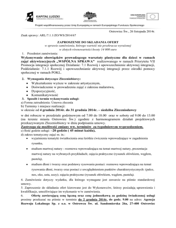 Ostrowiec Św., 26 listopada 2014r. Znak sprawy: ARL/7.1.1/ZO/WS/2014/67 ZAPROSZENIE DO SKŁADANIA OFERT w sprawie zamówienia, którego wartość nie przekracza wyrażonej w złotych równowartości kwoty 14 000 euro 1. Przedmiot zamówienia: Wykonywanie obowiązków prowadzącego warsztaty plastyczne dla dzieci w ramach zajęć aktywizacyjnych „WSPÓLNA SPRAWA” realizowanego w ramach Priorytetu VII Promocja integracji społecznej Działanie: 7.1 Rozwój i upowszechnienie aktywnej integracji, Poddziałanie: 7.1.1 Rozwój i upowszechnianie aktywnej integracji przez ośrodki pomocy społecznej w ramach POKL. 2. Wymagania dotyczące Zleceniobiorcy: Wykształcenie wyższe w zakresie artystycznym, Doświadczenie w prowadzeniu zajęć z zakresu malarstwa, Dyspozycyjność, Komunikatywność 3. Sposób i termin wykonywania usługi: a) Forma zatrudnienia: Umowa zlecenia b) Terminy i miejsce realizacji: w okresie od 4 grudnia 2014r. do 31 grudnia 2014r. – siedziba Zleceniodawcy w dni robocze w przedziale godzinowym od 7.00 do 18.00 oraz w soboty od 9.00 do 13.00 (na terenie miasta Ostrowiec Św.) zgodnie z harmonogramem działań projektowych przekazywanym Zleceniobiorcy w dniu podpisania umowy. Zastrzega się możliwość zmiany ww. terminów za tygodniowym wyprzedzeniem. c) Ilość godzin usługi: –20 godzin ( 45 minut każda), d) zakres tematyczny zajęć m. in.: wyjaśnienia tematyki światłocienia oraz krótkie ćwiczenia wprowadzające w zagadnienia rysunku, studium martwej natury - rozmowa wprowadzająca na temat martwej natury, prezentacja martwej natury na wybranych przykładach; zajęcia praktyczne (rysunek ołówkiem, węglem, pastelą), studium dłoni i twarzy oraz podstawy rysowania postaci: rozmowa wprowadzająca na temat rysowania dłoni, twarzy oraz postaci z uwzględnieniem punktów charakterystycznych: (palce, nos, oko, usta, uszy); zajęcia praktyczne (rysunek ołówkiem, węglem, pastelą). 4. Zamówienie dotyczy wydatku, dla którego wymagane jest zawarcie na piśmie standardowej umowy. 5. Zaproszenie do składania ofert kierowane jest do Wykonawców, którzy posiadają uprawnienia i kwalifikacje, umożliwiające im wykonanie w/w zamówienia. 6. Ofertę zawierającą cenę łączną oraz cenę jednostkową za godzinę świadczonej usługi prosimy przekazać na piśmie w terminie do 2 grudnia 2014r. do godz. 9.00 na adres: Agencja Rozwoju Lokalnego Sp. z o.o. w Ostrowcu Św. ul. Sandomierska 26a, 27-400 Ostrowiec Świętokrzyski lub osobiście do siedziby ARL Sp. z o.o. (sekretariat) w zamkniętej kopercie. Do oferty należy załączyć oświadczenie Zleceniobiorcy ( zał. nr 1 do Zaproszenia) oraz dokumenty potwierdzające spełnianie wymagań ( np. kopie dyplomu, referencje zaświadczenia itp. ) Wzór oferty stanowi załącznik nr 2 do Zaproszenia. 7. Cena wskazana w ofercie wyczerpuje wszystkie zobowiązania Zleceniodawcy wobec Zleceniobiorcy z tytułu realizacji zamówienia. 8. Kryterium oceny oferty: cena 100 %. Za najkorzystniejszą zostanie uznana oferta cenowa stanowiąca najmniejszy koszt finansowy dla Zleceniodawcy, który ustali całkowity koszt usługi Zleceniobiorcy w oparciu o ofertę cenową oraz oświadczenie ( zał. nr 1 do Zaproszenia ) złożone wraz z ofertą przez Zleceniobiorcę. 9. Ewentualne wyjaśnienia uzyskać można kontaktując się ze Zleceniodawcą telefonicznie pod numerem telefonu 41 248 03 70 lub mailowo: [email protected] przed upływem terminu składania ofert. 10. Zleceniodawca zastrzega sobie możliwość prowadzenia negocjacji w celu ustalenia najkorzystniejszych warunków realizacji Zamówienia, z Oferentami, którzy złożyli identyczne oferty zawierające cenę oraz spełniają wymagania w zakresie właściwości podmiotowej przedmiotu Zamówienia lub z jedynym Oferentem, jeżeli jego oferta przekracza wysokość środków jakie Zleceniodawca może przeznaczyć na zamówienie. 11. Realizacja zamówienia zostanie zlecona Wykonawcy, który zaoferował ostatecznie najkorzystniejsze warunki realizacji Zamówienia, przyjął wymagania określone w zaproszeniu do składania ofert, złożył stosowne oświadczenie o dysponowaniu czasem niezbędnym do prawidłowego i efektywnego wykonania usługi, oświadczenie o zachowaniu w tajemnicy danych osobowych, do których uzyska on dostęp w związku z zatrudnieniem przy realizacji projektu współfinansowanego ze środków UE, spełnia wymagania określone w Wytycznych w zakresie kwalifikowania wydatków w ramach PO KL z dnia 2 kwietnia 2014r. oraz zgodził się na zawarcie pisemnej umowy. 12. Zamawiający zastrzega możliwość udzielenia kolejnego zamówienia do wysokości 50% wartości zamówienia określonego w umowie z Wykonawcą w tym samym roku kalendarzowym, jeżeli zachodzi konieczność udzielenia zamówienia tożsamego z uprzednio udzielonym zamówieniem, a udzielenie zamówienia w ten sposób jest z korzyścią dla Zamawiającego. Prezes ARL Sp. z o.o. Magdalena Salwerowicz Załączniki: 1. Oświadczenie zleceniobiorcy. 2. Formularz ofertowy Załącznik nr 1 1. OŚWIADCZENIE I. Oświadczam pod odpowiedzialnością karną, że: jestem zatrudniony (a) na umowę o pracę w: ......................................................................................................................................................................................... oraz, że moje miesięczne wynagrodzenie brutto z tego tytułu jest wyższe / niższe niż 1680,00 zł. wykonuję pracę w ramach umowy o pracę/cywilnoprawnej/ wolontariatu w: ............................................................................................................................................................. Okres obowiązywania ww. umowy ..................................................................................................... z umowy cywilnoprawnej są potrącane składki społeczne / nie są potrącane składki społeczne * nie jestem zleceniobiorcą z tytułu umowy zlecenia nie jestem zatr