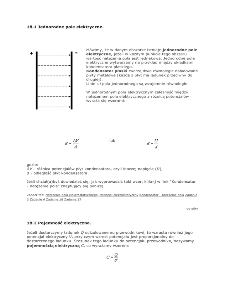 18.1 Jednorodne pole elektryczne. Mówimy, że w danym obszarze istnieje jednorodne pole elektryczne, jeżeli w każdym punkcie tego obszaru wartość natężenia pola jest jednakowa. Jednorodne pole elektryczne wytwarzamy na przykład między okładkami kondensatora płaskiego. Kondensator płaski tworzą dwie równoległe naładowane płyty metalowe (każda z płyt ma ładunek przeciwny do drugiej). Linie sił pola jednorodnego są wzajemnie równoległe. W jednorodnym polu elektrycznym zależność między natężeniem pola elektrycznego a różnicą potencjałów wyraża się wzorami: lub gdzie: ΔV - różnica potencjałów płyt kondensatora, czyli inaczej napięcie (U), d - odległość płyt kondensatora. Jeśli chciał(a)byś dowiedzieć się, jak wyprowadzić taki wzór, kliknij w link "Kondensator - natężenie pola" znajdujący się poniżej. Zobacz też: Natężenie pola elektrostatycznego Potencjał elektrostatyczny Kondensator - natężenie pola Zadanie 3 Zadanie 4 Zadanie 16 Zadanie 17 do góry 18.2 Pojemność elektryczna. Jeżeli dostarczymy ładunek Q odizolowanemu przewodnikowi, to wzrasta również jego potencjał elektryczny V, przy czym wzrost potencjału jest proporcjonalny do dostarczonego ładunku. Stosunek tego ładunku do potencjału przewodnika, nazywamy pojemnością elektryczną C, co wyrażamy wzorem: Jednostką pojemności jest farad (F). 1 Farad to taka pojemność przewodnika, w którym dostarczenie ładunku 1 kulomba powoduje wzrost potencjału o 1 wolt. Farad jest bardzo dużą pojemnością (Ziemia ma pojemność dużo mniejszą niż 1F), dlatego najczęściej używamy jednostek pojemności mniejszych: 1 mikrofarad (µF) = 10-6F 1 nanofarad (nF) = 10-9F 1 pikofarad (pF) = 10-12F = 10-6µF Zobacz też: Potencjał elektrostatyczny Zadanie 5 do góry 18.3 Pojemność kondensatora. Kondensator jest układem przewodników służącym do gromadzenia ładunków elektrycznych. Istnieją różnego typu kondensatory, ale my ograniczymy się do omawiania tylko kondensatora płaskiego. Stanowią go dwie wzajemnie odwzorowane płyty metalowe (okładki), a jego pojemność możemy obliczyć ze wzoru: gdzie: S - powierzchnia czynna okładek, d - odległość między okładkami kondensatora, ε0 - przenikalność elektryczna próżni (stała), εR - względna przenikalność elektryczna dielektryka wypełniającego przestrzeń między okładkami (liczba niemianowana). Dla kondensatora próżniowego εR = 1. Dielektryk (εR > 1) zwiększa pojemność kondensatora εR razy. Pojemność kondensatora płaskiego możemy również obliczyć korzystając ze wzoru na pojemność elektryczną, przy czym potencjał elektryczny zastępujemy różnicą potencjałów, czyli napięciem: Jeśli interesujesz się tym, jak wyprowadzić powyższe wzory, kliknij poniżej na temat "Kondensator - pojemność elektryczna". Zobacz też: Kondensator - pojemność elektryczna Zadanie 7 Zadanie 11 Zadanie 12 Zadanie 13 Zadanie 14 do góry 18.4 Inne właściwości kondensatorów. Siła wzajemnego przyciągania się okładek: Na okładkach naładowanego kondensatora znajdują się ładunki przeciwnych znaków, dlatego też okładki te przyciągają się wzajemnie. Jeżeli przez Q oznaczymy ładunek zgromadzony na jednej z okładek, zaś E oznaczać będzie natężenie pola elektrycznego między okładkami kondensatora, to siłę F wzajemnego przyciągania się okładek wyraża się wzorem: Energia kondensatora: W kondensatorze o pojemności C, naładowanym do napięcia U, zgromadzona jest energia: Ponieważ Q = CU, to alternatywne wzory na energię wynoszą: Energię naładowanego kondensatora wykorzystujemy między innymi w elektronicznych lampach błyskowych, używanych w aparatach fotograficznych, w których naładowany kondensator rozładowuje się przez palnik lampy wypełnionej ksenonem. Zobacz też: Skutki rozsuwania okładek kondensatora Zadanie 2 Zadanie 9 Zadanie 10 Zadanie 12 Zadanie 15 Zadanie 16 do góry 18.5 Łączenie kondensatorów. szeregowe równoległe Zobacz też: Zadanie 1 Zadanie 8 Zadanie 11 Zadanie 12 Zadanie 15 do góry 18.6 Dielektryk w polu elektrycznym. Dielektryk to ciało, w którym ładunki nie mogą się przemieszczać, nie posiada więc swobodnych elektronów. Elektrony znajdujące się w izolatorach są związane z atomami i cząsteczkami. Gdy dielektryk znajdzie się w polu elektrostatycznym, może zachodzić przemieszczanie się elektronów, ale tylko w obrębie cząsteczki. Np. gdy dielektryk jest między płytkami naładowanego kondensatora, elektrony chcą się znaleźć możliwie blisko płytki dodatniej. Cząsteczka staje się tzw. dipolem elektrycznym, czyli układem dwóch ładunków o jednakowej wartości i o przeciwnych znakach. Jeżeli dielektryk ma dipolową budowę cząsteczek w nieobecności pola elektrostatycznego zewnętrznego, to w polu naładowanego kondensatora zachodzi uporządkowywanie się tych cząsteczek - dipoli. Dielektryk o niedipolowej budowie Dielektryk o niedipolowej budowie cząsteczek w nieobecności pola cząsteczek w obecności pola zewnętrznego zewnętrznego ma cząsteczki z równomierniema cząsteczki z uporządkowanymi rozłożonymi ładunkami. ładunkami - dipolami. W dielektryku o dipolowej budowie W dielektryku o dipolowej budowie cząsteczek cząsteczki - dipole w cząsteczek cząsteczki - dipole w obecności nieobecności zewnętrznego pola są ułożone pola zewnętrznego są uporządkowane. chaotycznie. W jednym i w drugim rodzaju dielektryków w obecności zewnętrznego pola elektrostatycznego dochodzi do porządkowania cząsteczek - dipoli. Jest to tzw. polaryzacja dielektryka. W spolaryzowanym dielektryku powstaje jego własne pole elektrostatyczne. To wewnętrzne pole w dielektryku jest zwrócone zawsze przeciwnie do pola zewnętrznego. Dlatego też dochodzi do osłabienia pola wypadkowego, czyli do zmniejszenia natężenia. Ponieważ ładunek na płytkach kondensatora nie zmienia się wskutek wsunięcia międz