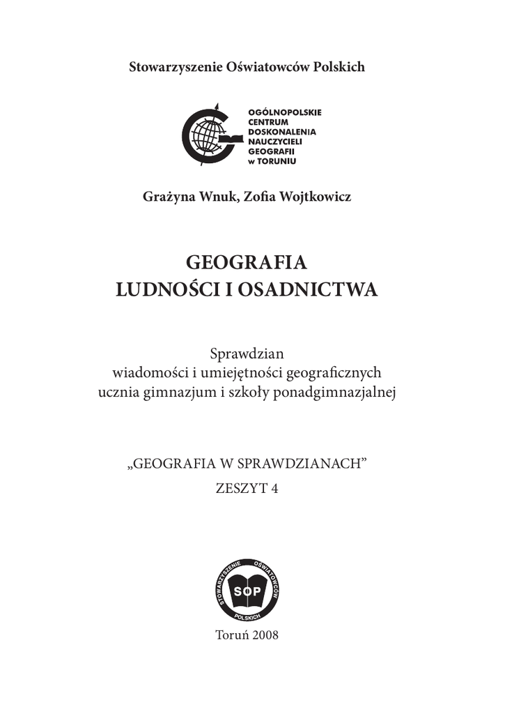 Stowarzyszenie Oświatowców Polskich Grażyna Wnuk, Zofia Wojtkowicz GEOGRAFIA LUDNOŚCI I OSADNICTWA Sprawdzian wiadomości i umiejętności geograficznych ucznia gimnazjum i szkoły ponadgimnazjalnej „GEOGRAFIA W SPRAWDZIANACH” ZESZYT 4 Toruń 2008 1 Redaktor Antoni Stark Redakcja techniczna Zdzisław Nyca Recenzja Józef Brokos – Nadróż k. Rypina © Copyright by Stowarzyszenie Oświatowców Polskich Toruń 2008 ISBN 978-83-7352-180-3 Wydanie I Wydawca Stowarzyszenie Oświatowców Polskich Oddział w Toruniu 87-100 Toruń, ul. PCK 9/2, tel./fax (056) 622 52 71, (056) 622 43 09 e-mail: [email protected] http://www.sop.torun.pl 2 Spis treści Wstęp. . . . . . . . . . . . . . . . . . . . . . . . . . . . . . . . . . . . . . . . . . . . . . . . . . . . . . . . . . . . . . . . . . . . 5 I. Geografia ludności i osadnictwa w Podstawie programowej kształcenia ogólnego na kolejnych etapach edukacyjnych. . . . . . . . . 6 II. Geografia ludności i osadnictwa na egzaminach zewnętrznych . . 7 1. Gimnazjum – egzamin z przedmiotów matematyczno-przyrodniczych . . . . . . . . . . . . . . . . . . . . . . . . . . . . . . . . . . . . . . . . . . . . . . . . . . . 7 2. Szkoła ponadgimnazjalna – egzamin maturalny . . . . . . . . . . . . . . . . . 12 III. Wykaz terminów z zakresu geografii ludności i osadnictwa w treściach kształcenia w gimnazjum i szkole ponadgimnazjalnej . . . . . . . . . . . . . . . . . . . . . . . . . . . . . . . . . . . . . . . . 20 IV. Sprawdzian wiadomości i umiejętności ucznia z zakresu geografii ludności i osadnictwa . . . . . . . . . . . . . . . . . . . . . . . . . 22 1. Plan testu . . . . . . . . . . . . . . . . . . . . . . . . . . . . . . . . . . . . . . . . . . . . . . . . . . . . . . . . . 2. Kartoteka testu . . . . . . . . . . . . . . . . . . . . . . . . . . . . . . . . . . . . . . . . . . . . . . . . . . . . 3. Sprawdzian wiadomości i umiejętności ucznia z zakresu geografii ludności i osadnictwa . . . . . . . . . . . . . . . . . . . . . . . . . 4. Model odpowiedzi i kryteria zaliczenia zadań . . . . . . . . . . . . . . . . . . . . 5. Omówienie wyników sprawdzianu – propozycja . . . . . . . . . . . . . . . . . 22 23 27 44 50 V. Literatura . . . . . . . . . . . . . . . . . . . . . . . . . . . . . . . . . . . . . . . . . . . . . . . . . . . . . . . . . . . 55 3 4 WSTĘP Przedstawiony materiał metodyczny ma za zadanie ukazać wymagania z zakresu geografii ludności i osadnictwa stawiane uczniom po zakończeniu kształcenia w gimnazjum i szkole ponadgimnazjalnej, zgodnie z Podstawą programową kształcenia ogólnego oraz Standardami wymagań egzaminacyjnych. W opracowaniu zamieszczono wykaz terminów jakimi powinien posługiwać się uczeń z geografii ludności i osadnictwa w gimnazjum i szkole ponadgimnazjalnej. Publikacja zawiera przykłady zadań reprezentujących omawiane treści w arkuszach egzaminu gimnazjalnego z przedmiotów matematyczno-przyrodniczych oraz egzaminu maturalnego z geografii. Nauczyciel znajdzie tu przede wszystkim sprawdzian osiągnięć ucznia dotyczący omawianego działu geografii oraz przykład analizy ilościowej i jakościowej wyników sprawdzania. Prezentowany sprawdzian jest testem formalnym, co oznacza że został poddany standaryzacji, czyli przeprowadzono go w wybranych grupach uczniów, co pozwoliło na jego ulepszenie. Niniejsza publikacja ma za zadanie ułatwić nauczycielowi przygotowanie ucznia do egzaminów zewnętrznych z geografii ludności i osadnictwa. Poszczególne zadania można też wykorzystywać do sprawdzania wiedzy i umiejętności uczniów w trakcie kształcenia lub do opracowania własnego sprawdzianu kontrolującego wiedzę i umiejętności ucznia z geografii ludności i osadnictwa. Zadania przeznaczone dla liceum – poziom podstawowy oznaczono gwiazdką „*”, natomiast zadania najtrudniejsze skierowane głównie do uczniów liceum uczących się na poziomie rozszerzonym oznaczono dwoma gwiazdkami „**”. Zadania bez oznakowania powinni rozwiązać uczniowie już w gimnazjum. Sukces ucznia na każdej lekcji oraz na egzaminach zewnętrznych: gimnazjalnym i egzaminie maturalnym z geografii jest również sukcesem nauczyciela. Życzymy Państwu osiągania satysfakcjonujących wyników w pracy dydaktycznej. Autorki 5 I. GEOGRAFIA LUDNOŚCI I OSADNICTWA W PODSTAWIE PROGRAMOWEJ KSZTAŁCENIA OGÓLNEGO NA KOLEJNYCH ETAPACH EDUKACYJNYCH Uczeń zaczyna się uczyć geografii ludności i osadnictwa od szkoły podstawowej. Nauka polega tu na obserwacji życia i zajęć ludności w bliskim otoczeniu, czego wynikiem jest dostrzeganie zależności występujących między środowiskiem przyrodniczym a działalnością człowieka. Uczeń poszerza wiedzę na kolejnych etapach edukacyjnych, na których również doskonali umiejętności, co ma odbicie w osiągnięciach określonych przez Podstawę programową kształcenia ogólnego. Etap edukacyjny Treści kształcenia II – szkoła podstawowa Warunki życia ludzi w najbliższym przyroda otoczeniu. Zależność życia ludzi od czynników przyrodniczych i pozaprzyrodniczych Osiągnięcia ucznia Dostrzeganie zależności między czynnikami środowiska przyrodniczego i kulturowego. Dostrzeganie wpływu działalności człowieka na środowisko przyrodnicze. III – gimnazjum geografia Interakcja Ziemia - człowiek. Gromadzenie, interpretowanie i prePotencjał naturalny, ludnościowy, zentowanie wiedzy geograficznej. Ocenianie w kategoriach geograficznych gospodarczy i kulturowy Polski działalności gospodarczej, społecznej i politycznej oraz działań własnych. Przewidywanie zmian w przyrodzie i w działaniach ludzi na podstawie uzyskanych informacji. IV – szkoła ponadgimnazjalna geografia – zakres podstawowy Przyczyny i skutki nierównomiernego rozmieszczenia ludności na Ziemi. Problemy demograficzne społeczeństw (ze szczególnym uwzględnieniem Polski). Współczesne migracje ludności. Procesy przekształcania sieci osadniczej (wielkie mias