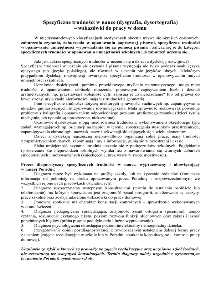 Specyficzne trudności w nauce (dysgrafia, dysortografia