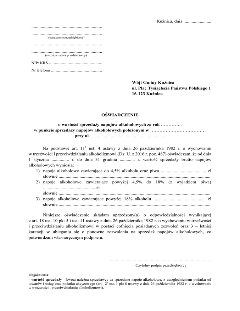 Kuźnica, dnia ........................ ............................................................. ............................................................. (oznaczenie przedsiębiorcy) ............................................................. ............................................................. (siedziba i adres przedsiębiorcy) NIP/ KRS .............................................. Nr telefonu ............................................ Wójt Gminy Kuźnica ul. Plac Tysiąclecia Państwa Polskiego 1 16-123 Kuźnica OŚWIADCZENIE o wartości sprzedaży napojów alkoholowych za rok ………….. w punkcie sprzedaży napojów alkoholowych położonym w ……………………………… przy ul. ................................................................ Na podstawie art. 111 ust. 4 ustawy z dnia 26 października 1982 r. o wychowaniu w trzeźwości i przeciwdziałaniu alkoholizmowi (Dz. U. z 2016 r. poz. 487) oświadczam, że od dnia 1 stycznia ............... r. do dnia 31 grudnia ............. r. wartość sprzedaży brutto napojów alkoholowych wyniosła: 1) napoje alkoholowe zawierające do 4,5% alkoholu oraz piwo ....................................... zł słownie ................................................................................................................................... 2) napoje alkoholowe zawierające powyżej 4,5% do 18% (z wyjątkiem piwa) ............................................. zł słownie ................................................................................................................................... 3) napoje alkoholowe zawierające powyżej 18% alkoholu ............................................. zł słownie ................................................................................................................................... Niniejsze oświadczenie składam uprzedzony(a) o odpowiedzialności wynikającej z art. 18 ust. 10 pkt 5 i ust. 11 ustawy z dnia 26 października 1982 r. o wychowaniu w trzeźwości i przeciwdziałaniu alkoholizmowi w postaci cofnięcia posiadanych zezwoleń oraz 3 – letniej karencji w ubieganiu się o ponowne zezwolenia na sprzedaż napojów alkoholowych, co potwierdzam własnoręcznym podpisem. ..................................................................................... Czytelny podpis przedsiębiorcy Objaśnienia: - wartość sprzedaży - kwota należna sprzedawcy za sprzedane napoje alkoholowe, z uwzględnieniem podatku od towarów i usług oraz podatku akcyzowego (art. 21 ust. 1 pkt 8 ustawy z dnia 26 października 1982 r. o wychowaniu w trzeźwości i przeciwdziałaniu alkoholizmowi).