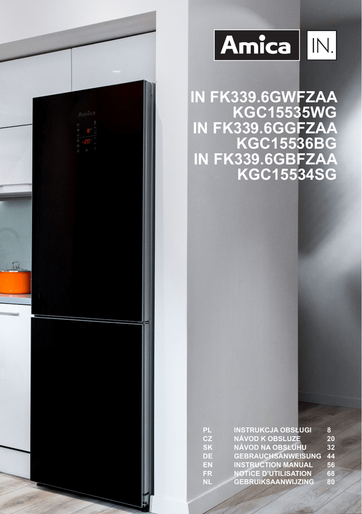 IN FK339.6GWFZAA KGC15535WG IN FK339.6GGFZAA KGC15536BG IN FK339.6GBFZAA KGC15534SG PL INSTRUKCJA OBSŁUGI 8 CZ NÁVOD K OBSLUZE 20 SK NÁVOD NA OBSLUHU 32 DEGEBRAUCHSANWEISUNG44 EN INSTRUCTION MANUAL 56 FR NOTICE D’UTILISATION 68 NL GEBRUIKSAANWIJZING 80 PL WAŻNE INSTRUKCJE BEZPIECZEŃSTWA INSTALACJA I WARUNKI PRACY URZĄDZENIA OBSŁUGA I FUNKCJE JAK EKONOMICZNIE UŻYTKOWAĆ LODÓWKĘ ODSZRANIANIE, MYCIE I KONSERWACJA LOKALIZACJA USTEREK OCHRONA ŚRODOWISKA KLASA KLIMATYCZNA GWARANCJA, OBSŁUGA POSPRZEDAŻNA 9 12 13 15 16 17 18 18 19 CZ POKYNY TÝKAJÍCÍ SE BEZPEČNOSTI POUŽÍVÁNÍ INSTALACE A PROVOZNÍ PODMÍNKY SPOTŘEBIČE OBSLUHA A FUNKCE JAK EKONOMICKY POUŽÍVAT CHLADNIČKU ODMRAZOVÁNÍ, MYTÍ A ÚDRŽBA URČOVÁNÍ ZÁVAD OCHRANA ŽIVOTNÍHO PROSTŘEDÍ KLIMATICKÁ TŘÍDA ZÁRUKA 21 24 25 27 28 29 30 30 31 SK POKYNY TÝKAJÍCÍ SE BEZPEČNOSTI POUŽÍVÁNÍ INŠTALÁCIA A PREVÁDZKOVÉ PODMIENKY SPOTREBIČA OBSLUHA A FUNKCIE AKO EKONOMICKY POUŽÍVAŤ CHLADNIČKU ODMRAZOVANIE, UMÝVANIE A ÚDRŽBA LOKALIZÁCIA ZÁVAD OCHRANA ŽIVOTNÉHO PROSTREDIA KLIMATICKÁ TRIEDA ZÁRUKA 33 36 37 39 40 41 42 42 43 DE SICHERHEITSHINWEISE INBETRIEBNAHME UND BETRIEBSBEDINGUNGEN DES GERÄTES BEDIENUNG UND FUNKTIONEN ENERGIESPARENDE NUTZUNG DES KÜHLSCHRANKS ABTAUEN, REINIGEN UND PFLEGEN LOKALISIERUNG VON STÖRUNGEN UMWELTSCHUTZ KLIMAKLASSE GARANTIE 45 48 49 51 52 53 54 54 55 EN GUIDELINES CONCERNING THE SAFETY OF USE INSTALLATION AND OPERATING CONDITIONS OF THE APPLIANCE OPERATION AND FUNCTIONS USING THE REFRIGERATOR EFFICIENTLY DEFROSTING, WASHING AND MAINTENANCE TROUBLE-SHOOTING ENVIRONMENTAL PROTECTION CLIMATE RANGE WARRANTY AND AFTER-SALE SERVICES 57 60 61 63 64 65 66 66 67 FR CONSIGNES DE SECURITÉ D’UTILISATION INSTALLATION ET CONDITIONS DE FONCTIONNEMENT DE L’APPAREIL SERVICE D’ENTRETIEN ET FONCTIONSCOMMENT EXPLOITER LE REFRIGERATEUR DE FAÇON ECONOMIQUE DÉGIVRAGE, LAVAGE ET CONSERVATION LOCALISATION DES PANNES ROTECTION DE L’ENVIRONEMENT CLASSE CLIMATIQUE GARANTIE, SERVICE APRÈS-VENTE 59 62 63 65 66 67 68 68 69 NL AANWIJZINGEN BETREFFENDE VEILIGHEID VAN GEBRUIK IINSTALLATIE EN WERKOMSTANDIGHEDEN VAN HET APPARAAT BEDIENING EN FUNCTIES HOE KAN DE KOELKAST ECONOMISCH GEBRUIKT WORDEN? ONTDOOIEN, WASSEN EN ONDERHOUD STORINGEN VINDEN EN VERHELPEN MILIEUBESCHERMING KLIMAATKLASSE GARANTIE, SERVICE 61 64 65 67 68 69 70 70 71 2 18 1 2 * 3 4 10 11 12 13 5 6 14 15 7 8 16 17 9 1 * option 2 3 3 4 5 6 7 9 8 A B 1 10 4 1 4 5 14 11 2 3 15 16 12 13 17 5 6 7 GRATULUJEMY WYBORU SPRZĘTU MARKI AMICA PL SZANOWNI PAŃSTWO! To urządzenie stanowi połączenie wyjątkowej łatwości obsługi i doskonałej efektywności. Każde produkt przed opuszczeniem fabryki został dokładnie sprawdzony pod względem bezpieczeństwa i funkcjonalności. Prosimy Państwa o uważną lekturę instrukcji obsługi przed uruchomieniem urządzenia. Urządzenie przeznaczone jest wyłącznie do użytku domowego. Producent zastrzega sobie możliwość dokonywania zmian niewpływających na działanie urządzenia. 8 i Ilustracje w niniejszej instrukcji obsługi mają charakter poglądowy. Pełne wyposażenie urządzenia znajduje się w odpowiednim rozdziale. i Masz wątpliwości? Jeśli pewne fragmenty instrukcji są niezrozumiałe, należy skontaktować się z centrum serwisowym, aby uzyskać wszechstronną pomoc. Niektóre zapisy w niniejszej instrukcji są ujednolicone dla wyrobów chłodniczych różnych typów, (dla chłodziarki, chłodziarko-zamrażarki lub zamrażarki). Informacja na temat rodzaju Twojego urządzenia znajduje się w Karcie Produktu dołączonej do wyrobu. Producent nie ponosi odpowiedzialności za szkody wynikłe z nieprzestrzegania zasad umieszczonych w niniejszej instrukcji. Prosimy o zachowanie tej instrukcji w celu wykorzystania jej w przyszłości lub przekazania ewentualnemu na stępnemu użytkownikowi. Niniejszy sprzęt nie jest przeznaczony do użytkowania przez osoby (w tym dzieci) o ograniczonej zdolności fizycznej, czuciowej lub psychicznej oraz osoby o braku doświadczenia lub znajomości sprzętu, chyba, że odbywa się to pod nadzorem lub zgodnie z instrukcją użytkowania sprzętu, przekazanej przez osoby odpowiadające za ich bezpieczeństwo. Należy zwrócić szczególną uwagę, aby z urządzenia nie korzystały pozostawione bez opieki dzieci. Nie należy pozwalać im bawić się urządzeniem. Nie wolno im siadać na elementach wysuwanych i zawieszać się na drzwiach. Urządzenie pracuje prawidłowo w temperaturze otoczenia, która jest podana w karcie produktu. Nie należy użytkować jej w piwnicy, sieni, w nieogrzewanym domku letniskowym jesienią i zimą. Podczas ustawiania, przesuwania, podnoszenia nie należy chwytać za uchwyty drzwi, ciągnąć za skraplacz z tyłu lodówki oraz dotykać zespołu kompresora. Urządzenia nie należy przechylać o więcej niż 40° od pionu podczas transportu, przenoszenia lub ustawia nia. Jeżeli taka sytuacja zaistniała włączenie urządzenia może nastąpić min. po 2 godzinach od jego ustawienia (rys. 2). Przed każdą czynnością konserwacyjną należy wyjąć wtyczkę z gniazdka sieciowego. Nie należy ciągnąć za przewód, lecz chwytać za korpus wtyczki. 9 PL WAŻNE INSTRUKCJE BEZPIECZEŃSTWA WAŻNE INSTRUKCJE BEZPIECZEŃSTWA PL Dźwięki słyszalne jako trzaskanie lub pękanie są spowodowane przez rozszerzanie i kurczenie się części na skutek zmian temperatury. Ze względu na bezpieczeństwo nie należy naprawiać urządzenia we własnym zakresie. Naprawy, wykonywa ne przez osoby nie posiadające wymaganych kwalifikacji mogą stanowić poważne niebezpieczeństwo dla użytkownika urządzenia. Należy przewietrzyć przez kilka minut pomieszczenie, w którym znajduje się urządzenie (pomieszczenie to musi mieć przynajmniej 4 m3; dla wyrobu z izobutanem/ R600a) w przypadku uszkodzenia układu chłodnicze go. Produktów choćby tylko częściowo rozmrożonych nie można ponownie zamrażać. Napojów w butelkach i puszkach,