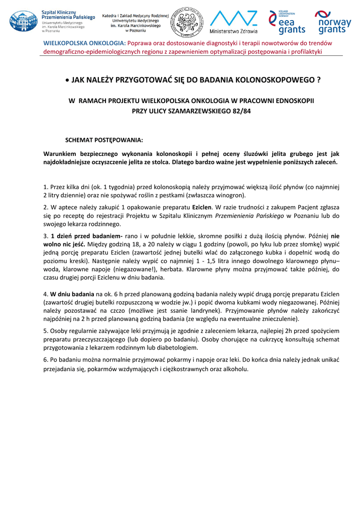 WIELKOPOLSKA ONKOLOGIA: Poprawa oraz dostosowanie diagnostyki i terapii nowotworów do trendów demograficzno-epidemiologicznych regionu z zapewnieniem optymalizacji postępowania i profilaktyki JAK NALEŻY PRZYGOTOWAĆ SIĘ DO BADANIA KOLONOSKOPOWEGO ? W RAMACH PROJEKTU WIELKOPOLSKA ONKOLOGIA W PRACOWNI EDNOSKOPII PRZY ULICY SZAMARZEWSKIEGO 82/84 SCHEMAT POSTĘPOWANIA: Warunkiem bezpiecznego wykonania kolonoskopii i pełnej oceny śluzówki jelita grubego jest jak najdokładniejsze oczyszczenie jelita ze stolca. Dlatego bardzo ważne jest wypełnienie poniższych zaleceń. 1. Przez kilka dni (ok. 1 tygodnia) przed kolonoskopią należy przyjmować większą ilość płynów (co najmniej 2 litry dziennie) oraz nie spożywać roślin z pestkami (zwłaszcza winogron). 2. W aptece należy zakupić 1 opakowanie preparatu Eziclen. W razie trudności z zakupem Pacjent zgłasza się po receptę do rejestracji Projektu w Szpitalu Klinicznym Przemienienia Pańskiego w Poznaniu lub do swojego lekarza rodzinnego. 3. 1 dzień przed badaniem- rano i w południe lekkie, skromne posiłki z dużą ilością płynów. Później nie wolno nic jeść. Między godziną 18, a 20 należy w ciągu 1 godziny (powoli, po łyku lub przez słomkę) wypić jedną porcję preparatu Eziclen (zawartość jednej butelki wlać do załączonego kubka i dopełnić wodą do poziomu kreski). Następnie należy wypić co najmniej 1 - 1,5 litra innego dowolnego klarownego płynu– woda, klarowne napoje (niegazowane!), herbata. Klarowne płyny można przyjmować także później, do czasu drugiej porcji Eziclenu w dniu badania. 4. W dniu badania na ok. 6 h przed planowaną godziną badania należy wypić drugą porcję preparatu Eziclen (zawartość drugiej butelki rozpuszczoną w wodzie jw.) i popić dwoma kubkami wody niegazowanej. Później należy pozostawać na czczo (możliwe jest ssanie landrynek). Przyjmowanie płynów należy zakończyć najpóźniej na 2 h przed planowaną godziną badania (ze względu na ewentualne znieczulenie). 5. Osoby regularnie zażywające leki przyjmują je zgodnie z zaleceniem lekarza, najlepiej 2h przed spożyciem preparatu przeczyszczającego (lub dopiero po badaniu). Osoby chorujące na cukrzycę konsultują schemat przygotowania z lekarzem rodzinnym lub diabetologiem. 6. Po badaniu można normalnie przyjmować pokarmy i napoje oraz leki. Do końca dnia należy jednak unikać przejadania się, pokarmów wzdymających i ciężkostrawnych oraz alkoholu.
