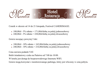 Cennik w okresie od 14 do 21 listopada, Festiwal CAMERIMAGE: 180,00zł - 5% rabatu = 171,00zł/dobę za pokój jednoosobowy 240,00zł - 5% rabatu = 228,00zł/dobę za pokój dwuosobowy Goście nocujący powyżej 5 dni: 180,00zł - 10% rabatu = 162,00zł/dobę za pokój jednoosobowy 240,00zł - 10% rabatu = 216,00zł/dobę za pokój dwuosobowy Cena zawiera podatek VAT. Bufet śniadaniowy czeka na Państwa od 7:00 do 10:00. W hotelu jest dostęp do bezprzewodowego Internetu WIFI. Goście mogą korzystać z monitorowanego parkingu, który jest wliczony w cenę pobytu.