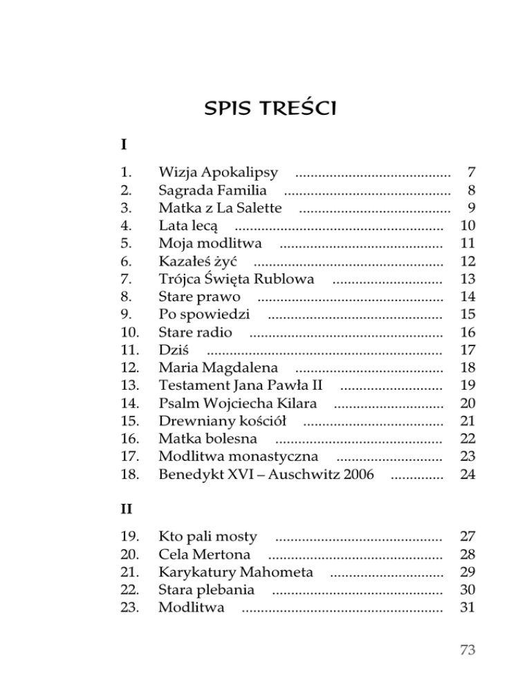 SPIS TREŚCI I 1. 2. 3. 4. 5. 6. 7. 8. 9. 10. 11. 12. 13. 14. 15. 16. 17. 18. Wizja Apokalipsy ......................................... Sagrada Familia ............................................ Matka z La Salette ........................................ Lata lecą ....................................................... Moja modlitwa ........................................... Kazałeś żyć .................................................. Trójca Święta Rublowa ............................. Stare prawo ................................................. Po spowiedzi .............................................. Stare radio ................................................... Dziś .............................................................. Maria Magdalena ....................................... Testament Jana Pawła II ........................... Psalm Wojciecha Kilara ............................. Drewniany kościół ..................................... Matka bolesna ............................................ Modlitwa monastyczna ............................ Benedykt XVI – Auschwitz 2006 .............. 7 8 9 10 11 12 13 14 15 16 17 18 19 20 21 22 23 24 Kto pali mosty ............................................ Cela Mertona .............................................. Karykatury Mahometa .............................. Stara plebania ............................................. Modlitwa ..................................................... 27 28 29 30 31 II 19. 20. 21. 22. 23. 73 24. 25. 26. 27. 28. 29. 30. 31. 32. 33. 34. Karoseria światła ........................................ Karol Baliński ............................................. Pod ścianą ................................................... Święty Piotr ................................................. Porady ks. Jana ........................................... Na wsi .......................................................... Rekolekcje ................................................... W cieniu agawy .......................................... Pamięci brata Janusza ............................... Ciała niebieskie .......................................... Pojednanie .................................................. 32 33 34 35 36 37 38 39 40 41 42 Kościół ......................................................... Pod władzą ................................................. Wielka woda ............................................... Koniec świata ............................................. Niepokalanów ............................................ W Loretto .................................................... Szata ............................................................. Lustracja ...................................................... Sąd w katedrze ........................................... Wydać czy nie wydać ................................ Beatyfikacja ................................................. Napisałem ................................................... Grzechy ....................................................... Święta Faustyna ......................................... Wiersz doskonały ...................................... Zygmunt Szczęsny Feliński ..................... Pod tym znakiem ....................................... 45 46 47 48 49 50 51 52 53 54 55 56 57 58 59 60 61 III 35. 36. 37. 38. 39. 40. 41. 42. 43. 44. 45. 46. 47. 48. 49. 50. 51. 74 52. 53. 54. Pręty słów ................................................... Do nieba ...................................................... Przykazania światowe .............................. Posłowie ................................................................ 62 63 64 65 75