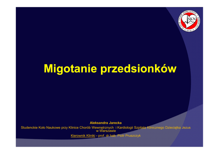 Migotanie przedsionków Aleksandra Jarecka Studenckie Koło Naukowe przy Klinice Chorób Wewnętrznych i Kardiologii Szpitala Klinicznego Dzieciątka Jezus w Warszawie Kierownik Kliniki - prof. dr hab. Piotr Pruszczyk Definicja „Migotanie przedsionków to arytmia charakteryzująca się całkowicie zdezorganizowaną depolaryzacją przedsionków, prowadzącą do ich nieefektywnego hemodynamicznie skurczu. Aktywność elektryczna przedsionków może być wykryta za pomocą elektrokardiografii jako nieregularne wychylenia linii izoelektrycznej o małej i zmiennej amplitudzie oraz częstotliwości od 350 do 600/min”. Douglas P. Zipes, 1992 Epidemiologia Populacja Stanów Zjednoczonych x 1000 Liczba osób z rozpoznanym MP x 1000 30,000 liczba osób z AF populacja U.S.A. 500 400 20,000 300 200 10,000 100 0 0 <5 5- 10- 15- 20- 25- 30- 35- 40- 45- 50- 55- 60- 65- 70- 75- 80- 85- 90- >95 9 14 19 24 29 34 39 44 49 54 59 64 69 74 79 84 89 94 Wiek (lata) Feinberg WM. Arch Intern Med. 1995;155:469-473. Epidemiologia 18% Niespecyficzne AF stanowi 1/3 wśród pts hospitalizowanych z powodu zaburzeń rytmu. 6% PSVT 6% PVCs 4% FLA 34% Migotanie przedsionków 9% SSS 8% Zaburzenia przewodzenia 3% SCD 10% VT 2% VF Baily D. J Am Coll Cardiol. 1992;19(3):41A. Patofizjologia Przyczyny ze strony mięśnia serca: choroba niedokrwienna serca, zawał serca, zapalenie mięśnia serca, kardiomiopatie. Przyczyny hemodynamiczne: nadciśnienie tętnicze, niewydolność krążenia, wady zastawkowe serca, nadciśnienie płucne. Przyczyny ogólnoustrojowe pozasercowe: zaburzenia funkcji tarczycy, stres psychiczny, zaburzenia elektrolitowe, używki: nikotyna, alkohol, marihuana, schorzenia jamy brzusznej, przyczyny jatrogenne (leki AA). SKUTEK: FALA RE- ENTRY http://www.doctortipster.com Objawy POWIKŁANIA ZATOROWE, ZAOSTRZENIE NS, BEZOBJAWOWE, Kołatanie serca, Ból w klatce piersiowej, Duszność, Spadek tolerancji wysiłku, Zwroty głowy i omdlenia, Niemiarowe tętno z deficytem. Cechy w EKG brak załamków P w ekg (lub fala migotania) + niemiarowość całkowita ! wyjątki: blok całkowity z rytmem zastępczym, stała stymulacja komorowa, interferencja z częstoskurczem komorowym, interferencja z częstoskurczem z łącza p-k. Podział pierwsze wykryte/ kolejne AF napadowe - forma nawracająca - ustępuje samoistnie - do 48 h SAMOISTNE? przetrwałe utrwalone - nie może być/ nie poddaje się kardiowersji - wymaga kardiowersji - jeśli >48 h → leczenie p. zakrzepowe WTÓRNE? Konsekwencje kliniczne ! SZYBKA CZYNNOŚĆ KOMÓR ! BRAK SKURCZU PRZEDSIONKÓW ! SKRZEPLINY wzrost zapotrzebowania energetycznego serca tachykardiomiopatia ↓ QOL spadki ciśnienia tętniczego ↓CO →↓ tolerancji wysiłku POWIKŁANIA ZATOROWE (15% udarów!) objawy ChNS zastój w krążeniu płucnym Postępowanie NAPADOWE PRZETRWAŁE UTRWALONE kontrola częstości i rytmu serca spontaniczny powrót rytmu zatokowego kardiowersja kontrola częstości i rytmu serca utrzymanie rytmu AHA/ACC/ESC Guidelines for AF management. 2006. Leczenie Leczenie choroby podstawowej! Leczenie p.zakrzepowe, Kardiowersja farmakologiczna, Kardiowersja elektryczna (zewn, wewn), Utrzymanie prawidłowego rytmu, Inne metody leczenia. Leczenie P. zakrzepowe, INR terapeutyczny 2-3, ASA- rzadkie napady AF, brak innych czynników ryzyka, Antykoagulanty- częste AF napadowe, czynniki ryzyka, AF przetrwałe i utrwalone. Leczenie Kiedy odstąpić od leczenia p.zakrzepowego? AF<48h, Echo- brak „krwi echogennej”, skrzeplin, Wówczas jednorazowo heparyna. Leczenie Kardiowersja farmakologiczna, Cel: przerwanie migotania przez wydłużenie okresu refrakcji komórek, Najczęściej stosowane: klasa Ia (chinidyna, ajmalina), Ic (propafenon, flekainid) i III (amiodaron, sotalol), Do utrzymania rytmu w AF utrwalonymBB lub CCB, Wybór leku na podstawie etiologii AF. Leczenie Kardiowersja elektryczna Czym się różni od defibrylacji? Leczenie Przywrócenie homogenności elektrycznej serca za pomocą impulsu prądu o ustalonej energii zsynchronizowanego z załamkiem R zespołu QRS, Defibrylacja- impuls niezsynchronizowany. Leczenie Bezpieczne u kobiet w ciąży (elektrokardiowersja), Bezwzględne p.wskazanie- zatrucie glikozydami naparstnicy. Leczenie Inne metody leczenia: przezskórna ablacja prądem stałym, prądem o częstotliwości radiowej, odpowiednie rodzaje stymulacji, chirurgiczne leczenie arytmii. Dziękuję