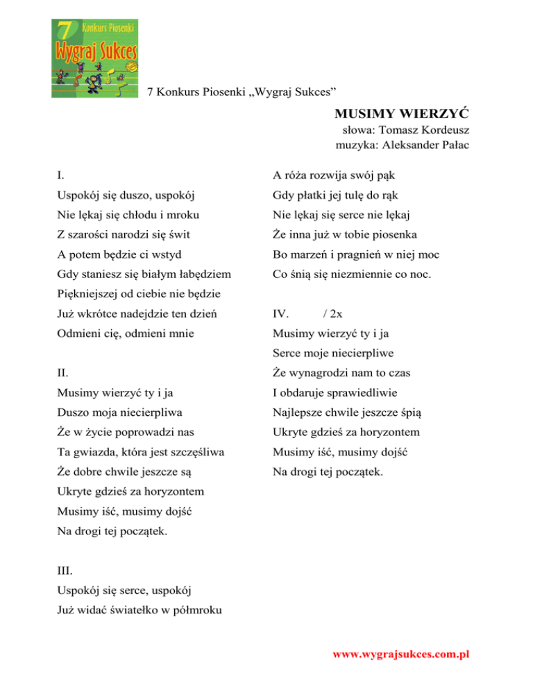 7 Konkurs Piosenki „Wygraj Sukces” MUSIMY WIERZYĆ słowa: Tomasz Kordeusz muzyka: Aleksander Pałac I. A róża rozwija swój pąk Uspokój się duszo, uspokój Gdy płatki jej tulę do rąk Nie lękaj się chłodu i mroku Nie lękaj się serce nie lękaj Z szarości narodzi się świt Że inna już w tobie piosenka A potem będzie ci wstyd Bo marzeń i pragnień w niej moc Gdy staniesz się białym łabędziem Co śnią się niezmiennie co noc. Piękniejszej od ciebie nie będzie Już wkrótce nadejdzie ten dzień IV. Odmieni cię, odmieni mnie Musimy wierzyć ty i ja / 2x Serce moje niecierpliwe II. Że wynagrodzi nam to czas Musimy wierzyć ty i ja I obdaruje sprawiedliwie Duszo moja niecierpliwa Najlepsze chwile jeszcze śpią Że w życie poprowadzi nas Ukryte gdzieś za horyzontem Ta gwiazda, która jest szczęśliwa Musimy iść, musimy dojść Że dobre chwile jeszcze są Na drogi tej początek. Ukryte gdzieś za horyzontem Musimy iść, musimy dojść Na drogi tej początek. III. Uspokój się serce, uspokój Już widać światełko w półmroku www.wygrajsukces.com.pl
