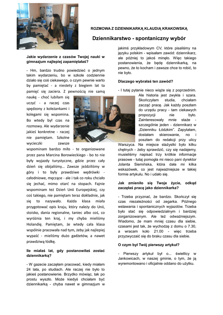 ROZMOWA Z DZIENNIKARKĄ KLAUDIĄ KRAKOWSKĄ Dziennikarstwo - spontaniczny wybór Jakie wydarzenie z czasów Twojej nauki w gimnazjum najlepiej zapamiętałaś? - Hm, bardzo trudno powiedzieć o jednym takim wydarzeniu, bo w szkole codziennie działo się coś ciekawego, o czym pewnie warto by pamiętad - a niestety z biegiem lat ta pamięd się zaciera. Z pewnością nie samą naukę - chod lubiłam się uczyd - a raczej czas spędzony z koleżankami i kolegami się wspomina. Bo wtedy był czas na rozmowy. Ale wydarzenie jakieś konkretne - raczej nie pamiętam. Szkolne wycieczki zawsze wspominam bardzo miło - te organizowane przez pana Marcina Borowieckiego - bo to nie były wyjazdy turystyczne, gdzie przez cały dzieo się obijaliśmy... Zawsze jeździliśmy w góry i to były prawdziwe wędrówki całodniowe, męczące - ale i tak co roku chciało się jechad, mimo otard na stopach. Fajnie wspominam też Dzieo Unii Europejskiej, czy coś takiego, nie pamiętam teraz dokładnie, jak się to nazywało. Każda klasa miała przygotowad opis kraju, który należy do Unii, stoisko, dania regionalne, taniec albo coś, co wyróżnia ten kraj, i my chyba mieliśmy Holandię. Pamiętam, że wtedy cała klasa wspólnie pracowała nad tym, żeby jak najlepiej wypaśd - mieliśmy dużo gadżetów, a nawet prawdziwą łódkę. Ile miałaś lat, gdy postanowiłaś zostać dziennikarką? - W gazecie zaczęłam pracować, kiedy miałam 24 lata, po studiach. Ale raczej nie było to jakieś postanowienie. Brzydko mówiąc, tak po prostu wyszło. Może kiedyś chciałam być dziennikarką - chyba nawet w gimnazjum w jakimś przykładowym CV, które pisaliśmy na języku polskim - wpisałam zawód: dziennikarz, ale później to jakoś minęło. Więc takiego postanowienia, że będę dziennikarką, na pewno, że to kocham i zawsze chce to robić, to nie było. Dlaczego wybrałaś ten zawód? - I tutaj pytanie nieco wiąże się z poprzednim. Ale historia jest zwykła i szara. Skończyłam studia, chciałam zacząć pracę. Jak każdy poszłam do urzędu pracy - tam ciekawych propozycji nie było. Zainteresowały mnie staże szczególnie jeden - dziennikarz w „Dzienniku Łódzkim”. Zapytałam, dostałam skierowanie, no i poszłam do redakcji przy ulicy Warszyca. Na miejsce stażystki było kilku chętnych - żeby sprawdzić, czy się nadajemy, musieliśmy napisać trzy krótkie informacje prasowe - tutaj pomogła mi nieco pani dyrektor Jolanta Siemińska, która dała mi kilka wskazówek, co jest najważniejsze w takiej formie artykułu. No i udało się. Jak zmieniło się Twoje życie, zaczęłaś pracę jako dziennikarka? odkąd - Trzeba przyznać, że bardzo. Skończył się czas niezależności od zegarka. Późnego wstawania i spontanicznych wyjazdów. Trzeba było stać się odpowiedzialnym i bardziej zorganizowanym. Ale też odważniejszym. Wiadomo, że mam mniej czasu dla siebie, czasami jest tak, że wychodzę z domu o 7.30, a wracam koło 21.00 - więc trzeba przyzwyczaić się do braku czasu dla siebie. O czym był Twój pierwszy artykuł? - Pierwszy artykuł był o... świetlicy w Jankowicach, w naszej gminie, o tym, że ją wyremontowano i oficjalnie oddano do użytku. Na czym polega Twoja praca? - Ja po prostu zbieram i opracowuję aktualne wiadomości. Dzwonię, sprawdzam, dopytuję, piszę. A jak praca wygląda? Zależy, czy pracuję w gazecie, czy w telewizji. Jeśli w gazecie, to powiedzmy na przykładzie: idę na jakieś wydarzenie, np. koncert do Miejskiego Domu Kultury, jest na 18.00, wychodzę nieco wcześniej, przed koncertem pytam, czy wcześniej można porozmawiać z wykonawcą, jeśli tak, to zadaję mu kilka pytań, jeśli nie trzeba poczekać do końca lub można liczyć na to, że ze sceny artysta powie kilka ciekawych zdań. Robię zdjęcia osób siedzących na sali, później - artyście na scenie. Jeśli koncert ciekawy, zostaję, jeśli akurat nie w moim guście, można wyjść. Materiał z racji tego, że teraz wszystko musi być od razu w internecie, wrzucam na stronę radomsko.naszemiasto.pl. Nieco inaczej wygląda taki sam koncert, jeśli idzie się nie niego z ,,kamerą", czyli gdy pracuję w telewizji. Tutaj konieczne są wypowiedzi osób - bo bez tzw. setek - to właśnie wypowiedzi (nazwa od: sto procent wizji, sto procent fonii), nie ma materiału. Do materiału z koncertu najlepiej mieć ich kilka, około pięciu. Trzeba zapytać wykonawcę, czasami organizatora, a także publiczność już po koncercie, jak im się podobało. Z materiałem wraca się do redakcji. Trzeba stworzyć tekst. Później do niego dobrać odpowiednie wypowiedzi i zmontować - ale to już nie moja działka - chociaż próbuję się i tego nauczyć. Co najbardziej podoba Ci się w tym zawodzie? - To wolny zawód, nie ma ram godzinowych, w jakich musimy pracować. Chociaż zazwyczaj przychodzimy na 8.00-9.00, by poszukać sobie materiałów, umówić się, posprawdzać. W tym zawodzie fajne jest to, że poznaje się wielu ludzi, wiele zdań, także osoby znane, można z nimi rozmawiać i sprawdzić, czy są tacy, jak ich sobie wyobrażaliśmy. Często tak się okazuje. W pracy ważni są także ludzie, z jakimi się pracuje, a akurat i w gazecie „Dziennik Łódzki”, i w Telewizji NTL są świetni współpracownicy. Jakich rad udzieliłabyś początkującemu dziennikarzowi? - Trudno mi udzielać rad, bo jeszcze sama się uczę, cały czas. Po każdym materiale myślę, że można było to zrobić lepiej, inaczej. Po pierwsze, w tej pracy trzeba być cierpliwym, czasami nad jednym materiałem spędza się cały dzień. Nie można się łatwo poddawać i rezygnować. Trzeba być zawsze uprzejmym, nawet jeśli rozmówca jest do nas bardzo negatywnie nastawiony. Trzeba czytać teksty innych. Oglądać programy informacyjne, z nich można się dowiedzieć wiele, podpatrzeć, jak ktoś zadaje pytania, na co zwraca uwagę. A przede wszystkim warto pytać osoby już doświadczone, nie wstyd