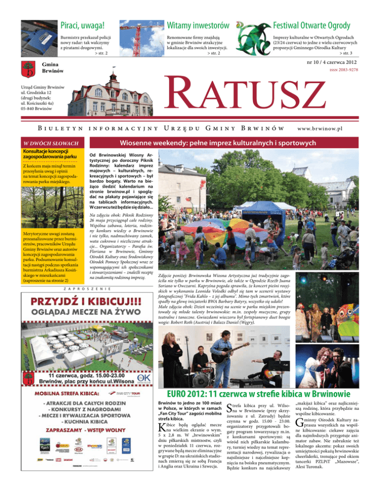 Piraci, uwaga! Witamy inwestorów Festiwal Otwarte Ogrody Burmistrz przekazał policji nowy radar: tak walczymy z piratami drogowymi. > str. 2 Renomowane firmy znajdują w gminie Brwinów atrakcyjne lokalizacje dla swoich inwestycji. > str. 2 Imprezy kulturalne w Otwartych Ogrodach (23/24 czerwca) to jedne z wielu czerwcowych propozycji Gminnego Ośrodka Kultury > str. 3 nr 10 / 4 czerwca 2012 RAtusz Gmina Brwinów Urząd Gminy Brwinów ul. Grodziska 12 (drugi budynek: ul. Kościuszki 4a) 05-840 Brwinów Biuletyn informacyjny Urzędu Gminy Brwinów w dwóch Słowach Konsultacje koncepcji zagospodarowania parku Z końcem maja minął termin przesyłania uwag i opinii na temat koncepcji zagospodarowania parku miejskiego. Merytoryczne uwagi zostaną przeanalizowane przez burmistrzów, pracowników Urzędu Gminy Brwinów oraz autorów koncepcji zagospodarowania parku. Podsumowanie konsultacji nastąpi podczas spotkania burmistrza Arkadiusza Kosińskiego w mieszkańcami (zaproszenie na stronie 2) issn 2083-9278 w w w. br w i now. pl Wiosenne weekendy: pełne imprez kulturalnych i sportowych Od Brwinowskiej Wiosny Artystycznej po doroczny Piknik Rodzinny: kalendarz imprez majowych – kulturalnych, rekreacyjnych i sportowych – był bardzo bogaty. Warto na bieżąco śledzić kalendarium na stronie brwinow.pl i spoglądać na plakaty pojawiające się na tablicach informacyjnych. W czerwcu też będzie się działo... Na zdjęciu obok: Piknik Rodzinny 26 maja przyciągnął całe rodziny. Wspólna zabawa, loteria, rodzinny konkurs wiedzy o Brwinowie i nie tylko, nadmuchiwany zamek, wata cukrowa i niezliczone atrakcje... Organizatorzy – Parafia św. Floriana w Brwinowie, Gminny Ośrodek Kultury oraz Środowiskowy Ośrodek Pomocy Społecznej wraz ze wspomagającymi ich społecznikami i stowarzyszeniami – znaleźli receptę na znakomitą rodzinną imprezę. z a p r o s z e n i e Zdjęcie poniżej: Brwinowska Wiosna Artystyczna już tradycyjnie zagościła nie tylko w parku w Brwinowie, ale także w Ogrodzie Rzeźb Juana Soriano w Owczarni. Kapryśna pogoda sprawiła, że koncert pieśni rosyjskich w wykonaniu Leonida Volodki odbył się tam w scenerii wystawy fotograficznej "Frida Kahlo – z jej albumu". Mimo tych zmartwień, które spadły na głowę inicjatorki BWA Barbary Batyry, wszystko się udało! Małe zdjęcia obok: Dzień wcześniej na scenie w parku miejskim prezentowały się młode talenty brwinowskie: m.in. zespoły muzyczne, grupy teatralne i taneczne. Gwiazdami wieczoru był fortepianowy duet boogie wogie: Robert Roth (Austria) i Balazs Daniel (Węgry). EURO 2012: 11 czerwca w strefie kibica w Brwinowie Brwinów to jedno ze 100 miast w Polsce, w których w ramach „Fan City Tour” zagości mobilna strefa kibica. ibice będą oglądać mecze na wielkim ekranie o wym. 5 x 2,8 m. W „brwinowskim” dniu piłkarskich mistrzostw, czyli w poniedziałek 11 czerwca, rozgrywane będą mecze eliminacyjne w grupie D: na ukraińskich stadionach zmierzą się ze sobą Francja i Anglia oraz Ukraina i Szwecja. K S trefa kibica przy ul. Wilsona w Brwinowie (przy skrzyżowaniu z ul. Zatrudy) będzie czynna w godz. 15.00 - 23.00. organizatorzy przygotowali bogaty program towarzyszący m.in. z konkursami sportowymi: są wśród nich piłkarskie kalambury, turniej wiedzy na temat reprezentacji narodowej, rywalizacja o najsilniejsze i najcelniejsze kopnięcia na boisku pneumatycznym. Będzie konkurs na najciekawszy „makijaż kibica” oraz najliczniejszą rodzinę, która przybędzie na wspólne kibicowanie. minny Ośrodek Kultury zaprasza wszystkich na wspólne kibicowanie: ciekawe zajęcia dla najmłodszych przygotuje animator zabaw. Nie zabraknie też lokalnego akcentu: pokaz swoich umiejętności pokażą brwinowskie cheerliderki, trenujące pod okiem tancerki PZLPiT „Mazowsze”, Alesi Turonak. G 2 ratusz Biuletyn informacyjny Urzędu Gminy Brwinów nr 10 4 czerwca 2012 „ O „ soby jeżdżące ponad 100 km/h na terenie gęsto zabudowanym są potencjalnymi mordercami. Mam nadzieję, że już sam codzienny widok radaru na naszych drogach ostudzi co gorętsze głowy o ciężkich stopach ;-) - Arkadiusz Kosiński, burmistrz gminy Brwinów Bezpieczniejsza jazda po brwinowskich drogach W czwartek 24 maja brwinowska policja wzbogaciła się o laserowy przyrząd do pomiaru prędkości pojazdów. Nowy radar został zakupiony przez gminę Brwinów. becny przy przekazaniu miernika prędkości komendant powiatowy policji w Pruszkowie Waldemar Perdion zaznaczył, że jest to drugie tego typu urządzenie w powiecie pruszkowskim. Posiadaczem pierwszego jest policja w Piastowie. Radar, który trafił w ręce komendanta Macieja Wicińskiego, to nowoczesne urządzenie, zdol- Fot. PR (3) O ne do mierzenia prędkości do 320 km/h i to już z odległości 1200 m. Jego obsługą, zgodnie ze znowelizowanymi przepisami, będą zajmować się policjanci z posterunku w Brwinowie. W ciągu sekundy można wykonać kilka pomiarów. Koszt zakupu urządzenia to 19.395,87 zł. S prawność działania urządzenia, które ma przyczynić się do poprawy bezpieczeństwa na drogach w gminie Brwinów, osobiście sprawdzał burmistrz Arkadiusz Kosiński, który dokonywał pomiarów przy ul. Grodziskiej w Brwi- nowie. Zatrzymani zaskoczeni kierowcy na początek częstowani byli cukierkami. Następnym razem nie będzie tak słodko i nie uda im się uniknąć mandatów. akup radaru to inwestycja, której głównym celem jest poprawa bezpieczeństwa mieszkańców w tych rejonach miasta i gminy, gdzie kierowcy rozwijają największą prędkość. Szczególny nacisk położony zostanie m.in. na ulice przy Zespole Szkół nr 1, ulicę Wilsona w Brwinowie oraz wjazd do Owczarni od strony Książenic – mówił burmistrz Arkadiusz Kosiński. w dwóch Słowach Brwinów przystępuje do Związku Miast Polskich Z Gmina Brwinów: dobre miejsce dla inwestorów Inwestorów przyciąga do gminy Brwinów bliskość autostrady A2, a do l