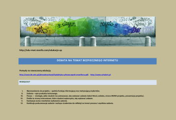 http://edu-mwt.manifo.com/edukacja-up DEBATA NA TEMAT BEZPIECZNEGO INTERNETU Pomysły na nowoczesną edukację http://www.ldc.edu.pl/phocadownload/Dydaktyka-cyfrowa-epoki-smartfona.pdf; http://www.scholaris.pl WEBQUEST I. II. III. IV. V. VI. Wprowadzenie do projektu – spełnia funkcję informującą oraz motywującą studentów. Zadania – opis produktu końcowego. Proces – strategie, jakie student ma zastosować, aby wykonać zadanie (tekst Word, ankieta, strona WWW projektu, prezentacja projektu). Źródło to strony internetowe, które student wykorzysta, aby wykonać zadanie. Ewaluacja ocena rezultatów wykonania zadania. Konkluzja podsumowuje zadanie i zachęca studentów do refleksji na temat procesu i wyników zadania. I. III. SPOŁECZEŃSTWO INFORMACYJNE II. – NOWY WYMIAR WSPÓŁCZESNEGO ŚWIATA BEZPIECZEŃSTWO W SIECI VI. PRAWO AUTORSKIE W SIECI XVI. OPINIA PUBLICZNA, WYRAŻANIE SPRZECIWU IV. CYBERPRZEMOC VIII. VII. ZASTOSOWANIA RZECZYWISTOŚCI WIRTUALNEJ XI. NAJCZĘSTSZE ZAGROŻENIA, NA JAKIE NARAŻONE SĄ DZIECI W SIECI ZUI (ZESPÓŁ UZALEŻNIENIA OD INTERNETU) – SIECIOCHOLIZM (RODZAJE) XII. KOMUNIKACJA W INTERNECIE XVII. AKTYWNOŚĆ OBYWATELSKA SIECIOWE FORMY UPOWSZECHNIANIA EDUKACJI OBYWATELSKIEJ. ORGANIZACJA I ZARZĄDZANIE XIII. AUTOPREZENTACJA W SIECI – PSYCHOLOGIA INTERNETU XVIII. WOLONTARIAT I ORGANIZACJE POZARZĄDOWE V. SPOŁECZNOŚCI INTERNETOWE X. IX. EDUTAINMENT („UCZYĆ BAWIĄC”) PRZECIWDZIAŁANIE WYKLUCZENIU CYFROWEMU (PODZIAŁ CYFROWY, ang. DIGITAL DIVIDE) XIV. INNOWACJE I TECHNOLOGIE INFORMACYJNE PRZYSZŁOŚCIĄ NOWOCZESNEJ EDUKACJI XV. POTĘGA MEDIÓW XIX. PODSTAWOWE UMIEJĘTNOŚCI OBYWATELSKIE XX. GENDER/ RÓWNOŚĆ ZADANIA Zasady pisania prac (warunki edytorskie) wg: http://www.knti.amu.edu.pl/strony/html/licencjat.pdf [dostęp do źródeł cyfrowych 30.06.2013] I. SPOŁECZEŃSTWO INFORMACYJNE – NOWY WYMIAR WSPÓŁCZESNEGO ŚWIATA ..................................................................................... 5 II. BEZPIECZEŃSTWO W SIECI ............................................................................................................................................................................. 6 III. ZUI (ZESPÓŁ UZALEŻNIENIA OD INTERNETU) – SIECIOCHOLIZM (RODZAJE) .............................................................................................. 8 IV. CYBERPRZEMOC ............................................................................................................................................................................................ 9 V. SPOŁECZNOŚCI INTERNETOWE .................................................................................................................................................................... 10 VI. PRAWO AUTORSKIE W SIECI ....................................................................................................................................................................... 12 VII. ZASTOSOWANIA RZECZYWISTOŚCI WIRTUALNEJ ..................................................................................................................................... 13 VIII. SIECIOWE FORMY UPOWSZECHNIANIA EDUKACJI OBYWATELSKIEJ. ORGANIZACJA I ZARZĄDZANIE .................................................. 14 IX. EDUTAINMENT („UCZYĆ BAWIĄC”) ............................................................................................................................................................ 15 X. PRZECIWDZIAŁANIE WYKLUCZENIU CYFROWEMU (PODZIAŁ CYFROWY, ANG. DIGITAL DIVIDE) ............................................................ 16 XI. NAJCZĘSTSZE ZAGROŻENIA, NA JAKIE NARAŻONE SĄ DZIECI W SIECI ...................................................................................................... 17 XII. KOMUNIKACJA W INTERNECIE. ................................................................................................................................................................. 18 XIII. AUTOPREZENTACJA W SIECI – PSYCHOLOGIA INTERNETU ..................................................................................................................... 20 XIV. INNOWACJE I TECHNOLOGIE INFORMACYJNE PRZYSZŁOŚCIĄ NOWOCZESNEJ EDUKACJI .................................................................... 21 XV. POTĘGA MEDIÓW – CZWARTA WŁADZA .................................................................................................................................................. 22 XVI. OPINIA PUBLICZNA, WYRAŻANIE SPRZECIWU ......................................................................................................................................... 23 XVII. AKTYWNOŚĆ OBYWATELSKA .................................................................................................................................................................. 24 XVIII. WOLONTARIAT I ORGANIZACJE POZARZĄDOWE .................................................................................................................................. 24 XIX. PODSTAWOWE UMIEJĘTNOŚCI OBYWATELSKIE ..................................................................................................................................... 26 XX. GENDER/ RÓWNOŚĆ .................................................................................................................................................................................. 27 I. SPOŁECZEŃSTWO INF ORMACYJNE – NOWY WYMIAR WSPÓŁCZESNEGO ŚWIATA 1. Aspekt edukacyjny – społeczeństwo informacji i wiedzy, gdzie owa informacja i edukacja w jej przetwarzaniu oraz zastosowaniu mają być drogą do umiejętności, wiedzy i władzy. 2. Aspekt demokratyczny – społeczeństwo, które ma wolny dostęp do informacji. Każdy obywatel ma prawo do informowania innych i bycia samemu informowanym. 3. Aspekt techniczny – jako społeczeństwo kreowane przez Internet i stale rozwijającą się 