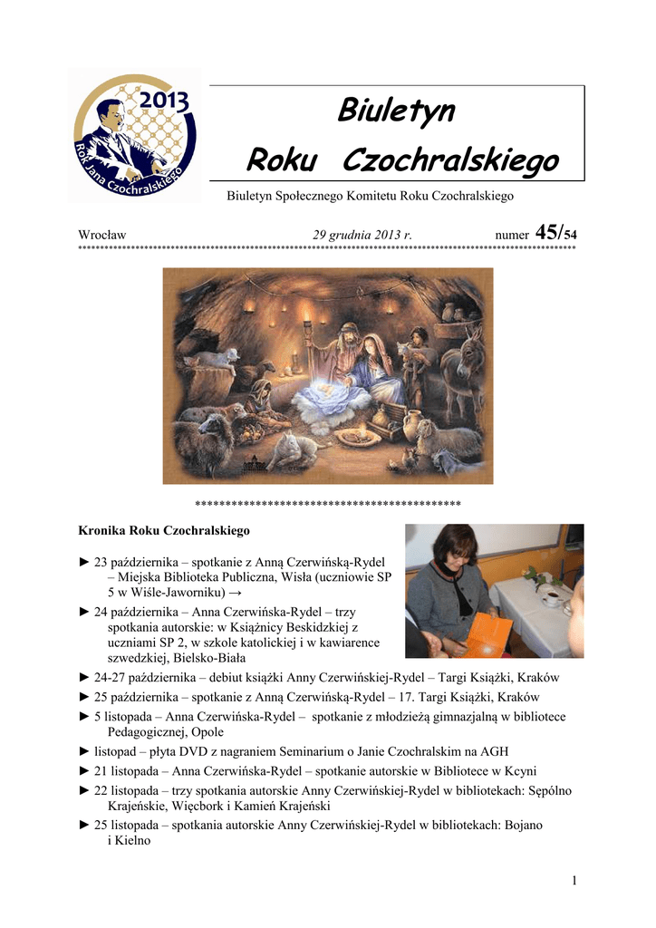 Biuletyn Roku Czochralskiego Biuletyn Społecznego Komitetu Roku Czochralskiego Wrocław 29 grudnia 2013 r. numer 45/54 ***************************************************************************************************************** ******************************************** Kronika Roku Czochralskiego ► 23 października – spotkanie z Anną Czerwińską-Rydel – Miejska Biblioteka Publiczna, Wisła (uczniowie SP 5 w Wiśle-Jaworniku) → ► 24 października – Anna Czerwińska-Rydel – trzy spotkania autorskie: w Książnicy Beskidzkiej z uczniami SP 2, w szkole katolickiej i w kawiarence szwedzkiej, Bielsko-Biała ► 24-27 października – debiut książki Anny Czerwińskiej-Rydel – Targi Książki, Kraków ► 25 października – spotkanie z Anną Czerwińską-Rydel – 17. Targi Książki, Kraków ► 5 listopada – Anna Czerwińska-Rydel – spotkanie z młodzieżą gimnazjalną w bibliotece Pedagogicznej, Opole ► listopad – płyta DVD z nagraniem Seminarium o Janie Czochralskim na AGH ► 21 listopada – Anna Czerwińska-Rydel – spotkanie autorskie w Bibliotece w Kcyni ► 22 listopada – trzy spotkania autorskie Anny Czerwińskiej-Rydel w bibliotekach: Sępólno Krajeńskie, Więcbork i Kamień Krajeński ► 25 listopada – spotkania autorskie Anny Czerwińskiej-Rydel w bibliotekach: Bojano i Kielno 1 ► 26 listopada – spotkania autorskie Anny Czerwińskiej-Rydel w bibliotekach: Częstkowo i Łebno ► 28 listopada – spotkania autorskie Anny Czerwińskiej-Rydel w bibliotekach: Ośrodka Czytelnictwa chorych i niepełnosprawnych i w Filii nr 18, Gdańsk ► 29 listopada – spotkania autorskie Anny CzerwińskiejRydel – Biblioteka Zespołu Szkół, Straszyn, gmina Pruszcz Gdański (fot. →) i szkoła katolicka w Pruszczu ► 5 grudnia – spotkania autorskie Anny CzerwińskiejRydel – Warszawa: biblioteki w Białołęce i na Bielanach ► 9 grudnia – spotkania autorskie Anny CzerwińskiejRydel – Szkoła Podstawowa nr 19, Gdańsk ► 11 grudnia – spotkania autorskie Anny Czerwińskiej-Rydel – SP 10 i SP 11, Tczew ► 12 grudnia – spotkanie autorskie Anny Czerwińskiej-Rydel – biblioteka w Szemudzie ► 16 grudnia – spotkanie autorskie Anny Czerwińskiej-Rydel – Gimnazjum 25, Gdańsk ► 18 grudnia – Paweł E. Tomaszewski – Jan Czochralski - historia człowieka niezwykłego – Komisja Historii Nauki PAU, Kraków [ostatni w tym roku, 27. referat] ► 18 grudnia – Bogusław Major – Profesor Jan Czochralski wielki i nieznany – Instytut Metali Nieżelaznych, Gliwice ► 19 grudnia – spotkania autorskie Anny Czerwińskiej-Rydel – SP nr 19, Gdańsk ► 19 grudnia - 30 stycznia 2014 r. – wystawy kcyńska i warszawska – Gimnazjum Leonarda Piwoni i inne szczecińskie szkoły ► 20 grudnia – Elżbieta Rupniewska – Vivat Academia! – godzinna audycja [od godz. 20] Polskiego Radia PiK (Pomorza i Kujaw) z udziałem P. Hemmerlinga, A. DudyNowickiej i M. Poczobutta ► 28 grudnia – podsumowanie Roku Czochralskiego w Kcyni [obszerne sprawozdanie na stronie www.kcynia.info/index.php?a=2896&id=6] ► 28 grudnia – książka "Prof. Jan Czochralski. Kcynia wobec Jana Czochralskiego", Kcynia Sprostowanie: w poprzednim numerze zabrakło informacji o autorach „prelekcji i filmu” wymienionych w Kronice. Prelegentem był Michał Poczobutt, a film „Wielki Powrót” reżyserował Dariusz Grzeszczyk. Przepraszamy :-) Zapowiedzi ♥ 9 stycznia 2014 r. – Paweł E. Tomaszewski – Jan Czochralski – Stowarzyszenie Inżynierów i Techników Mechaników Polskich, Koło Terenowe SIMP, oraz Miejska Biblioteka Publiczna, Chojnów, sala Biblioteki, godz. 17:00 Informacje prasowe i internetowe ♦ 24-27 października – debiut książki Anny Czerwińskiej-Rydel – 17. Targi Książki, Kraków - www.targi.krakow.pl/pl/strona-glowna/targi/17-targi-ksiazki-w-krakowie/programtowarzyszacy/spotkania-dla-dzieci.html ♦ 23 października – Renata Czyż – Spotkanie z Anną Czerwińską-Rydel – http://katalog.biblioteka.wisla.e-bp.eu/?author=2 2 ♦ 5 listopada – Polskie Radio Opole – www.radio.opole.pl/wiadomosci,18689.html [rozmowa z Anną Czerwińską-Rydel] ♦ 7 listopada – Spotkanie autorskie w Książnicy Beskidzkiej – www.sp2.rejbb.pl/aktualnosci/ aktualnosci-2013-2014 [o spotkaniu Anny Czerwińskiej-Rydel z uczniami SP 2] ♦ 17 listopada – Małgosia Biernat – POWIEŚĆ O JANIE CZOCHRALSKIM Anny Czerwińskiej - Rydel nominowana – www.osowa.com/news,9342,1.html ♦ 21 listopada – Anna Duda-Nowicka – Kryształowe odkrycie - nowa książka o Janie Czochralskim i rozstrzygnięcie konkursu – www.kurier-nakielski.pl/?a=15535&id=6 ♦ 26 listopada – Spotkanie autorskie z Anną Czerwińską – Rydel – www.gminasepolno.pl/?id=9&look=3180 [l] ♦ 30 listopada – Ojciec Krzemu - Czochralski Jan – http://mms.neon24.pl/post/102487,ojciekrzemu-czochralski-jan [A] ♦ 30 listopada – Kup książkę pod choinkę o Czochralskim – http://mms.neon24.pl/post/102512,kup-ksiazke-pod-choinke-o-czochralskim ♦ 5 grudnia – (Ja) – Spotkanie z Anną Czerwińską-Rydel – http://biblioteka-zsstraszyn.blogspot.com/2013/12/spotkanie-z-anna-czerwinska-rydel.html ♦ 9 grudnia – Autorzy z wizytą. Anna Czerwińska-Rydel – www.gmprgdbiblioteka.org.pl/content/view/403/49/ [I] ♦ 12 grudnia – Marek Wiergowski – Spotkanie z pisarką Anną Czerwińską-Rydel w ZS w Straszynie – http://straszyn.info/2013/12/12/spotkanie-z-pisarka-anna-czerwinskarydel-w-zs-w-straszynie/ [I] ♦ 19 grudnia – Elżbieta Kubera – Ojciec rewolucji elektronicznej – http://24kurier.pl/Aktualnosci/Szczecin/Ojciec-rewolucji--elektronicznej ♦ 19 grudnia – Anna Duda-Nowicka – Audycja o Czochralskim w Radiu PiK i wystawa w Parlamencie Europejskim – www.kcynia.pl/aktualnosci/cb18a8818e16fed17a23f39604542a39.html?ng_cat=1 ♦ 20 grudnia – (admin) – Spotkanie autorskie – www.sp11.tczew.pl/?q=node/177 [I] ♦ 23 grudnia – Elżbiet