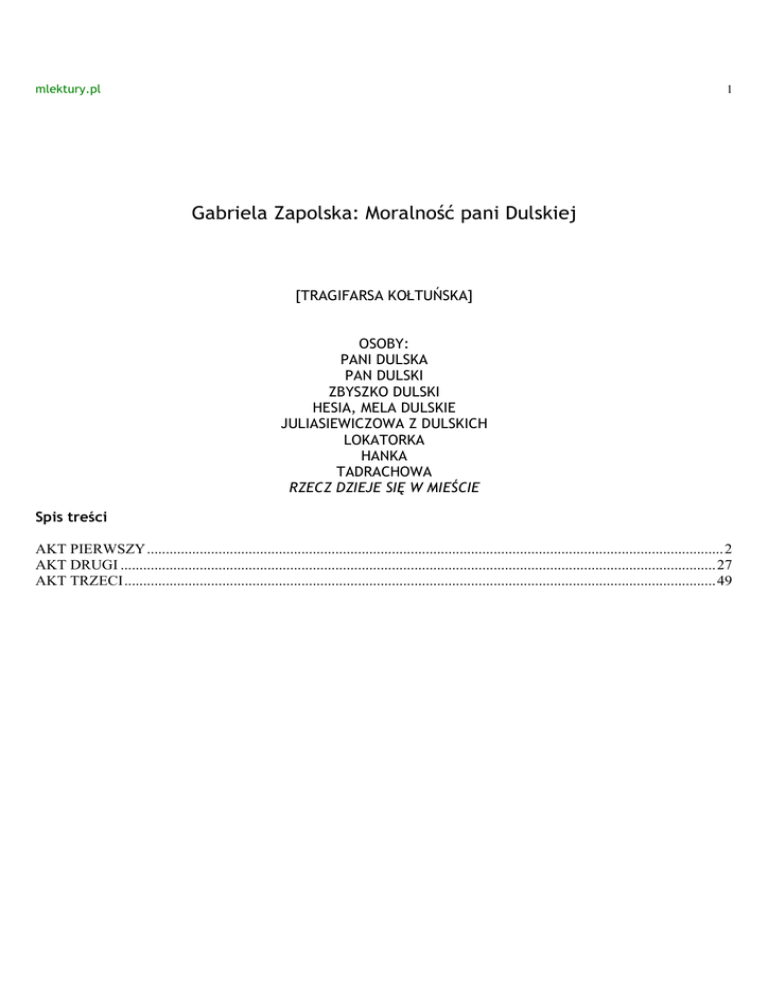 mlektury.pl 1 Gabriela Zapolska: Moralność pani Dulskiej [TRAGIFARSA KOŁTUŃSKA] OSOBY: PANI DULSKA PAN DULSKI ZBYSZKO DULSKI HESIA, MELA DULSKIE JULIASIEWICZOWA Z DULSKICH LOKATORKA HANKA TADRACHOWA RZECZ DZIEJE SIĘ W MIEŚCIE Spis treści AKT PIERWSZY.........................................................................................................................................................2 AKT DRUGI ..............................................................................................................................................................27 AKT TRZECI.............................................................................................................................................................49 mlektury.pl 2 AKT PIERWSZY Scena przedstawia salon w burŜuazyjnym domu. Dywany, meble solidne, na ścianach w złoconych ramach premia i Bóg wie jakie obrazy. Rogi obfitości, sztuczne palmy, landszaft haftowany za szkłem. Pomiędzy tym stara piękna serwantka mahoniowa i empirowy ekranik. Lampa z abaŜurem z bibuły, stoliki, a na nich fotografie. Rolety pospuszczane, na scenie ciemno. Gdy zasłona się podnosi, zegar w jadalni bije godzinę szóstą. W czasie pierwszych scen powoli rozwidnia się, wreszcie rozwidnia się zupełnie, gdy story podniosą. SCENA PIERWSZA Chwilę scena pozostaje pusta. Słychać za kulisami człapanie pantofli. Z lewej (sypialnia małŜeńska) wchodzi Dulska w stroju niedbałym. Papiloty, z tyłu cienki kosmyk, kaftanik biały wątpliwej czystości, halka włóczkowa krótka, poddarta na brzuchu. Idzie mrucząc, świeca w ręku. Stawia świecę na stole, idzie do kuchni. DULSKA Kucharka! Hanka! wstawać!... (mruczenie w kuchni) Co? jeszcze czas? KsięŜniczki! Nie z waszym nosem, a juŜ wstałam... Cicho, kucharka, nie rezonować. Palić pod kuchnią. Hanka! chodź palić w piecu w salonie. A Ŝywo!... (idzie ku drzwiom na prawo) Heśka! Mela! wstawać! lekcje przepowiedzieć, gamy do grania... prędzej... nie gnić w łóŜkach!... Chwilę chodzi po scenie, mrucząc. Idzie do pierwszych drzwi na prawo, zagląda, łamie ręce, wchodzi do pokoju ze świecą. SCENA DRUGA Dulska, Hanka. Hanka bosa, spódnica ledwo zawiązana, koszula, kaftanik.narzucony, niesie smolaki i trochę węgli. Przykuca przy piecu, rozpala, pociąga nosem, wzdycha. Wchodzi Dulska, zła. DULSKA Jak palisz? jak palisz? skaranie boŜe z tym tłumokiem. Do krów, do krów, nie do pańskich pieców. Czego niszczysz tyle smolaków! Czekaj, ustąp się, ty do niczego, ja ci pokaŜę (przykuca sama i pali w piecu) Ruszaj zbudzić panienki, a jak nie zechcą wstać, to pościągaj kołdry. Hanka idzie do pokoju dziewcząt, Dulska pali w piecu i dmucha, jaskrawy płomień oświetla jej twarz tłustą i nalaną. Wraca Hanka. CóŜ panny? wstają? HANKA Pościągałam kołdry. Panna Hesia kopnęła mnie w brzucho. DULSKA Wielka afera, zgoi się do wesela. Chwila milczenia. HANKA Proszę wielmoŜnej pani... DULSKA Widzisz, jak się w piecu pali... HANKA Proszę wielmoŜnej pani... DULSKA mlektury.pl 3 Ja o wszystkim myśleć muszę. Niedługo przez was to zejdę do grobu. HANKA całuje ją w rękę Proszę wielmoŜnej pani! Ja chciałam prosić, Ŝe ja juŜ od pierwszego pójdę sobie. DULSKA Co? Jak? HANKA ciszej Pójdę sobie. DULSKA Ani mi się waŜ. Ja za ciebie zapłaciłam w kantorze. Musisz dalej słuŜyć. A to mi się podoba. HANKA Ja dam na swoje miejsce. DULSKA Patrzcie ją, jak się odgryzła. JuŜ jej się w głowie przewróciło. O! juŜ miasto na nią działa. MoŜe na pannę słuŜącą się śpieszy? co? HANKA Proszę wielmoŜnej pani, to... przez panicza. DULSKA A... HANKA Tak... ja nie chcę... bo to... DULSKA Znowu? HANKA Ciągle... a to to, a to tak, a ja przecieŜ... DULSKA nie patrząc na nią No dobrze, ja mu powiem. HANKA Proszę wielmoŜnej pani, to na nic. Przecie wielmoŜna pani juŜ nie raz, nie dwa mówiła, Ŝe mówiła... DULSKA No - ale teraz to pomoŜe. HANKA Bo ksiądz mówił, Ŝeby odejść. DULSKA Czy ty u księdza słuŜysz, czy u mnie? HANKA Ale ja księdza muszę słuchać. DULSKA Idź po mleko i po bułki. HANKA Idę, proszę wielmoŜnej pani. Wychodzi. DULSKA idzie ku drzwiom sypialni małŜeńskiej Felicjanie! Felicjanie! wstawaj!... spóźnisz się do biura! (idzie do drzwi mlektury.pl 4 sypialni córek) Hesia! Mela! spóźnicie się na pensję... GŁOS HESI Mamuńciu, tak zimno! troszkę ciepłej wody... DULSKA Jeszcze czego! Hartujcie się... Felicjan! Wstajesz? Wiesz? ten błazen, twój syn, nie wrócił jeszcze do domu! Co? nic nie mówisz? naturalnie! Ojciec toleruje. Niedaleko padło jabłko od jabłoni. Ale jak będą dłuŜki małe - nie zapłacę. HANKA uchyla drzwi od kuchni Proszę wielmoŜnej pani, stróŜ przyszedł o meldunki tych państwa, co się sprowadzili. DULSKA Idę! Hesia! Mela! Felicjan! A to śpiąca familia. No! no! z torbami poszlibyśmy, Ŝeby nie ja... (wchodząc do kuchni) Dlaczego stróŜ zostawia na dziedzińcu nową miotłę? Deszcz leje... Zamyka drzwi. Głos ginie. SCENA TRZECIA Hesia, Mela Hesia, Mela wybiegają ze swojego pokoju, krótkie spódniczki jednakowe, barchanowe kaftaniki, włosy rozpuszczone, biegną do pieca, przykucają przed drzwiczkami. HESIA Chodź! chodź! MELA Nie ma jej? HESIA Nie ma, słyszysz przecieŜ, jak myje głowę stróŜowi. Ha! jak miło ogrzać się trochę. MELA No! nie pchaj się, ja takŜe... HESIA Czekaj, poprawię. A teraz daj grzebień, to cię uczeszę. MELA Daj spokój! Jak zobaczy, będzie krzyk. HESIA Niech krzyczy. Ja się nie boję. MELA Ale ja się boję. To tak nieprzyjemnie, jak ktoś głośno krzyczy. HESIA Bo ty jesteś sentymentalna. Ty się wdałaś w ojca. Lelum polelum... MELA Skąd ty wiesz, jaki jest ojciec? przecieŜ ojciec nic nie mówi. HESIA E! juŜ ja wiem. Zresztą masz jego nos. MELA To dziwne. HESIA czesze ją Co? mlektury.pl 5 MELA Niby, Ŝe dziecko podobne do ojca albo do matki. Jak to się dzieje? HESIA A ja wiem!