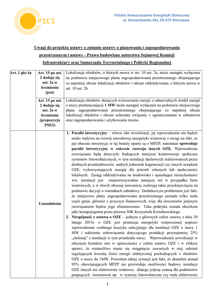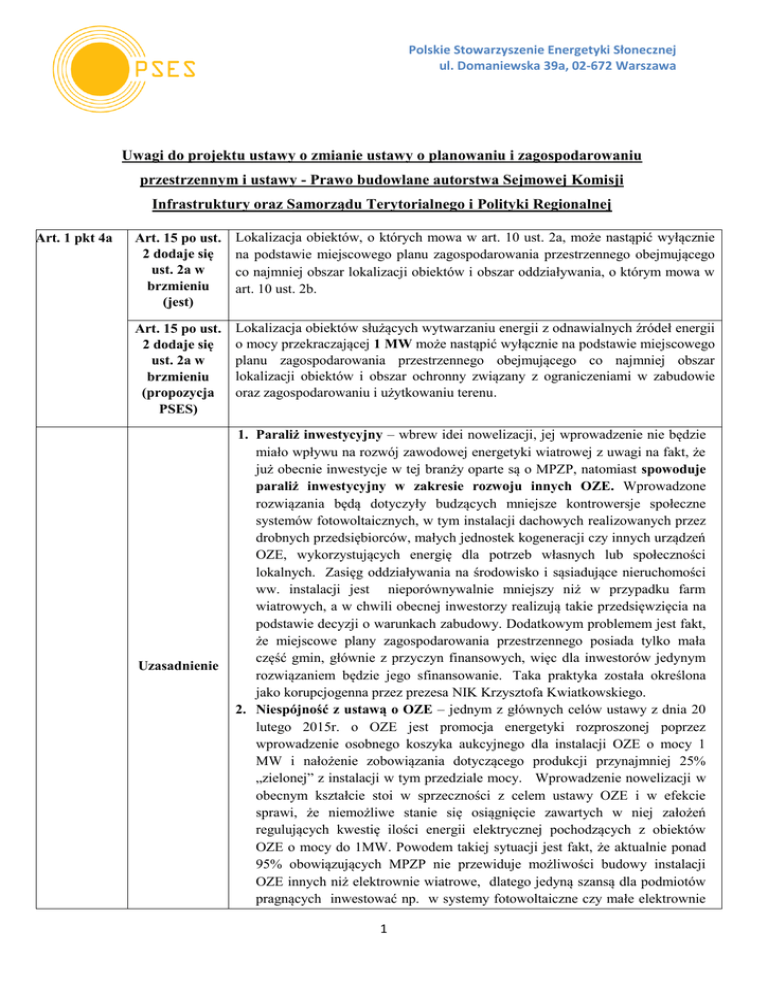 Polskie Stowarzyszenie Energetyki Słonecznej ul. Domaniewska 39a, 02-672 Warszawa Uwagi do projektu ustawy o zmianie ustawy o planowaniu i zagospodarowaniu przestrzennym i ustawy - Prawo budowlane autorstwa Sejmowej Komisji Infrastruktury oraz Samorządu Terytorialnego i Polityki Regionalnej Art. 1 pkt 4a Art. 15 po ust. 2 dodaje się ust. 2a w brzmieniu (jest) Lokalizacja obiektów, o których mowa w art. 10 ust. 2a, może nastąpić wyłącznie na podstawie miejscowego planu zagospodarowania przestrzennego obejmującego co najmniej obszar lokalizacji obiektów i obszar oddziaływania, o którym mowa w art. 10 ust. 2b. Art. 15 po ust. 2 dodaje się ust. 2a w brzmieniu (propozycja PSES) Lokalizacja obiektów służących wytwarzaniu energii z odnawialnych źródeł energii o mocy przekraczającej 1 MW może nastąpić wyłącznie na podstawie miejscowego planu zagospodarowania przestrzennego obejmującego co najmniej obszar lokalizacji obiektów i obszar ochronny związany z ograniczeniami w zabudowie oraz zagospodarowaniu i użytkowaniu terenu. Uzasadnienie 1. Paraliż inwestycyjny – wbrew idei nowelizacji, jej wprowadzenie nie będzie miało wpływu na rozwój zawodowej energetyki wiatrowej z uwagi na fakt, że już obecnie inwestycje w tej branży oparte są o MPZP, natomiast spowoduje paraliż inwestycyjny w zakresie rozwoju innych OZE. Wprowadzone rozwiązania będą dotyczyły budzących mniejsze kontrowersje społeczne systemów fotowoltaicznych, w tym instalacji dachowych realizowanych przez drobnych przedsiębiorców, małych jednostek kogeneracji czy innych urządzeń OZE, wykorzystujących energię dla potrzeb własnych lub społeczności lokalnych. Zasięg oddziaływania na środowisko i sąsiadujące nieruchomości ww. instalacji jest nieporównywalnie mniejszy niż w przypadku farm wiatrowych, a w chwili obecnej inwestorzy realizują takie przedsięwzięcia na podstawie decyzji o warunkach zabudowy. Dodatkowym problemem jest fakt, że miejscowe plany zagospodarowania przestrzennego posiada tylko mała część gmin, głównie z przyczyn finansowych, więc dla inwestorów jedynym rozwiązaniem będzie jego sfinansowanie. Taka praktyka została określona jako korupcjogenna przez prezesa NIK Krzysztofa Kwiatkowskiego. 2. Niespójność z ustawą o OZE – jednym z głównych celów ustawy z dnia 20 lutego 2015r. o OZE jest promocja energetyki rozproszonej poprzez wprowadzenie osobnego koszyka aukcyjnego dla instalacji OZE o mocy 1 MW i nałożenie zobowiązania dotyczącego produkcji przynajmniej 25% „zielonej” z instalacji w tym przedziale mocy. Wprowadzenie nowelizacji w obecnym kształcie stoi w sprzeczności z celem ustawy OZE i w efekcie sprawi, że niemożliwe stanie się osiągnięcie zawartych w niej założeń regulujących kwestię ilości energii elektrycznej pochodzących z obiektów OZE o mocy do 1MW. Powodem takiej sytuacji jest fakt, że aktualnie ponad 95% obowiązujących MPZP nie przewiduje możliwości budowy instalacji OZE innych niż elektrownie wiatrowe, dlatego jedyną szansą dla podmiotów pragnących inwestować np. w systemy fotowoltaiczne czy małe elektrownie 1 Polskie Stowarzyszenie Energetyki Słonecznej ul. Domaniewska 39a, 02-672 Warszawa wodne jest uzyskanie decyzji o warunkach zabudowy i realizacja przedsięwzięcia na terenach nieobjętych MPZP. Biorąc pod uwagę, że ostatnia aukcja OZE planowana jest w 2018r. to nawet przy optymistycznym (mało realnym) założeniu, że gminy przystąpią do uchwalania studiów uwarunkowań i MPZP dla małych instalacji OZE niezwłocznie po przyjęciu nowelizacji, to w rezultacie i tak nie będzie możliwe uczestnictwo w aukcjach obiektów o mocy do 1MW. Wynika to z długotrwałego procesu uchwalania dokumentów planistycznych i dalszego procesu inwestycyjnego, którego zakończenie jest warunkiem partycypacji w aukcji OZE. 3. Zahamowanie rozwoju MŚP i utrata miejsc pracy – z powodu wysokich kosztów przygotowania projektów, dużego ryzyka, konieczności przejścia przez długotrwały proces uchwalania dokumentów planistycznych, MŚP, rolnicy czy inwestorzy indywidualni wycofają się z inwestycji w rozproszone OZE. Spowoduje to wyparcie z branży sektora MŚP, który według raportu PARP „o stanie sektora małych i średnich przedsiębiorstw w ostatnich 10 latach generował średnio aż 48% PKB Polski. W Polsce jest obecnie kilkaset firm działających w sektorze OZE, generujących kilkadziesiąt tysięcy miejsc pracy, w tym producenci urządzeń, developerzy, firmy budowlane, dostawcy konstrukcji mocujących, producenci stacji transformatorowych i okablowania etc. W konsekwencji wprowadzenia nowelizacji liczba ta drastycznie zmaleje i będzie opierać się głównie o zatrudnieniu w energetyce wiatrowej. 4. Negatywny wpływ na rozwój polskiej gospodarki – nowelizacja ustawy w proponowanym kształcie powodująca paraliż inwestycyjny oraz utratę miejsc pracy będzie miała niewątpliwie negatywny wpływ na rozwój polskiej gospodarki. Ucierpi przemysł oferujący potrzebne urządzenia, np. kotły na biomasę czy panele słoneczne do produkcji ciepłej wody lub dostarczający podzespoły do urządzeń, oferując nie tylko innowacyjne miejsca pracy, ale pracujący wprost na wzrost polskiego PKB. Również rolnicy - dostawcy substratu do eksploatacji biogazowni rolniczych mocno odczują skutki nowelizacji. ust.1 (jest) Nie wszczyna się postępowań a postępowania wszczęte umarza, w sprawach wydania decyzji o warunkach zabudowy, o której mowa art. 59 ustawy zmienianej w art. 1, dotyczących możliwości lokalizacji obiektu służącego wytwarzaniu energii z odnawialnych źródeł energii o mocy przekraczającej 40 kW. ust. 1 (propozycja PSES) Od dnia 1 stycznia 2017 nie wszczyna się postępowań w sprawach wydania decyzji o warunkach zabudowy, o której mowa art. 59 ustawy zmienianej w art. 1, dotyczących możliwości lokalizacji obiektu służącego wytwarzaniu energii z odnawialnyc