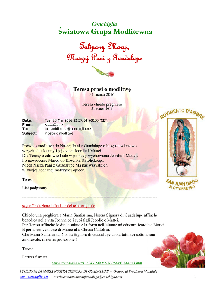 Conchiglia Światowa Grupa Modlitewna Tulipany Maryi, Naszej Pani z Guadalupe Teresa prosi o modlitwę 31 marca 2016 Teresa chiede preghiere 31 marzo 2016 Date: From: To: Subject: Tue, 23 Mar 2016 22:37:54 +0100 (CET) <……@....> [email protected] Prosba o modlitwe Prosze o modlitwe do Naszej Pani z Guadalupe o blogoslawienstwo w zyciu dla Joanny I jej dzieci Jeordie I Mattei. Dla Teresy o zdrowie I sile w pomocy wychowania Jeordie I Mattei. I o nawrocenie Marco do Kosciola Katolickiego. Niech Nasza Pani z Guadalupe Ma nas wszystkich w swojej kochanej matczynej opiece. Teresa List podpisany -----------------------------------------------------------------------------------------------segue Traduzione in Italiano del testo originale Chiedo una preghiera a Maria Santissima, Nostra Signora di Guadalupe affinché benedica nella vita Joanna ed i suoi figli Jeordie e Mattei. Per Teresa affinché le dia la salute e la forza nell’aiutare ad educare Jeordie e Mattei. E per la conversione di Marco alla Chiesa Cattolica. Che Maria Santissima, Nostra Signora di Guadalupe abbia tutti noi sotto la sua amorevole, materna protezione ! Teresa Lettera firmata www.conchiglia.us/I_TULIPANI/TULIPANY_MARYI.htm I TULIPANI DI MARIA NOSTRA SIGNORA DI GUADALUPE - Gruppo di Preghiera Mondiale www.conchiglia.net [email protected] 1 Modlitwa Różańcowa Conchiglii oraz braci i sióstr z ruchu Movimento d’Amore San Juan Diego do Najświętszej Maryi Panny, Naszej Pani z Guadalupe za: Teresę, Joannę, Jeordie, Mattei, Marco - Polska Najświętsza Maryjo Panno, Nasza Pani z Guadalupe, jako córka proszę Cię o Łaskę wysłuchania świętych próśb Teresy, Joanny, Jeordie, Mattei, Marco za ich rodzinę, ażeby mogli otrzymać duchowe pocieszenie, które jest im potrzebne, i, jeśli jest to zgodne z Wolą Bożą, Łaskę, o którą prosi Najświętsza Maryja Panna, Nasza Pani z Guadalupe. Łączę się z pozostałymi Twoimi dziećmi, a moimi braćmi z ruchu Movimento d’Amore San Juan Diego, aby błagać Cię z miłością o wstawienie się u Twojego Syna Jezusa, ażeby otrzymana Łaska była przykładem dla wielu braci, aby zawsze znaleźli siłę, by walczyć i mieć nadzieję na Chwałę Boga Ojca. Najświętsza Maryjo Panno, Nasza Pani z Guadalupe, razem z Jezusem pobłogosław Teresę, Joannę, Jeordie, Mattei, Marco i ich rodzinę, a ja, Conchiglia, i moi bracia z ruchu Movimento d’Amore San Juan Diego przyłączamy się pokornie do Waszego Błogosławieństwa w Imię Ojca Matki Syna i Ducha Świętego. Amen Bracia i siostry z ruchu Movimento d’Amore San Juan Diego i… Conchiglia I TULIPANI DI MARIA NOSTRA SIGNORA DI GUADALUPE - Gruppo di Preghiera Mondiale www.conchiglia.net [email protected] 2 La preghiera del Rosario di Conchiglia e dei fratelli e delle sorelle del Movimento d’Amore San Juan Diego a Maria Santissima, Nostra Signora di Guadalupe per: Teresa, Joanna, Jeordie, Mattei e Marco - Polonia Maria Santissima, Nostra Signora di Guadalupe, come figlia ti chiedo la Grazia di esaudire le sante richieste di Teresa per la sua famiglia, Joanna, Jeordie, Mattei e Marco, affinché possano ottenere il conforto spirituale che serve loro e, se è nella Volontà di Dio, la Grazia richiesta da parte di Maria Santissima, Nostra Signora di Guadalupe. Mi unisco ad altri tuoi figli e miei fratelli del Movimento d’Amore San Juan Diego per supplicarti con amore di intercedere presso Tuo Figlio Gesù, affinché la Grazia ottenuta sia di esempio a tanti fratelli, affinché trovino sempre la forza di lottare e di sperare a Gloria di Dio Padre. Maria Santissima Nostra Signora di Guadalupe, assieme a Gesù benedici Teresa, Joanna, Jeordie, Mattei e Marco e la loro famiglia ed io Conchiglia e i miei fratelli del Movimento d’Amore San Juan Diego ci uniamo umilmente alla Vostra Benedizione nel Nome del Padre della Madre del Figlio e dello Spirito Santo. Amen I fratelli e le sorelle del Movimento d’Amore San Juan Diego e… Conchiglia I TULIPANI DI MARIA NOSTRA SIGNORA DI GUADALUPE - Gruppo di Preghiera Mondiale www.conchiglia.net [email protected] 3