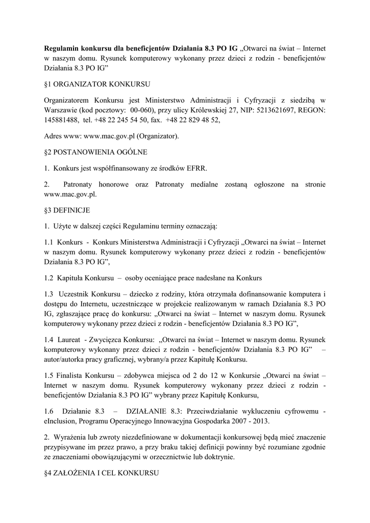 Regulamin konkursu dla beneficjentów Działania 8.3 PO IG „Otwarci na świat – Internet w naszym domu. Rysunek komputerowy wykonany przez dzieci z rodzin - beneficjentów Działania 8.3 PO IG” §1 ORGANIZATOR KONKURSU Organizatorem Konkursu jest Ministerstwo Administracji i Cyfryzacji z siedzibą w Warszawie (kod pocztowy: 00-060), przy ulicy Królewskiej 27, NIP: 5213621697, REGON: 145881488, tel. +48 22 245 54 50, fax. +48 22 829 48 52, Adres www: www.mac.gov.pl (Organizator). §2 POSTANOWIENIA OGÓLNE 1. Konkurs jest współfinansowany ze środków EFRR. 2. Patronaty honorowe oraz Patronaty medialne zostaną ogłoszone na stronie www.mac.gov.pl. §3 DEFINICJE 1. Użyte w dalszej części Regulaminu terminy oznaczają: 1.1 Konkurs - Konkurs Ministerstwa Administracji i Cyfryzacji „Otwarci na świat – Internet w naszym domu. Rysunek komputerowy wykonany przez dzieci z rodzin - beneficjentów Działania 8.3 PO IG”, 1.2 Kapituła Konkursu – osoby oceniające prace nadesłane na Konkurs 1.3 Uczestnik Konkursu – dziecko z rodziny, która otrzymała dofinansowanie komputera i dostępu do Internetu, uczestniczące w projekcie realizowanym w ramach Działania 8.3 PO IG, zgłaszające pracę do konkursu: „Otwarci na świat – Internet w naszym domu. Rysunek komputerowy wykonany przez dzieci z rodzin - beneficjentów Działania 8.3 PO IG”, 1.4 Laureat - Zwycięzca Konkursu: „Otwarci na świat – Internet w naszym domu. Rysunek komputerowy wykonany przez dzieci z rodzin - beneficjentów Działania 8.3 PO IG” – autor/autorka pracy graficznej, wybrany/a przez Kapitułę Konkursu. 1.5 Finalista Konkursu – zdobywca miejsca od 2 do 12 w Konkursie „Otwarci na świat – Internet w naszym domu. Rysunek komputerowy wykonany przez dzieci z rodzin beneficjentów Działania 8.3 PO IG” wybrany przez Kapitułę Konkursu, 1.6 Działanie 8.3 – DZIAŁANIE 8.3: Przeciwdziałanie wykluczeniu cyfrowemu eInclusion, Programu Operacyjnego Innowacyjna Gospodarka 2007 - 2013. 2. Wyrażenia lub zwroty niezdefiniowane w dokumentacji konkursowej będą mieć znaczenie przypisywane im przez prawo, a przy braku takiej definicji powinny być rozumiane zgodnie ze znaczeniami obowiązującymi w orzecznictwie lub doktrynie. §4 ZAŁOŻENIA I CEL KONKURSU 1. Konkurs ma na celu promocję Działania 8.3 PO IG poprzez uhonorowanie najciekawszych prac graficznych wykonanych przez dzieci z rodzin uczestniczących w projektach w ramach w/w działania. §5 UCZESTNICY KONKURSU 1. W konkursie „Otwarci na świat – Internet w naszym domu. Rysunek komputerowy wykonany przez dzieci z rodzin - beneficjentów Działania 8.3 PO IG” mogą wziąć udział dzieci w wieku 7 – 12 lat z rodzin, które otrzymały dofinansowanie do komputera i dostępu do Internetu, uczestniczące w projekcie realizowanym w ramach Działania 8.3 PO IG. §6 WARUNKI UDZIAŁU W KONKURSIE 1. Konkurs jest jednoetapowy. 2. Warunkiem udziału w Konkursie „Otwarci na świat – Internet w naszym domu. Rysunek komputerowy wykonany przez dzieci z rodzin - beneficjentów Działania 8.3 PO IG” jest przesłanie drogą elektroniczną przez pliku graficznego w formacie .jpg, .ttf, .bmp, .dib, .gif, .png nie większym niż 2,5 MB, związanego tematycznie z treścią konkursu, w terminie do 24 listopada 2013 roku do godziny 16:00 na adres e-mail: [email protected] lub [email protected]. W mailu zawierającym plik graficzny należy podać imię, nazwisko oraz wiek autora pracy a także imię, nazwisko oraz dane adresowe opiekuna prawnego reprezentującego autora pracy. Osoby reprezentujące autorów nagrodzonych prac zostaną przez Organizatora poproszone o podpisanie oświadczenie o uczestnictwie w projekcie w ramach Działania 8.3 PO IG oraz oświadczenia na potrzeby praw autorskich. Brak zgody na podpisanie ww. dokumentów uniemożliwia otrzymanie nagrody. 3. Kapituła Konkursu z nadesłanych zgłoszeń od Uczestników Konkursu „Otwarci na świat – Internet w naszym domu. Rysunek komputerowy wykonany przez dzieci z rodzin beneficjentów Działania 8.3 PO IG” wybierze 12 najlepszych prac. 5. Prace należy przesłać za pomocą poczty elektronicznej na adres: [email protected] lub przemysł[email protected], wpisując w temacie wiadomości e-mail: „Otwarci na świat” lub „Internet w naszym domu”. 6. Jeden Uczestnik Konkursu „Otwarci na świat – Internet w naszym domu. Rysunek komputerowy wykonany przez dzieci z rodzin - beneficjentów Działania 8.3 PO IG” może przygotować tylko jedną pracę konkursową. W przypadku przesłania przez Uczestnika Konkursu kilku prac – żadna z nich nie zostanie przyjęta do Konkursu. 7. Prace konkursowe nadesłane po terminie nie będą rozpatrywane. §7 ZASADY WYBORU LAUREATA I FINALISTÓW KONKURSU 1. Spośród prac zgłoszonych do udziału w konkursie „Otwarci na świat – Internet w naszym domu. Rysunek komputerowy wykonany przez dzieci z rodzin - beneficjentów Działania 8.3 PO IG” Kapituła Konkursu wybierze 12 prac, wskazując jednocześnie Laureata konkursu oraz 11 Finalistów Konkursu. §8 KAPITUŁA KONKURSU 1. Prace konkursowe będą oceniane przez Kapitułę Konkursu. Skład Kapituły Konkursu zostanie ogłoszony na stronie internetowej www.mac.gov.pl. 2. Sekretariat Konkursu – pan Mariusz Dąbrowski, e-mail: [email protected] 3. Kapituła Konkursu przyzna 12 równorzędnych nagród: w tym 1 dla Laureata Konkursu oraz 11 dla Finalistów Konkursu. 4. Organizator może wykluczyć Uczestnika Konkursu z udziału w Konkursie w przypadku naruszenia postanowień niniejszego Regulaminu. 5. Organizator zastrzega sobie prawo dokonywania zmian w niniejszym Regulaminie oraz zawieszenia lub zakończenia Konkursu bez rozstrzygnięcia, w przypadku gdy prace konkursowe nie będą spełniały wymogów założonych przez Organizatora lub z innych przyczyn. 6. Wynik Konkursu jest ostateczny i nie podlega zaskarżeniu do sądu powszechnego. 7. Sekretariat Konkursu sporządzi protokó
