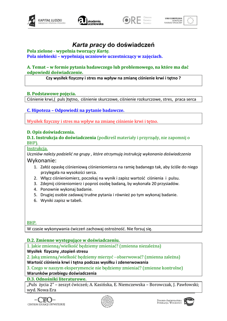 Karta pracy do doświadczeń Pola zielone - wypełnia tworzący Kartę. Pola niebieski – wypełniają uczniowie uczestniczący w zajęciach. A. Temat – w formie pytania badawczego lub problemowego, na które ma dać odpowiedź doświadczenie. Czy wysiłek fizyczny i stres ma wpływ na zmianę ciśnienie krwi i tętno ? B. Podstawowe pojęcia. Ciśnienie krwi,( puls )tętno, ciśnienie skurczowe, ciśnienie rozkurczowe, stres, praca serca C. Hipoteza – Odpowiedź na pytanie badawcze. Wysiłek fizyczny i stres ma wpływ na zmianę ciśnienie krwi i tętno. D. Opis doświadczenia. D.1. Instrukcja do doświadczenia (podkreśl materiały i przyrządy, nie zapomnij o BHP). Instrukcja. Uczniów należy podzielić na grupy , które otrzymują instrukcję wykonania doświadczenia Wykonanie: 1. Załóż opaskę ciśnieniową ciśnieniomierza na ramię badanego tak, aby ściśle do niego przylegała na wysokości serca. 2. Włącz ciśnieniomierz, poczekaj na wynik i zapisz wartość ciśnienia i pulsu. 3. Zdejmij ciśnieniomierz i poproś osobę badaną, by wykonała 20 przysiadów. 4. Ponownie wykonaj badanie. 5. Drugiej osobie zadawaj trudne pytania i również po tym wykonaj badanie. 6. Wyniki zapisz w tabeli. BHP. W czasie wykonywania ćwiczeń zachowaj ostrożność. Nie forsuj się. D.2. Zmienne występujące w doświadczeniu. 1. Jakie zmienną/wielkość będziemy zmieniać? (zmienna niezależna) Wysiłek fizyczny ,stopień stresu 2. Jaką zmienną/wielkość będziemy mierzyć - obserwować? (zmienna zależna) Wartość ciśnienia krwi i tętna podczas wysiłku i zdenerwowania 3. Czego w naszym eksperymencie nie będziemy zmieniać? (zmienne kontrolne) Warunków przebiegu doświadczenia D.3. Odnośniki literaturowe. „Puls życia 2” – zeszyt ćwiczeń; A. Kasińska, E. Niemczewska – Borowczak, J. Pawłowski; wyd. Nowa Era D.4. Uczniowska dokumentacja doświadczenie (wyniki pomiarów, tabelki, rysunki, obliczenia… ). WARTOŚĆ CIŚNIENIA OSOBA BADANA I BADANIE Przed wysiłkiem I stresem II BADANIE Po wysiłku I stresie Wysiłek fiz. 111/74 127/72 stres 115/75 142/80 WARTOŚĆ PULSU OSOBA BADANA I BADANIE Przed wysiłkiem I stresem II BADANIE Po wysiłku I stresie Wysiłek fiz. 64 78 stres 70 84 E. Wnioski z doświadczenia. Czy wyniki doświadczenia są zgodne z hipotezą? TAK X NIE Wypowiedź uzasadnij. Wyniki doświadczenia są zgodne z hipotezą. Wartość ciśnienia i tętna po wysiłku i zdenerwowaniu wzrosła F. Podsumowanie. Nauczyłam / Nauczyłem się, że: Wysiłek fizyczny i stres ma wpływ na pracę serca. Wybierz, co najmniej jedno ze zdań i dokończ je: Zaciekawiło mnie ………………………….. Udało mi się …wykonać zadanie………………………………. Chciałabym/ Chciałbym wiedzieć więcej …na temat prawidłowej pracy serca wpływu aktywności fizycznej na zdrowie.……………………………. Zauważyłem również ……………………………………… G. Praca domowa.