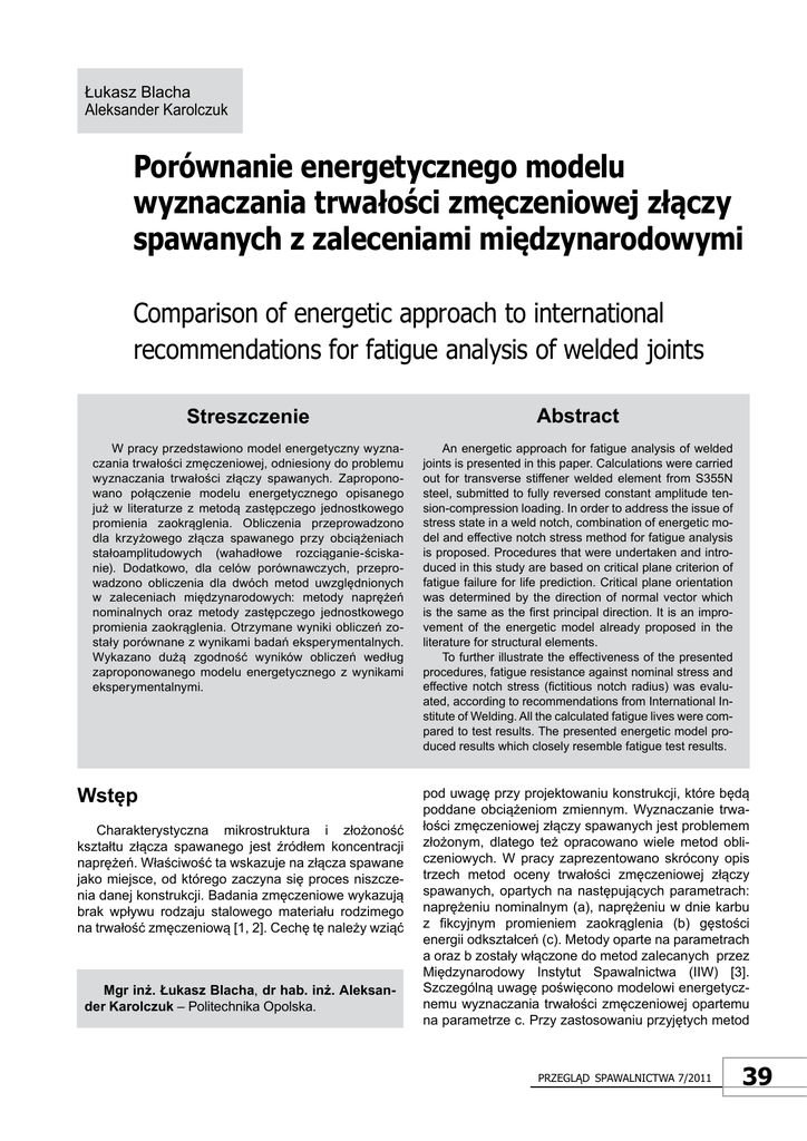 Łukasz Blacha Aleksander karolczuk Porównanie energetycznego modelu wyznaczania trwałości zmęczeniowej złączy spawanych z zaleceniami międzynarodowymi comparison of energetic approach to international recommendations for fatigue analysis of welded joints Streszczenie abstract W pracy przedstawiono model energetyczny wyznaczania trwałości zmęczeniowej, odniesiony do problemu wyznaczania trwałości złączy spawanych. Zaproponowano połączenie modelu energetycznego opisanego już w literaturze z metodą zastępczego jednostkowego promienia zaokrąglenia. obliczenia przeprowadzono dla krzyżowego złącza spawanego przy obciążeniach stałoamplitudowych (wahadłowe rozciąganie-ściskanie). Dodatkowo, dla celów porównawczych, przeprowadzono obliczenia dla dwóch metod uwzględnionych w zaleceniach międzynarodowych: metody naprężeń nominalnych oraz metody zastępczego jednostkowego promienia zaokrąglenia. otrzymane wyniki obliczeń zostały porównane z wynikami badań eksperymentalnych. Wykazano dużą zgodność wyników obliczeń według zaproponowanego modelu energetycznego z wynikami eksperymentalnymi. An energetic approach for fatigue analysis of welded joints is presented in this paper. Calculations were carried out for transverse stiffener welded element from S355N steel, submitted to fully reversed constant amplitude tension-compression loading. In order to address the issue of stress state in a weld notch, combination of energetic model and effective notch stress method for fatigue analysis is proposed. Procedures that were undertaken and introduced in this study are based on critical plane criterion of fatigue failure for life prediction. Critical plane orientation was determined by the direction of normal vector which is the same as the first principal direction. It is an improvement of the energetic model already proposed in the literature for structural elements. To further illustrate the effectiveness of the presented procedures, fatigue resistance against nominal stress and effective notch stress (fictitious notch radius) was evaluated, according to recommendations from International Institute of Welding. All the calculated fatigue lives were compared to test results. The presented energetic model produced results which closely resemble fatigue test results. Wstęp Charakterystyczna mikrostruktura i złożoność kształtu złącza spawanego jest źródłem koncentracji naprężeń. Właściwość ta wskazuje na złącza spawane jako miejsce, od którego zaczyna się proces niszczenia danej konstrukcji. Badania zmęczeniowe wykazują brak wpływu rodzaju stalowego materiału rodzimego na trwałość zmęczeniową [1, 2]. Cechę tę należy wziąć Mgr inż. Łukasz Blacha, dr hab. inż. aleksander Karolczuk – Politechnika opolska. pod uwagę przy projektowaniu konstrukcji, które będą poddane obciążeniom zmiennym. Wyznaczanie trwałości zmęczeniowej złączy spawanych jest problemem złożonym, dlatego też opracowano wiele metod obliczeniowych. W pracy zaprezentowano skrócony opis trzech metod oceny trwałości zmęczeniowej złączy spawanych, opartych na następujących parametrach: naprężeniu nominalnym (a), naprężeniu w dnie karbu z fikcyjnym promieniem zaokrąglenia (b) gęstości energii odkształceń (c). Metody oparte na parametrach a oraz b zostały włączone do metod zalecanych przez Międzynarodowy Instytut Spawalnictwa (IIW) [3]. Szczególną uwagę poświęcono modelowi energetycznemu wyznaczania trwałości zmęczeniowej opartemu na parametrze c. Przy zastosowaniu przyjętych metod Przegląd sPawalnictwa 7/2011 39 Liczba cykli do zniszczenia Nf wg zaleceń IIW wyznacza się na podstawie zależności (1) przeprowadzono ocenę trwałości zmęczeniowej krzyżowego złącza spawanego (rys. 1) ze stali S355N (materiał rodzimy). otrzymane wyniki trwałości porównane zostały z wynikami badań eksperymentalnych [1]. Na rysunku 1 przedstawiono kształt elementu z badanym złączem spawanym. Element spawany poddany był rozciąganiu-ściskaniu o cyklu wahadłowym. Celem opracowania jest: przedstawienie metody oceny trwałości zmęczeniowej będącej połączeniem modelu energetycznego z metodą promienia fikcyjnego, zastosowanie modelu energetycznego do wyznaczania trwałości zmęczeniowej krzyżowego złącza spawanego i porównanie tak wyznaczonej trwałości z wynikami badań eksperymentalnych oraz z trwałością obliczeniową wyznaczoną zgodnie z zaleceniami Międzynarodowego Instytutu Spawalnictwa. Trwałość zmęczeniowa wyznaczona w ten sposób w założeniach IIW charakteryzuje się prawdopodobieństwem zniszczenia na poziomie pięciu procent (pf = 5%). W zaleceniach IIW [3] charakterystyki zmęczeniowe do zakresu 107 cykli w większości przypadków mają nachylenie (współczynnik kierunkowy) m = 3, przy czym górnym ograniczeniem jest charakterystyka zmęczeniowa materiału rodzimego. Do zastosowań gigacyklowych (zakres od 107 cykli) przyjmuje się nachylenie charakterystyk zmęczeniowych przy m = 22. Do elementów walcowanych lub wyciskanych, elementów z krawędziami obrobionymi oraz bezszwowych elementów drążonych przypisane są wartości m = 5 (do zakresu 108 cykli, przy ograniczeniu jw.) i m = 22 (zastosowania gigacyklowe, zakres od 108 cykli). Szczegółowe omówienie zagadnień związanych z zastosowaniem metody naprężeń nominalnych wg IIW zamieszczono w pracy [6], natomiast trudności dotyczące doboru odpowiedniej klasy zmęczeniowej opisane są w [7]. Metoda naprężeń nominalnych pozwala na szybką ocenę trwałości zmęczeniowej złączy spawanych występujących w sklasyfikowanych elementach spawanych. Metoda naprężeń nominalnych Metoda promienia fikcyjnego Metoda naprężeń nominalnych wymieniana jest w wielu zaleceniach międzynarodowych, między innymi w zaleceniach Międzynarodowego Instytutu Spawalnictwa [3], normach europejskich [4] oraz normach japońskich [5]. ocena trwałości zmę