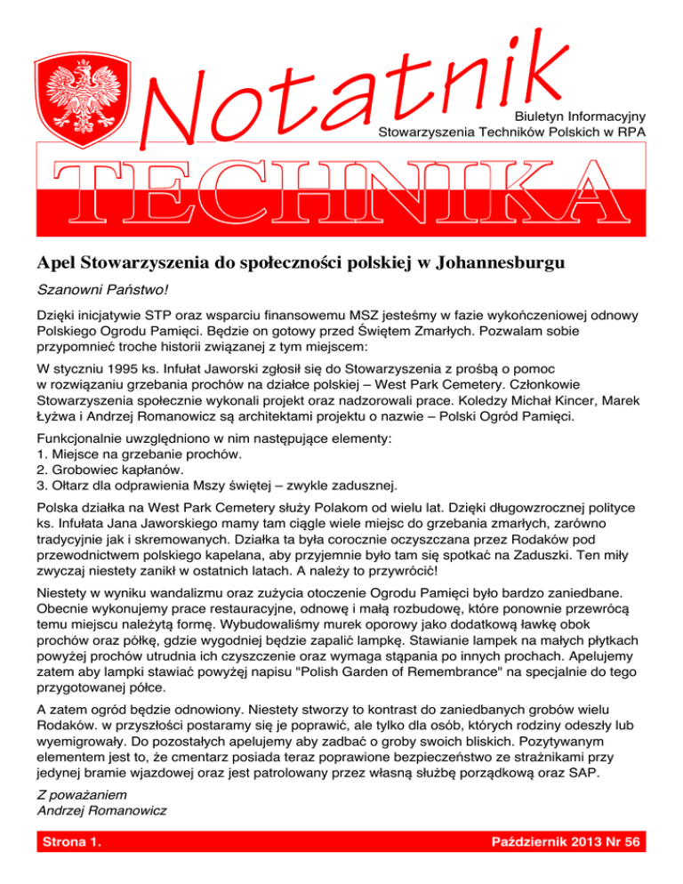 Biuletyn Informacyjny Stowarzyszenia Techników Polskich w RPA TECHNIKA Apel Stowarzyszenia do spo eczności polskiej w Johannesburgu Szanowni Państwo! Dzie˛ki inicjatywie STP oraz wsparciu finansowemu MSZ jesteśmy w fazie wykończeniowej odnowy Polskiego Ogrodu Pamie˛ci. Be˛dzie on gotowy przed Świe˛tem Zmarłych. Pozwalam sobie przypomnieć troche historii zwia˛zanej z tym miejscem: W styczniu 1995 ks. Infułat Jaworski zgłosił sie˛ do Stowarzyszenia z prośba˛ o pomoc w rozwia˛zaniu grzebania prochów na działce polskiej – West Park Cemetery. Członkowie Stowarzyszenia społecznie wykonali projekt oraz nadzorowali prace. Koledzy Michał Kincer, Marek Łyżwa i Andrzej Romanowicz sa˛ architektami projektu o nazwie – Polski Ogród Pamie˛ci. Funkcjonalnie uwzgle˛dniono w nim naste˛puja˛ce elementy: 1. Miejsce na grzebanie prochów. 2. Grobowiec kapłanów. 3. Ołtarz dla odprawienia Mszy świe˛tej – zwykle zadusznej. Polska działka na West Park Cemetery służy Polakom od wielu lat. Dzie˛ki długowzrocznej polityce ks. Infułata Jana Jaworskiego mamy tam cia˛gle wiele miejsc do grzebania zmarłych, zarówno tradycyjnie jak i skremowanych. Działka ta była corocznie oczyszczana przez Rodaków pod przewodnictwem polskiego kapelana, aby przyjemnie było tam sie˛ spotkać na Zaduszki. Ten miły zwyczaj niestety zanikł w ostatnich latach. A należy to przywrócić! Niestety w wyniku wandalizmu oraz zużycia otoczenie Ogrodu Pamie˛ci było bardzo zaniedbane. Obecnie wykonujemy prace restauracyjne, odnowe˛ i mała˛ rozbudowe˛, które ponownie przewróca˛ temu miejscu należyta˛ forme˛. Wybudowaliśmy murek oporowy jako dodatkowa˛ ławke˛ obok prochów oraz półke˛, gdzie wygodniej be˛dzie zapalić lampke˛. Stawianie lampek na małych płytkach powyżej prochów utrudnia ich czyszczenie oraz wymaga sta˛pania po innych prochach. Apelujemy zatem aby lampki stawiać powyże˛j napisu "Polish Garden of Remembrance" na specjalnie do tego przygotowanej półce. A zatem ogród be˛dzie odnowiony. Niestety stworzy to kontrast do zaniedbanych grobów wielu Rodaków. w przyszłości postaramy sie˛ je poprawić, ale tylko dla osób, których rodziny odeszły lub wyemigrowały. Do pozostałych apelujemy aby zadbać o groby swoich bliskich. Pozytywanym elementem jest to, że cmentarz posiada teraz poprawione bezpieczeństwo ze strażnikami przy jedynej bramie wjazdowej oraz jest patrolowany przez własna˛ służbe˛ porza˛dkowa˛ oraz SAP. Z poważaniem Andrzej Romanowicz Strona 1. Październik 2013 Nr 56 Stefan Jan Olszewski 08/07/1927 – 15/10/2013 Stefan was born in Warsaw in a street named – Złota (in English – Golden). His father, Feliks, owned an electrical repair business, situated next door. His mother, Agnieszka (nee Świebodzińska), worked for the National Statistics Office and Film Agency. He finished primary school in Warsaw, and two years in the Marian Brothers’ Catholic School. World War II interrupted his regular schooling. During the German occupation, he attended acting and singing lessons in the Polish underground schools. As a young boy, he also distributed patriotic articles published by the forbidden press. Later he took part in various operations of the Polish Home Army during the Warsaw Uprising. He was injured during one of the actions, and received his first military decoration – the Cross of Valour. After capitulation he was a prisoner in a German camp Murnau VIIA. He was forced to do hard labour with a group of 50 fellow prisoners at Donauvort labour camp. The US Army liberated this camp, and able-bodied Polish prisoners were given uniforms and began work in the US Army support group. Subsequently, he was incorporated into II Corps Polish Army Panzer Regiment stationed in Italy, where he completed courses for drivers, gunners and radio operators. World War II was soon over. After demobilisation he arrived in Great Britain, where he helped Polish soldiers to be re-instated into civilian life, by translating and by finding work for them. When this work ended he joined the company Oliver in Croydon, repairing typing machines. This became his occupation for all of his working life. In England he took an enthusiastic part in activities of the Polish Combatants and other associations. He used his knowledge and talents to organise artistic performances. Strona 2. He also learned to sail and became the instructor of the younger generation. He attended Croydon Polytechnic and obtained a "National Certificate in Mechanical Engineering". One of his passions was ballroom dancing. While competing in England he met his future wife Mary, who was visiting from South Africa. Another meeting with the local director in 1955 resulted in his being offered work in a company in Johannesburg. His new South African adventure began after boarding "The Bloemfontein Castle" on the way to Cape Town. He "tied the knot" with Mary on 9 February 1957. This union brought them two children: son Neil and daughter Wanda. Regretfully a stray bullet killed Neil, while on leave from local army duties. This was a great tragedy for the Olszewski’s and the Polish Community. After arrival in Johannesburg he again embraced the life of Polish immigrants. Incidentally, the first Polish man whom he met was none other than Józek Piskorek, former soldier of the I-st Panzer Division of Gen. Maczek. Stefan worked as the manager of the Polish Club, took part in cultural life, fund raising for the Polish sisters and supported the Polish chaplains. With Mary, he won the local champions’ trophy in Samba and Tango. A highlight of his acting career was the play "The Flood" where he played the young son of the family, portrayed by Ania and Kocio Potocki. He was also a great supporter of Polish sport, fund raising with Henryk Nowacki, who was RSA champion in table tennis, as well as managing the local Polish football team. He was almost always a member of the Polish Combatant
