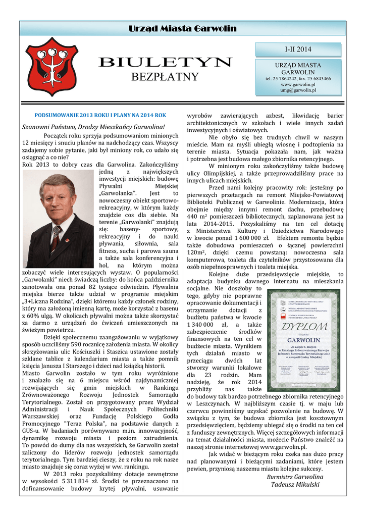 I-II 2014 BIULETYN BEZPŁATNY PODSUMOWANIE 2013 ROKU I PLANY NA 2014 ROK Szanowni Państwo, Drodzy Mieszkańcy Garwolina! Początek roku sprzyja podsumowaniom minionych 12 miesięcy i snuciu planów na nadchodzący czas. Wszyscy zadajemy sobie pytanie, jaki był miniony rok, co udało się osiągnąć a co nie? Rok 2013 to dobry czas dla Garwolina. Zakończyliśmy jedną z największych inwestycji miejskich: budowę Pływalni Miejskiej „Garwolanka”. Jest to nowoczesny obiekt sportoworekreacyjny, w którym każdy znajdzie cos dla siebie. Na terenie „Garwolanki” znajdują się: basenysportowy, rekreacyjny i do nauki pływania, siłownia, sala fitness, sucha i parowa sauna a także sala konferencyjna i hol, na którym można zobaczyć wiele interesujących wystaw. O popularności „Garwolanki” niech świadczą liczby: do końca października zanotowała ona ponad 82 tysiące odwiedzin. Pływalnia miejska bierze także udział w programie miejskim „3+Liczna Rodzina”, dzięki któremu każdy członek rodziny, który ma założoną imienną kartę, może korzystać z basenu z 60% ulgą. W okolicach pływalni można także skorzystać za darmo z urządzeń do ćwiczeń umieszczonych na świeżym powietrzu. Dzięki społecznemu zaangażowaniu w wyjątkowy sposób uczciliśmy 590 rocznicę założenia miasta. W okolicy skrzyżowania ulic Kościuszki i Staszica ustawione zostały szklane tablice z kalendarium miasta a także pomnik księcia Janusza I Starszego i dzieci nad książką historii. Miasto Garwolin zostało w tym roku wyróżnione i znalazło się na 6 miejscu wśród najdynamiczniej rozwijających się gmin miejskich w Rankingu Zrównoważonego Rozwoju Jednostek Samorządu Terytorialnego. Został on przygotowany przez Wydział Administracji i Nauk Społecznych Politechniki Warszawskiej oraz Fundację Polskiego Godła Promocyjnego "Teraz Polska", na podstawie danych z GUS-u. W badaniach porównywano m.in. innowacyjność, dynamikę rozwoju miasta i poziom zatrudnienia. To powód do dumy dla nas wszystkich, że Garwolin został zaliczony do liderów rozwoju jednostek samorządu terytorialnego. Tym bardziej cieszy, że z roku na rok nasze miasto znajduje się coraz wyżej w ww. rankingu. W 2013 roku pozyskaliśmy dotacje zewnętrzne w wysokości 5 311 814 zł. Środki te przeznaczono na dofinansowanie budowy krytej pływalni, usuwanie URZĄD MIASTA GARWOLIN tel. 25 7864242, fax. 25 6843466 www.garwolin.pl [email protected] wyrobów zawierających azbest, likwidację barier architektonicznych w szkołach i wiele innych zadań inwestycyjnych i oświatowych. Nie obyło się bez trudnych chwil w naszym mieście. Mam na myśli ubiegłą wiosnę i podtopienia na terenie miasta. Sytuacja pokazała nam, jak ważna i potrzebna jest budowa małego zbiornika retencyjnego. W minionym roku zakończyliśmy także budowę ulicy Olimpijskiej, a także przeprowadziliśmy prace na innych ulicach miejskich. Przed nami kolejny pracowity rok: jesteśmy po pierwszych przetargach na remont Miejsko-Powiatowej Biblioteki Publicznej w Garwolinie. Modernizacja, która obejmie między innymi remont dachu, przebudowę 440 m2 pomieszczeń bibliotecznych, zaplanowana jest na lata 2014-2015. Pozyskaliśmy na ten cel dotację z Ministerstwa Kultury i Dziedzictwa Narodowego w kwocie ponad 1 600 000 zł. Efektem remontu będzie także dobudowa pomieszczeń o łącznej powierzchni 120m2, dzięki czemu powstaną: nowoczesna sala komputerowa, toaleta dla czytelników przystosowana dla osób niepełnosprawnych i toaleta miejska. Kolejne duże przedsięwzięcie miejskie, to adaptacja budynku dawnego internatu na mieszkania socjalne. Nie doszłoby to tego, gdyby nie poprawne opracowanie dokumentacji i otrzymanie dotacji z budżetu państwa w kwocie 1 340 000 zł, a także zabezpieczenie środków finansowych na ten cel w budżecie miasta. Wynikiem tych działań miasto w przeciągu dwóch lat stworzy warunki lokalowe dla 23 rodzin. Mam nadzieję, że rok 2014 przybliży nas także do budowy tak bardzo potrzebnego zbiornika retencyjnego w Leszczynach. W najbliższym czasie tj. w maju lub czerwcu powinniśmy uzyskać pozwolenie na budowę. W związku z tym, że budowa zbiornika jest kosztownym przedsięwzięciem, będziemy ubiegać się o środki na ten cel z funduszy zewnętrznych. Więcej szczegółowych informacji na temat działalności miasta, możecie Państwo znaleźć na naszej stronie internetowej www.garwolin.pl. Jak widać w bieżącym roku czeka nas dużo pracy nad planowanymi i bieżącymi zadaniami, które jestem pewien, przyniosą naszemu miastu kolejne sukcesy. Burmistrz Garwolina Tadeusz Mikulski 2 Z OSTATNICH SESJI RADY MIASTA Ostatnia sesja Rady Miasta w roku 2013 odbyła się w dniu 30 grudnia. Rada Miasta podjęła uchwałę budżetową na rok 2014. Ogólna kwota dochodów na ten rok to 51 945 662 zł, w tym: dochody bieżące to 50 269 503 zł, a dochody majątkowe to 1 676 159 zł. Wydatki budżetu na 2014 rok zostały ustalone na kwotę 49 792 703 zł. Planowana nadwyżka w wysokości 2 152 959 to różnica między dochodami a wydatkami i zostanie ona przeznaczona w całości na spłatę zaciągniętych wcześniej zobowiązań. W budżecie na 2014 rok zaplanowano rezerwę ogólną w kwocie 90 000 zł, plan wydatków na inwestycje to 2 901 554 zł. Podczas sesji w dniu 27 stycznia br. Rada Miasta ponownie przeanalizowała potrzebę adaptacji dawnego budynku internatu na lokale socjalne i zaakceptowała źródła finansowania przedsięwzięcia. W wyniku podjętej uchwały o wprowadzeniu zmian do budżetu miasta na lata 2014-2015, zabezpieczono środki własne na ten cel, co umożliwia przyjęcie bezzwrotnej dotacji z Banku Gospodarstwa Krajowego i rozpoczęcie remontu. Zabezpieczono także 300 000 zł na wykup mieszkań na rynku wtórnym z przeznaczeniem na lokale socjalne. Na posiedzeniu przyjęto także uchwałę w wyniku której, Publiczne Przedszkole Nr 8 w Garwolinie przy ulicy II Armii Wo